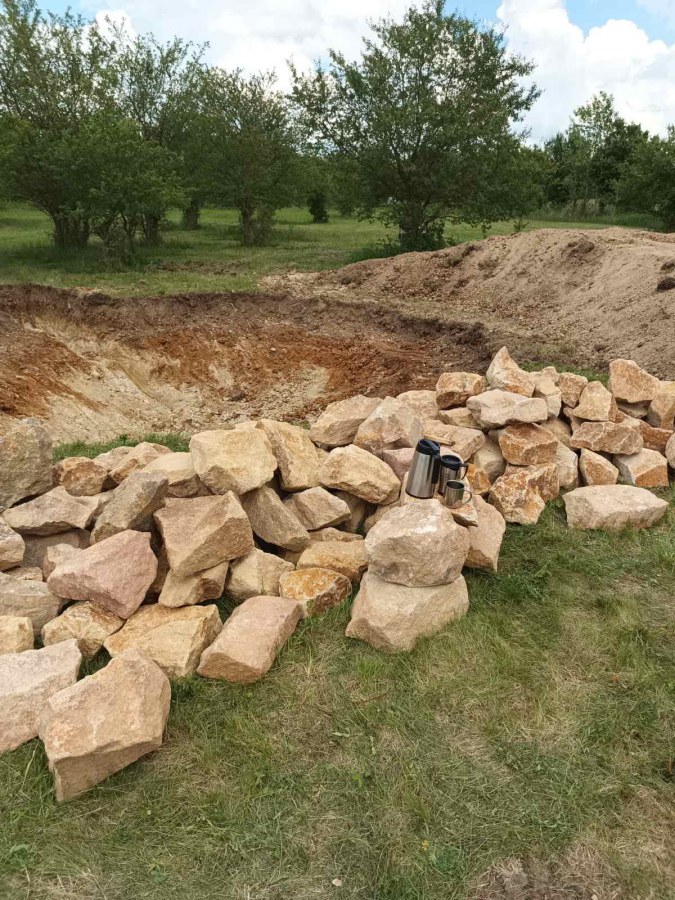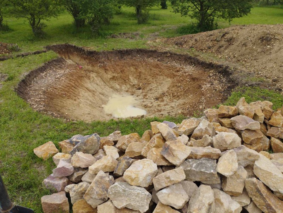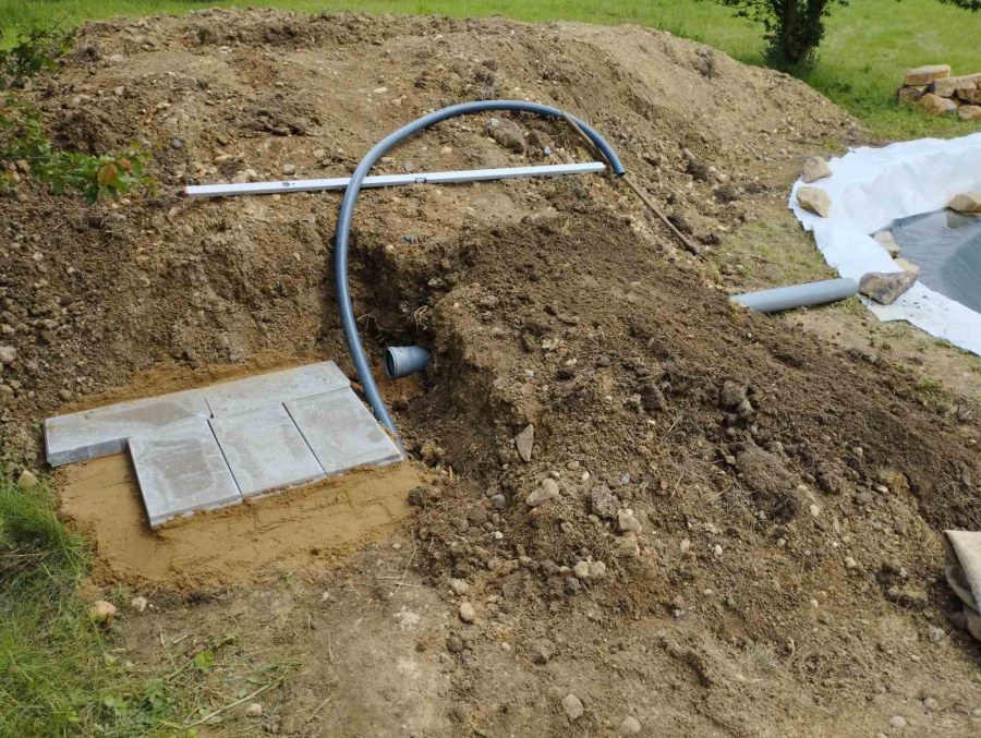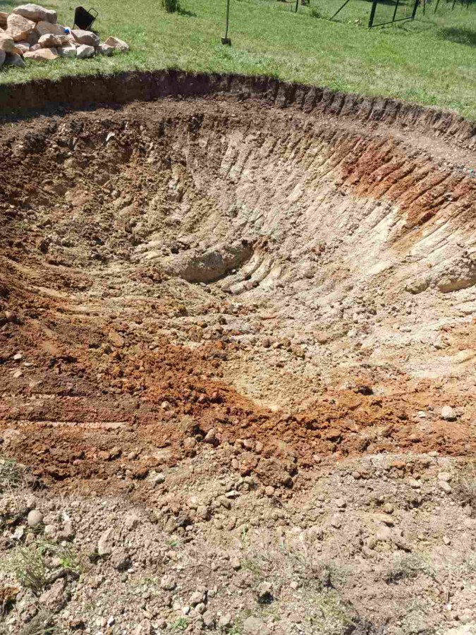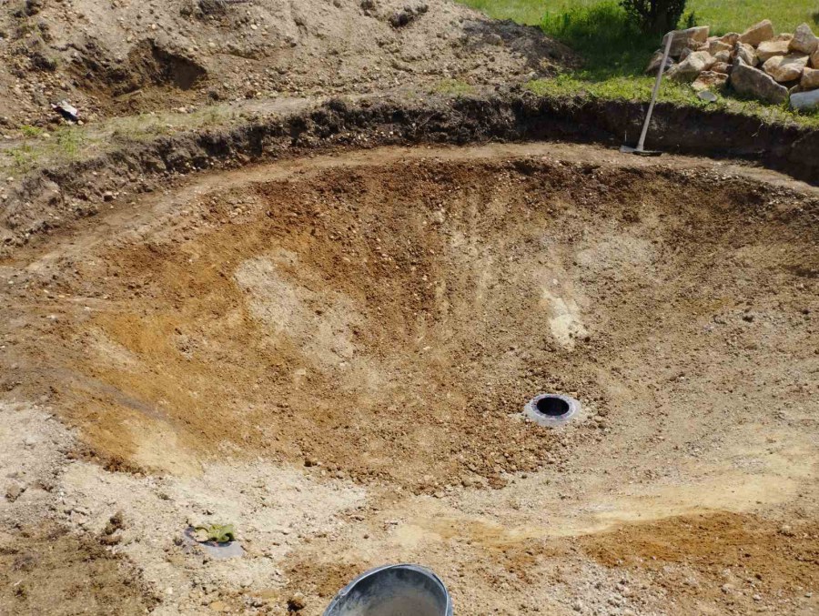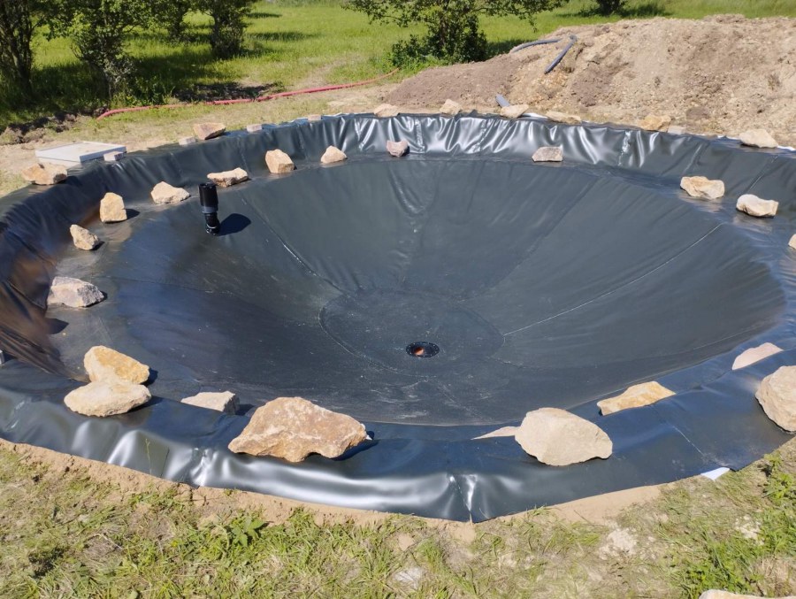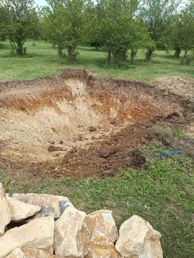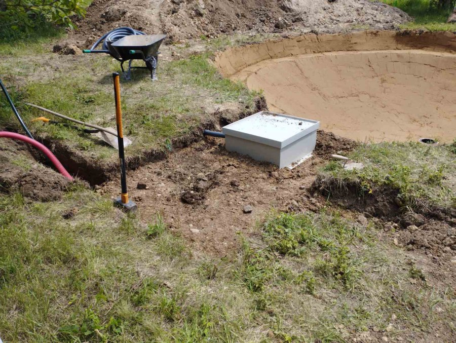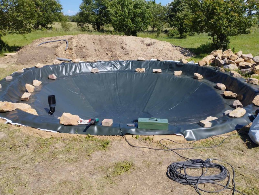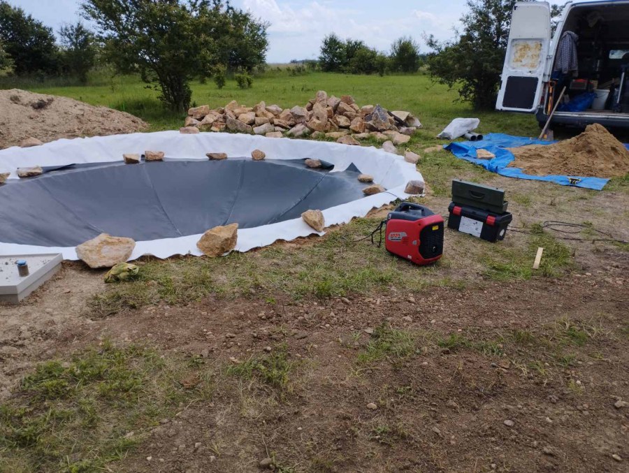 Toto jezírko uprostřed sadu jsme stavili na klíč jako překvapení pro partnerku. Začali jsme vytyčením tvaru jezírka a následně vybagrováním. Poté se ručně dotvarovali pobřežní zóny a dočistili hrany. Vykopal se základ pro čerpadlovou šachtu, vybetonoval se podklad, aby se šachta pod tíhou vody nepropadala. Na dno jezírka se položila gule, od ní se natáhlo potrubí k čerpadlové šachtě, stejně se postupovalo se skimmerem Oase Aquaskim Gravity, tam se připravila na stěnu fóliová příruba 63mm a od ní se opět vedlo potrubí k čerpadlové šachtě. Po těchto úpravách se celé jezírko pokrylo kopaným pískem, na něj se položila geotextílie 500g a pak se začala pokládat jezírková fólie Fatra Aquaplast 805/V olivově zelená. Když bylo vyfóliováno, položili se na pobřežní zóny kameny Kubo a zasadili květiny. Zatím co se napouštěla voda, technici zapojovali technologii. Vzhledem k místu a požadavkům na nenáročnost obsluhy jsme zvolili filtr Oase BioTec ScreenMatic2 90000 na něj jsme pověsili UV lampu Oase Bitron C 55W. Do čerpadlové šachty jsme zapojili čerpadlo AquaForte O-series 16000 které čerpá vodu z čerpadlové šachty do filtrace odkud následně vytéká čistá voda zpět do jezírka samospádem.