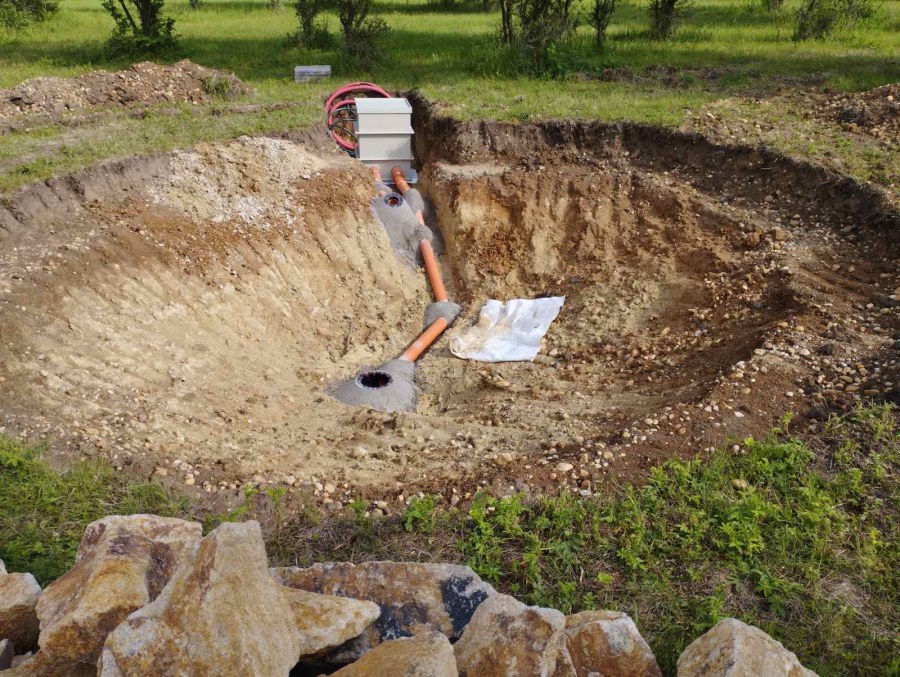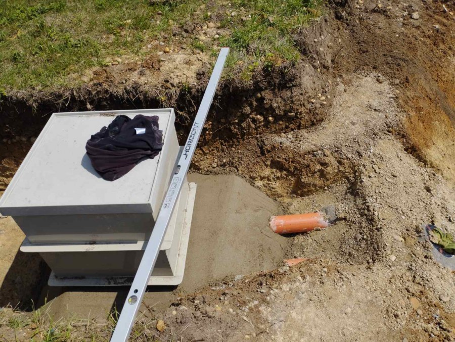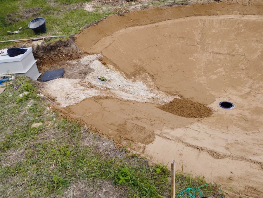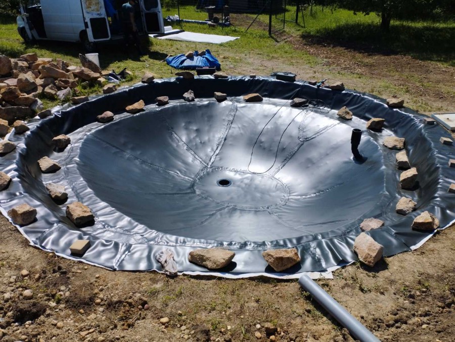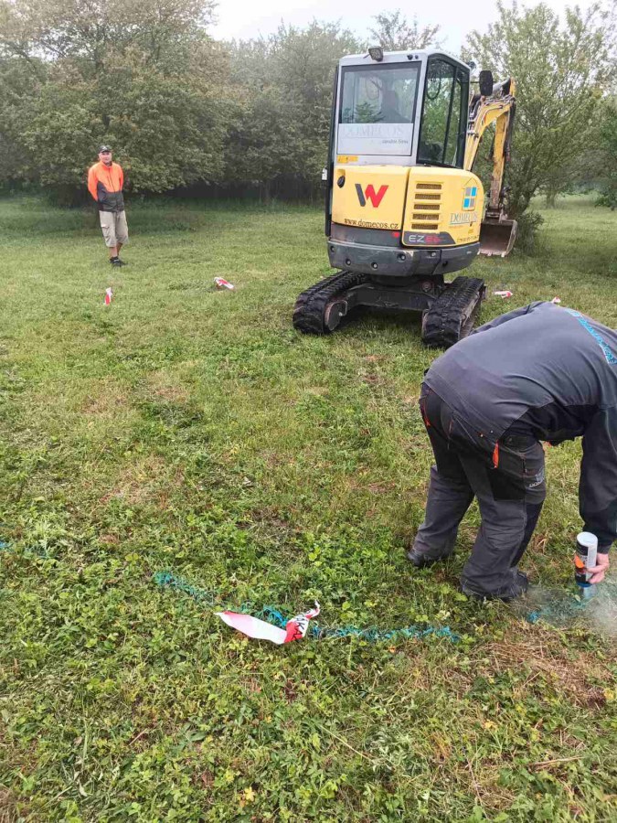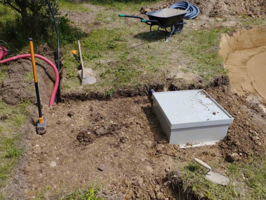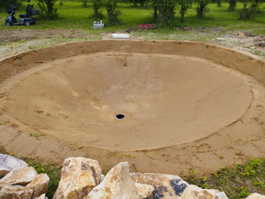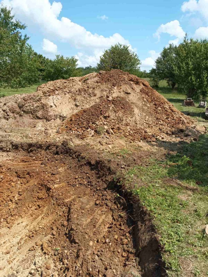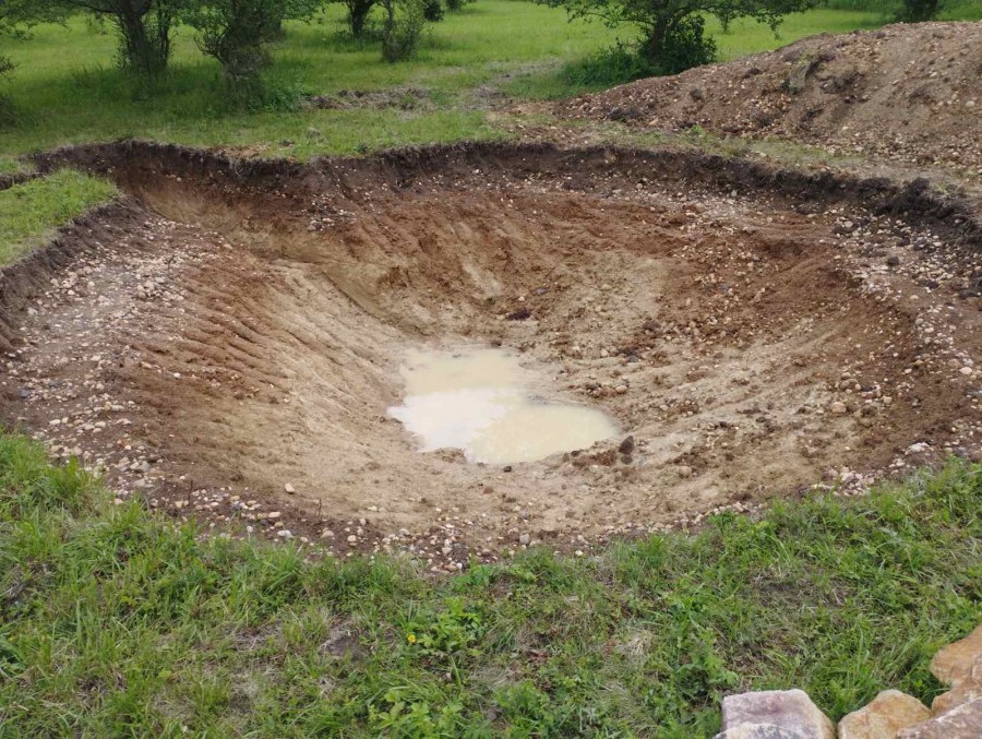 Toto jezírko uprostřed sadu jsme stavili na klíč jako překvapení pro partnerku. Začali jsme vytyčením tvaru jezírka a následně vybagrováním. Poté se ručně dotvarovali pobřežní zóny a dočistili hrany. Vykopal se základ pro čerpadlovou šachtu, vybetonoval se podklad, aby se šachta pod tíhou vody nepropadala. Na dno jezírka se položila gule, od ní se natáhlo potrubí k čerpadlové šachtě, stejně se postupovalo se skimmerem Oase Aquaskim Gravity, tam se připravila na stěnu fóliová příruba 63mm a od ní se opět vedlo potrubí k čerpadlové šachtě. Po těchto úpravách se celé jezírko pokrylo kopaným pískem, na něj se položila geotextílie 500g a pak se začala pokládat jezírková fólie Fatra Aquaplast 805/V olivově zelená. Když bylo vyfóliováno, položili se na pobřežní zóny kameny Kubo a zasadili květiny. Zatím co se napouštěla voda, technici zapojovali technologii. Vzhledem k místu a požadavkům na nenáročnost obsluhy jsme zvolili filtr Oase BioTec ScreenMatic2 90000 na něj jsme pověsili UV lampu Oase Bitron C 55W. Do čerpadlové šachty jsme zapojili čerpadlo AquaForte O-series 16000 které čerpá vodu z čerpadlové šachty do filtrace odkud následně vytéká čistá voda zpět do jezírka samospádem.