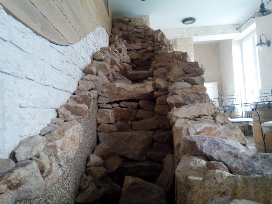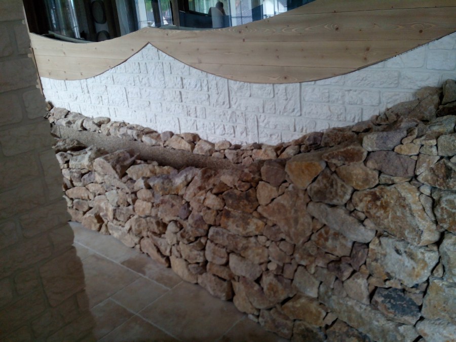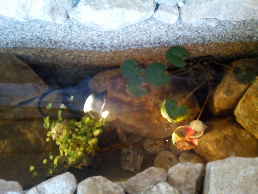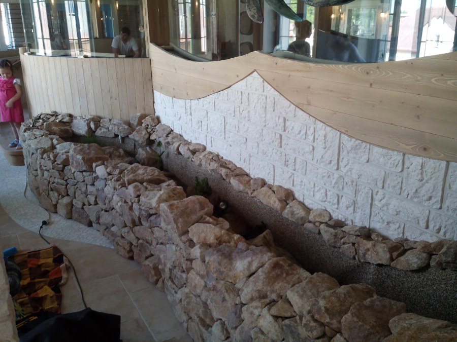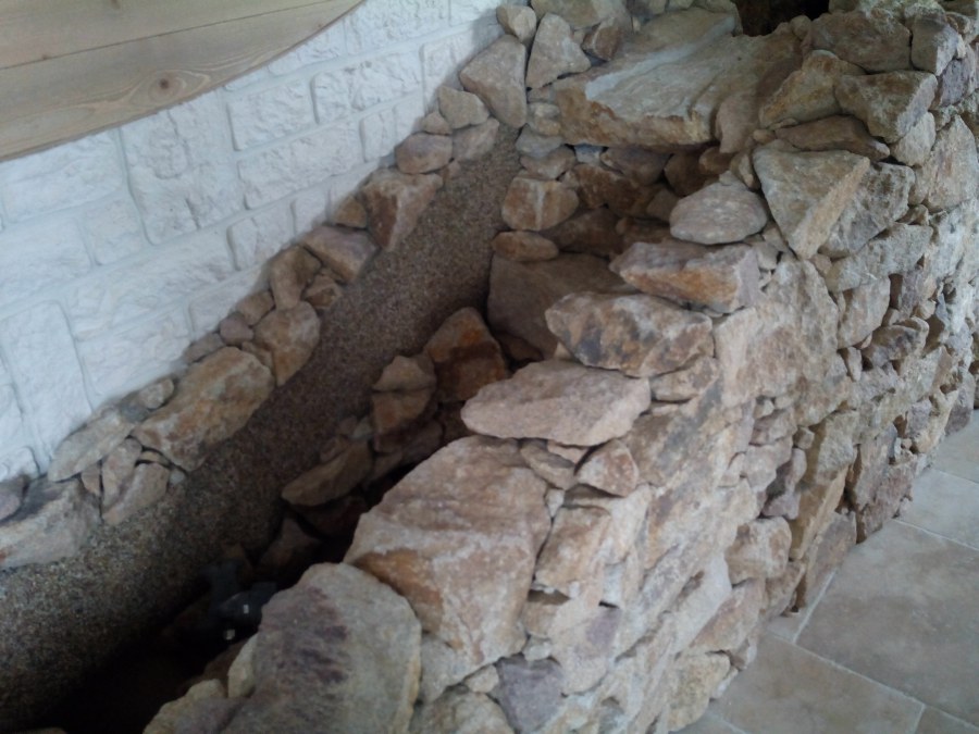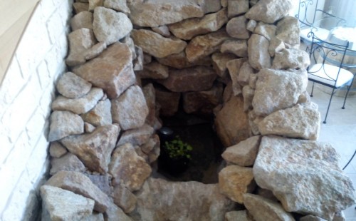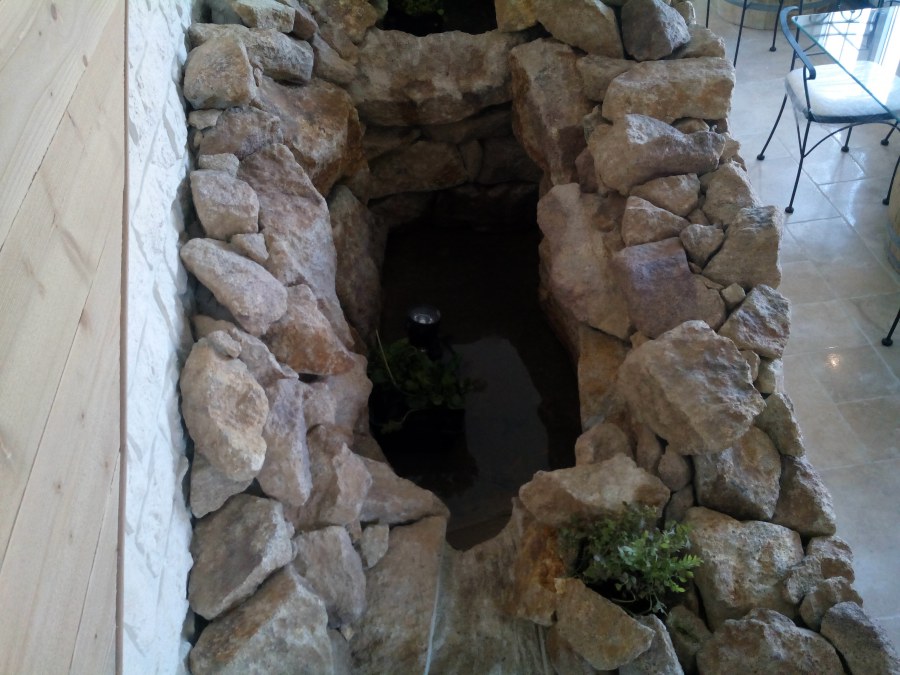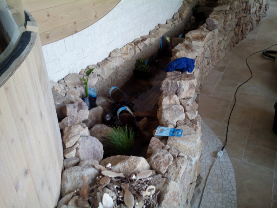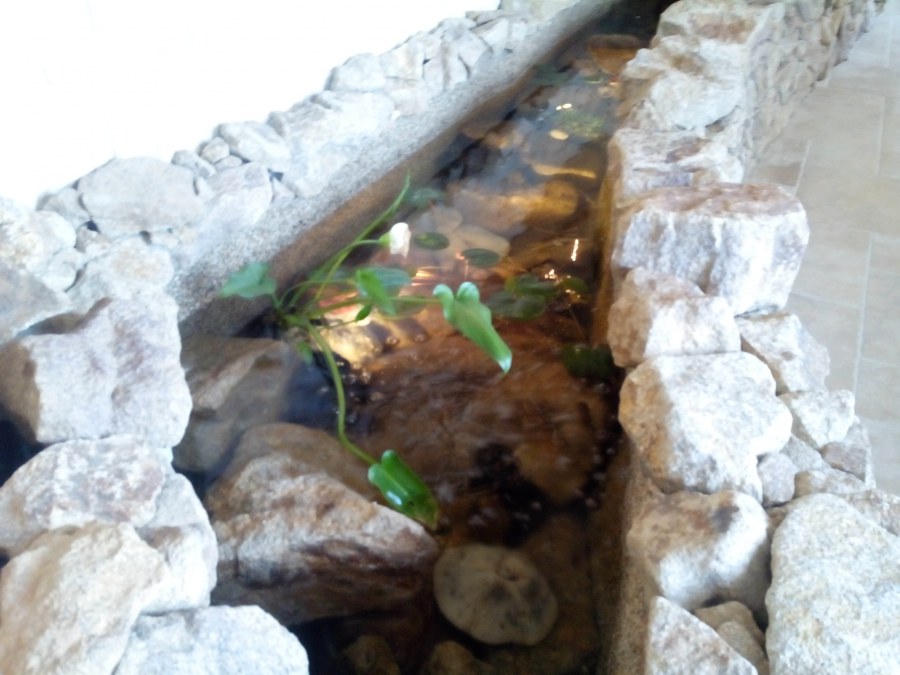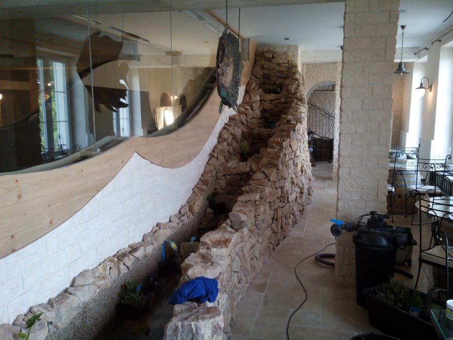 Velmi rádi jsme přijali nabídku na stavbu vodního prvku uvnitř restaurace. Těchto zakázek moc není a tak vždy rádi uvítáme změnu. Zákazník si vše vymyslel a postavil sám. Naše práce byla poradit, dozorovat, vyfóliovat vnitřek efektu a navrhnout vhodnou technologii, tak aby voda byla čistá. Nejprve jsme do koryta vložili geotextílii, poté navařili jezírkovou fólii Fatra Aquaplast 805/V, na tu pak nalepili kamínkovou fólii. V kaskádě jsme vytvořili pomocí kamenů tůňky, do kterých jsme osázeli živé květiny a dodali jezírková světla Oase LunAqua 3 set 3.