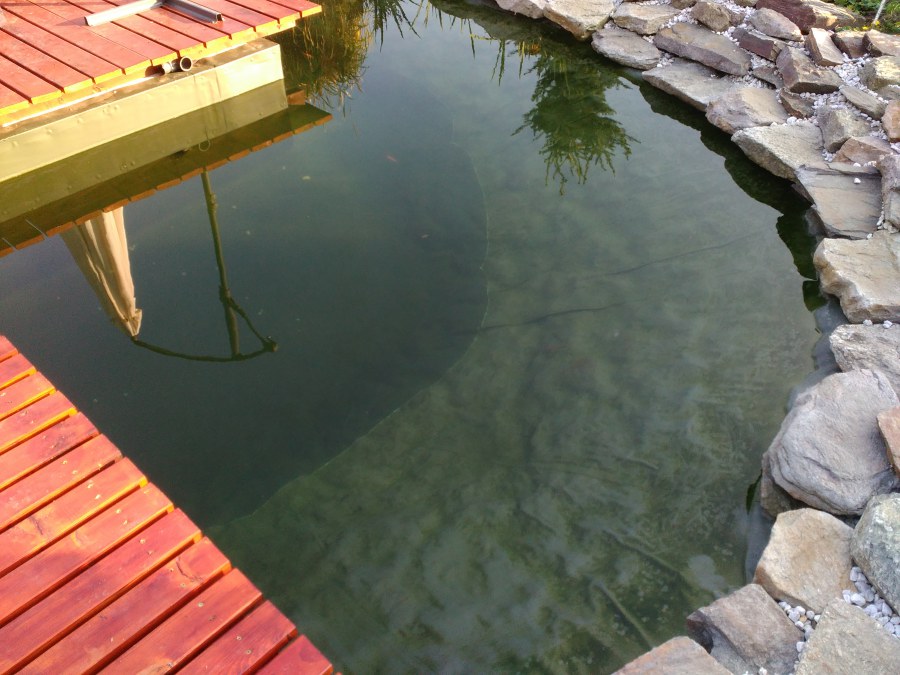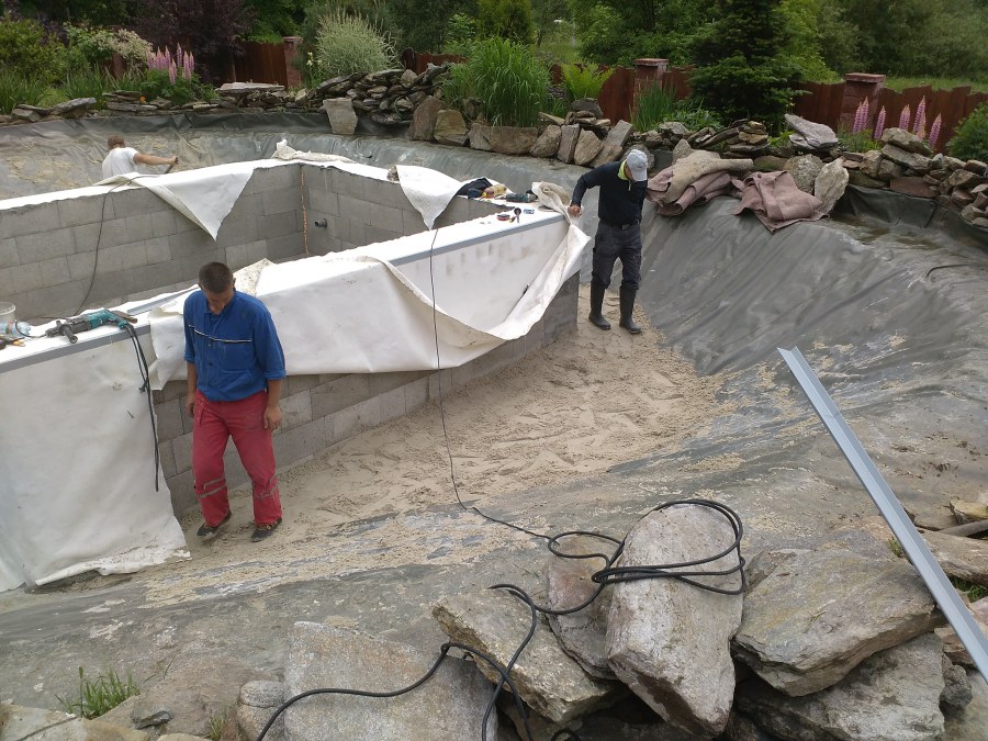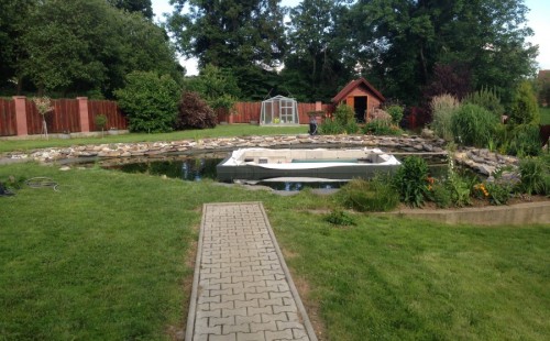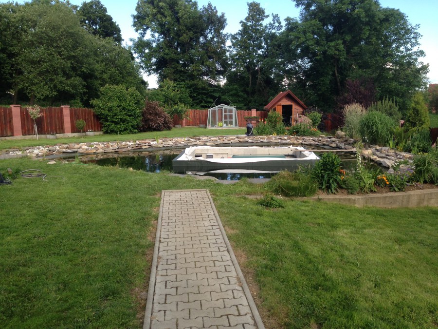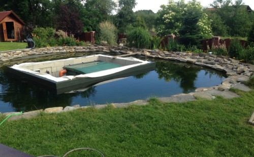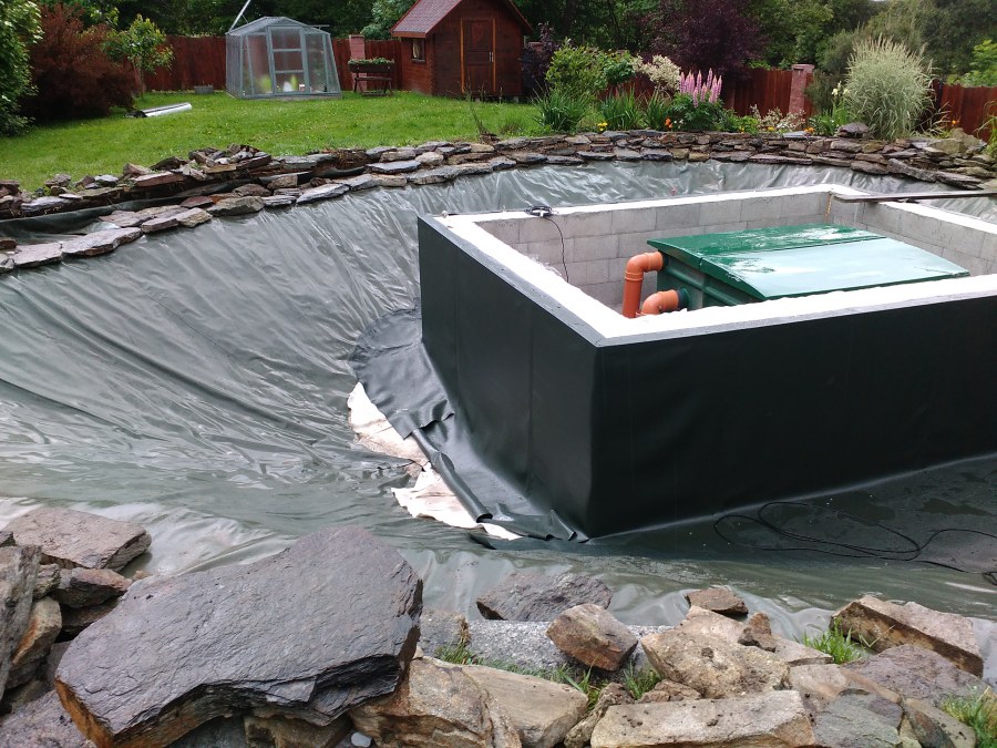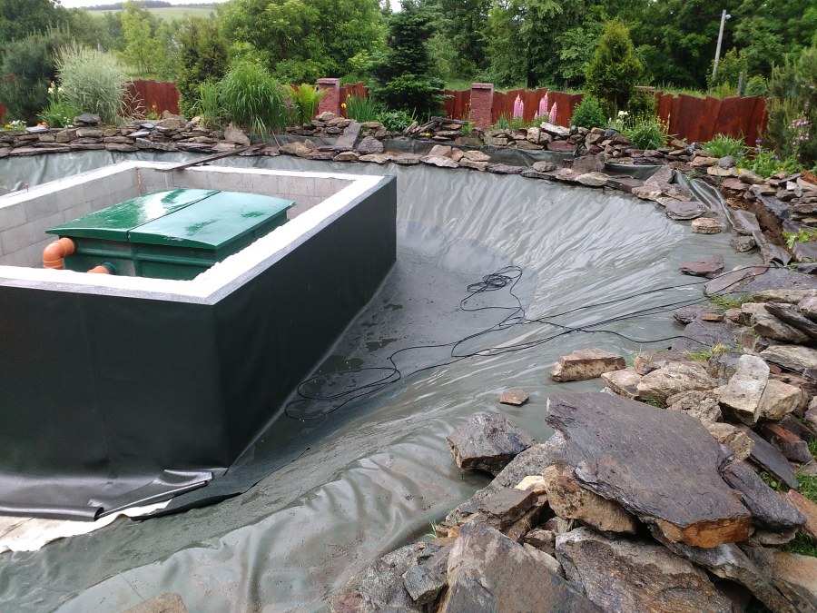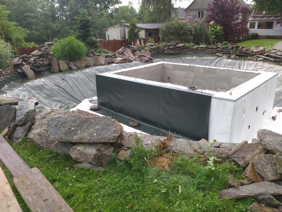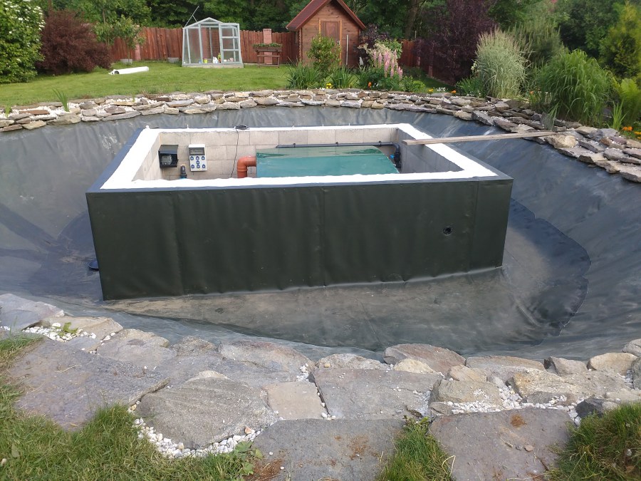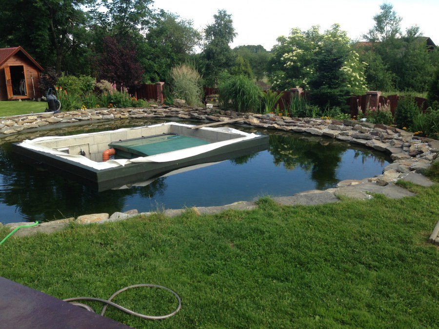 Toto jezírko v horách bylo pro nás výzva. Klientka nás oslovila s prosbou o pomoc, buď s novou, větší technologií, nebo s rekonstrukcí jezírka. Nakonec po pečlivé úvaze se obsah jezírka zmenšil výstavbou technické místnosti uprostřed jezírka, do které se usadí filtr a veškerá potřebná technika. Nejprve se muselo jezírko vypustit, ryby přelovit, fólii očistit. Uprostřed jezírka se fólie rozřízla do odpovídajícího tvaru, tam se postavila technická místnost ze ztraceného bednění. Do jedné zdi se zabudovala fóliová příruba pro skimmer Oase AquaSkim Gravity. Zdi se potáhli geotextílií 500g na hrany se přivrtali fóliové lišty a na ně se navařila jezírková fólie Fatra Aquaplast 805/V olivově zelená, ta se u dna napojila na stávající fólii. Touto stavbou jsme zmenšili obsah jezírka a zároveň vyřešili umístění technologie. Do technické místnosti se umístil mechanicko-biologický filtr Tripond Center Vortex C115, na něj se napojila UV lampa TMC Pro Clean 110W a čerpadlo Oase AquaMax Gravity Eco 20000. Klientka si poté již sama udělala na technické místnosti krásné posezení.
