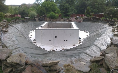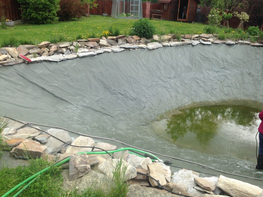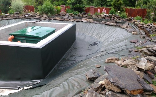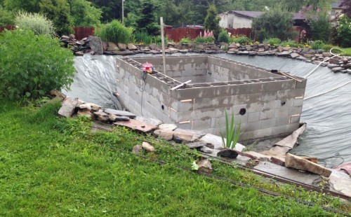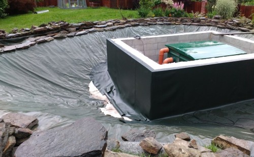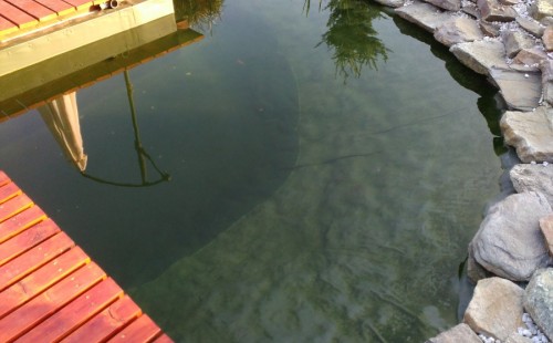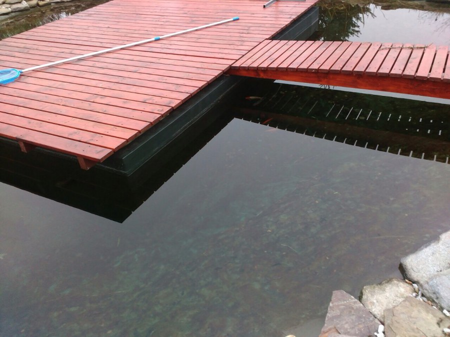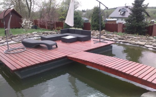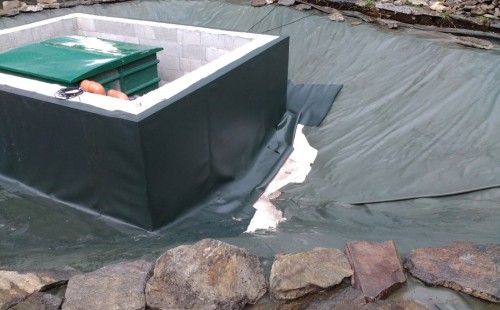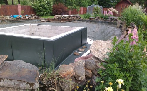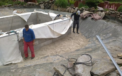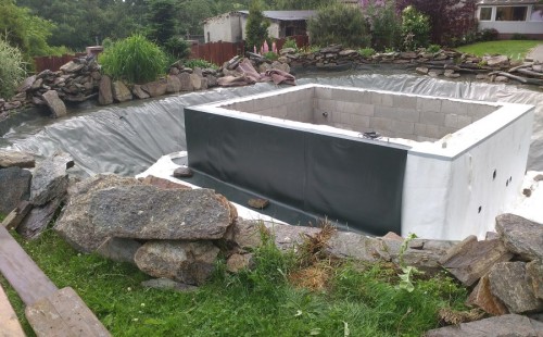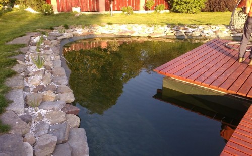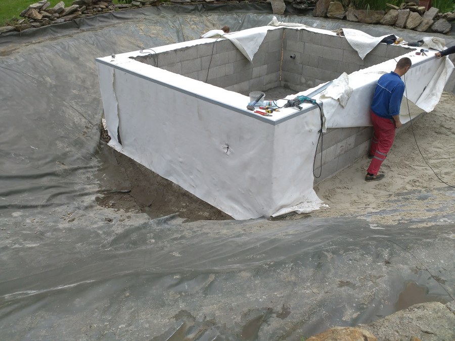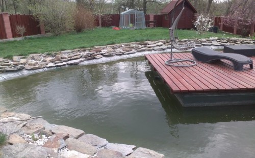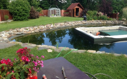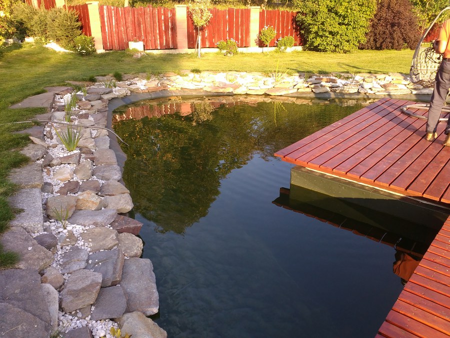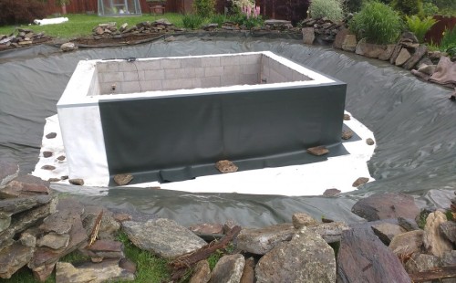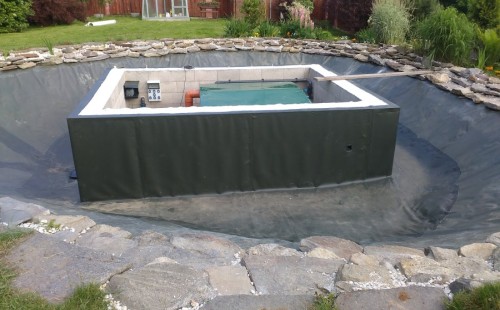Toto jezírko v horách bylo pro nás výzva. Klientka nás oslovila s prosbou o pomoc, buď s novou, větší technologií, nebo s rekonstrukcí jezírka. Nakonec po pečlivé úvaze se obsah jezírka zmenšil výstavbou technické místnosti uprostřed jezírka, do které se usadí filtr a veškerá potřebná technika. Nejprve se muselo jezírko vypustit, ryby přelovit, fólii očistit. Uprostřed jezírka se fólie rozřízla do odpovídajícího tvaru, tam se postavila technická místnost ze ztraceného bednění. Do jedné zdi se zabudovala fóliová příruba pro skimmer Oase AquaSkim Gravity. Zdi se potáhli geotextílií 500g na hrany se přivrtali fóliové lišty a na ně se navařila jezírková fólie Fatra Aquaplast 805/V olivově zelená, ta se u dna napojila na stávající fólii. Touto stavbou jsme zmenšili obsah jezírka a zároveň vyřešili umístění technologie. Do technické místnosti se umístil mechanicko-biologický filtr Tripond Center Vortex C115, na něj se napojila UV lampa TMC Pro Clean 110W a čerpadlo Oase AquaMax Gravity Eco 20000. Klientka si poté již sama udělala na technické místnosti krásné posezení.