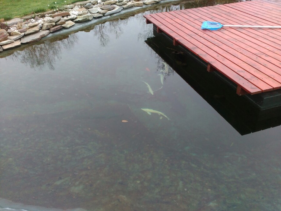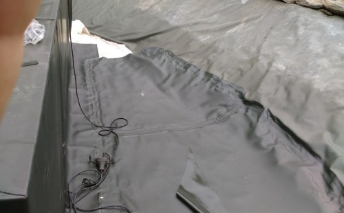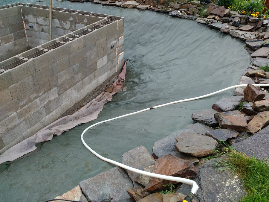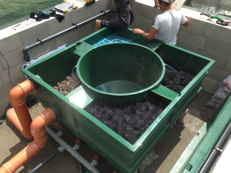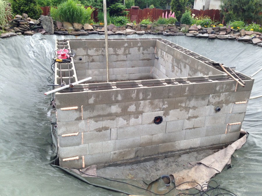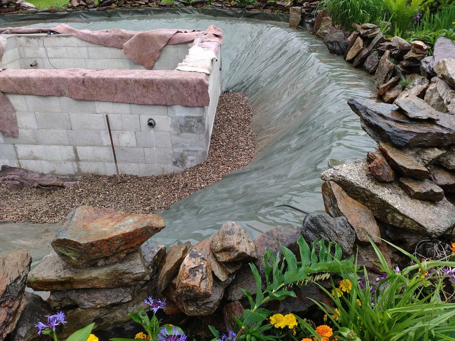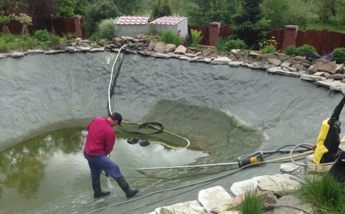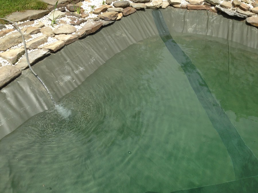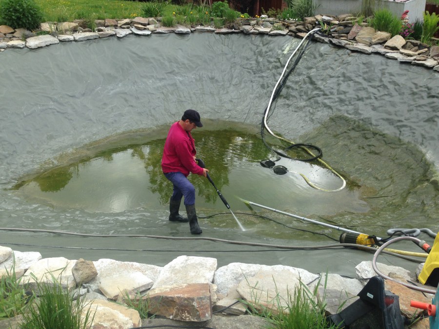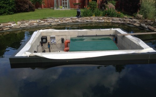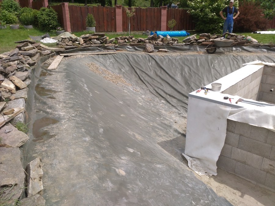 Toto jezírko v horách bylo pro nás výzva. Klientka nás oslovila s prosbou o pomoc, buď s novou, větší technologií, nebo s rekonstrukcí jezírka. Nakonec po pečlivé úvaze se obsah jezírka zmenšil výstavbou technické místnosti uprostřed jezírka, do které se usadí filtr a veškerá potřebná technika. Nejprve se muselo jezírko vypustit, ryby přelovit, fólii očistit. Uprostřed jezírka se fólie rozřízla do odpovídajícího tvaru, tam se postavila technická místnost ze ztraceného bednění. Do jedné zdi se zabudovala fóliová příruba pro skimmer Oase AquaSkim Gravity. Zdi se potáhli geotextílií 500g na hrany se přivrtali fóliové lišty a na ně se navařila jezírková fólie Fatra Aquaplast 805/V olivově zelená, ta se u dna napojila na stávající fólii. Touto stavbou jsme zmenšili obsah jezírka a zároveň vyřešili umístění technologie. Do technické místnosti se umístil mechanicko-biologický filtr Tripond Center Vortex C115, na něj se napojila UV lampa TMC Pro Clean 110W a čerpadlo Oase AquaMax Gravity Eco 20000. Klientka si poté již sama udělala na technické místnosti krásné posezení.