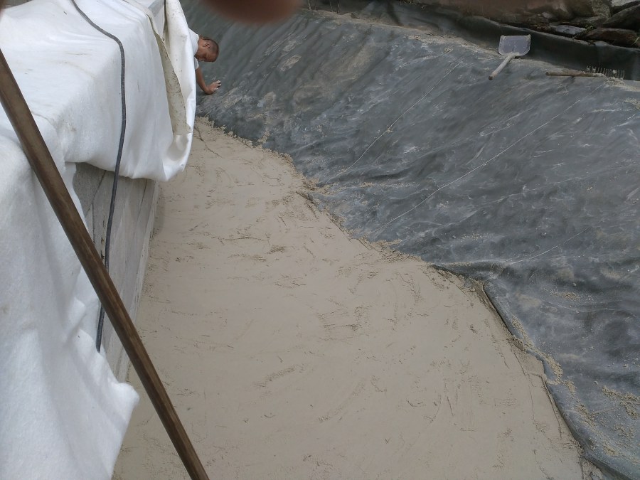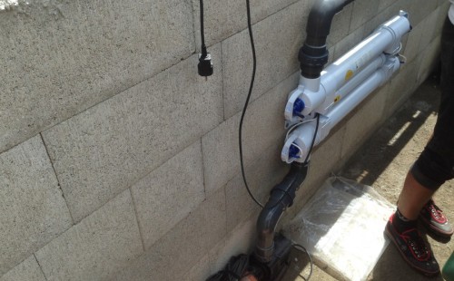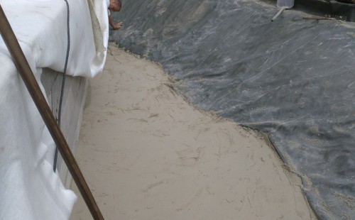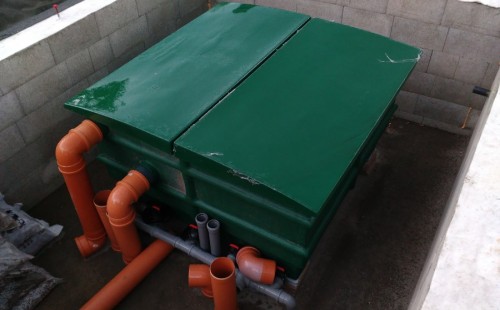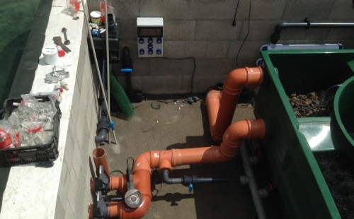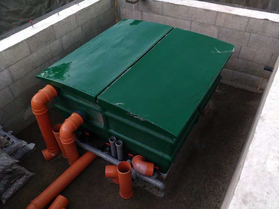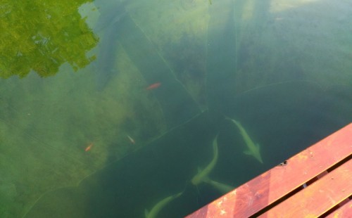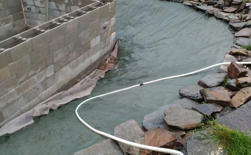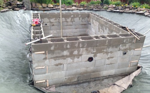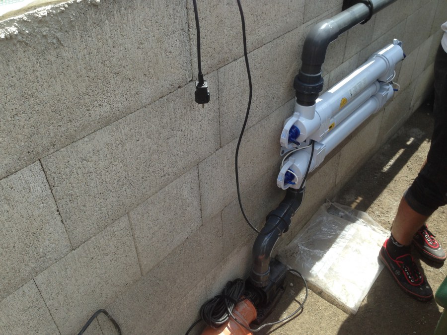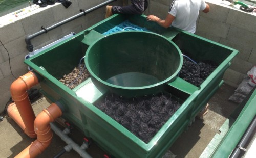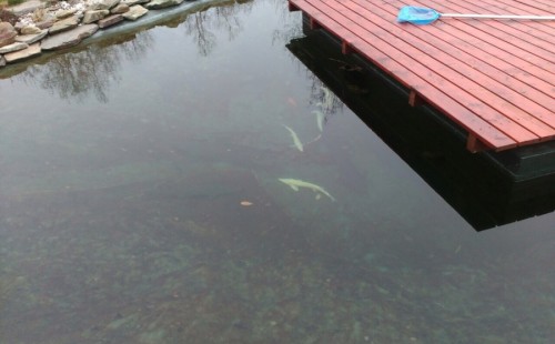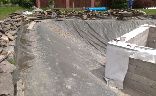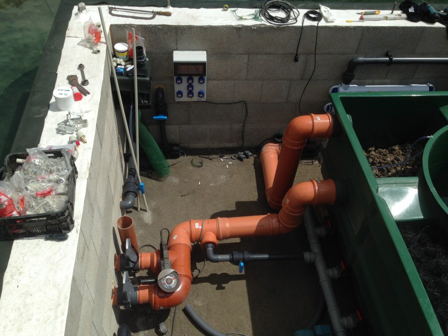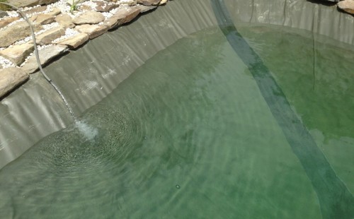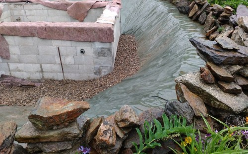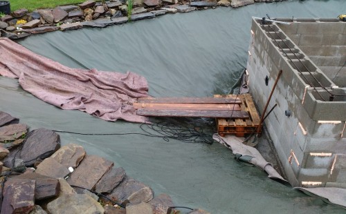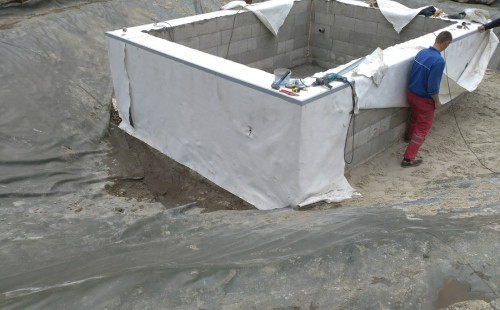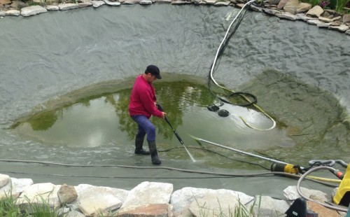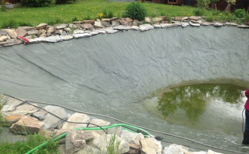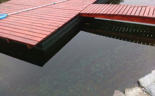Toto jezírko v horách bylo pro nás výzva. Klientka nás oslovila s prosbou o pomoc, buď s novou, větší technologií, nebo s rekonstrukcí jezírka. Nakonec po pečlivé úvaze se obsah jezírka zmenšil výstavbou technické místnosti uprostřed jezírka, do které se usadí filtr a veškerá potřebná technika. Nejprve se muselo jezírko vypustit, ryby přelovit, fólii očistit. Uprostřed jezírka se fólie rozřízla do odpovídajícího tvaru, tam se postavila technická místnost ze ztraceného bednění. Do jedné zdi se zabudovala fóliová příruba pro skimmer Oase AquaSkim Gravity. Zdi se potáhli geotextílií 500g na hrany se přivrtali fóliové lišty a na ně se navařila jezírková fólie Fatra Aquaplast 805/V olivově zelená, ta se u dna napojila na stávající fólii. Touto stavbou jsme zmenšili obsah jezírka a zároveň vyřešili umístění technologie. Do technické místnosti se umístil mechanicko-biologický filtr Tripond Center Vortex C115, na něj se napojila UV lampa TMC Pro Clean 110W a čerpadlo Oase AquaMax Gravity Eco 20000. Klientka si poté již sama udělala na technické místnosti krásné posezení.