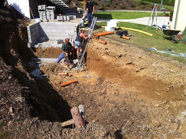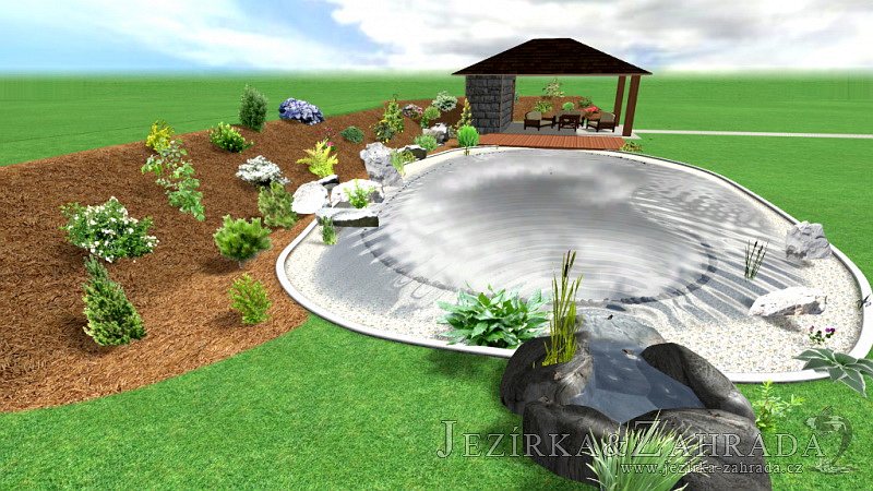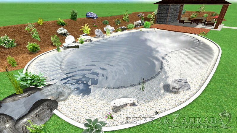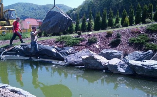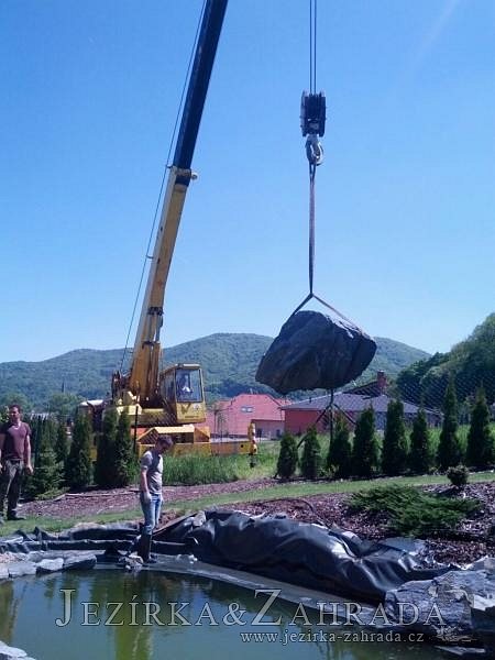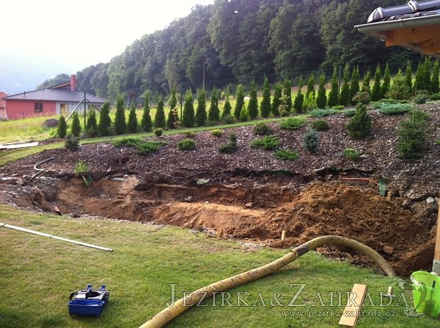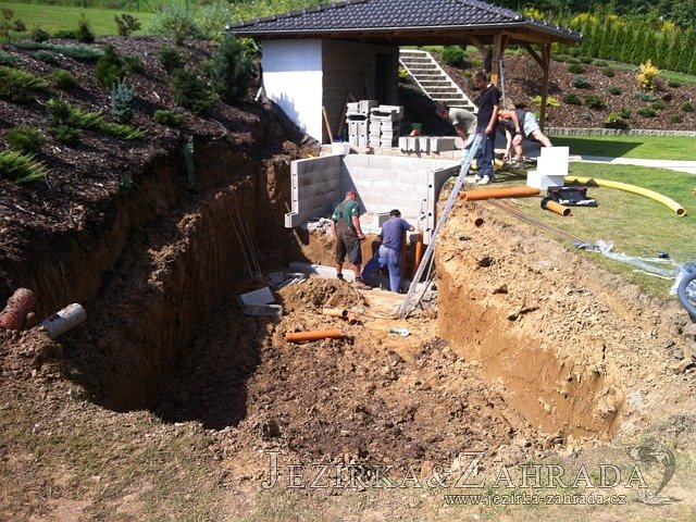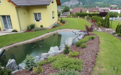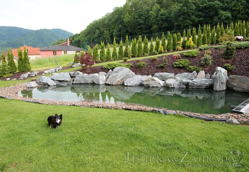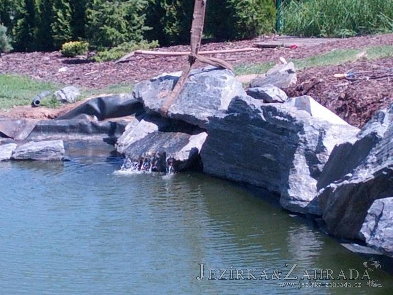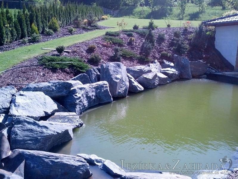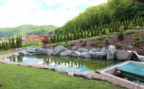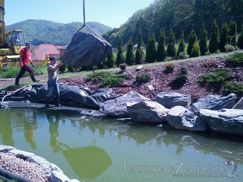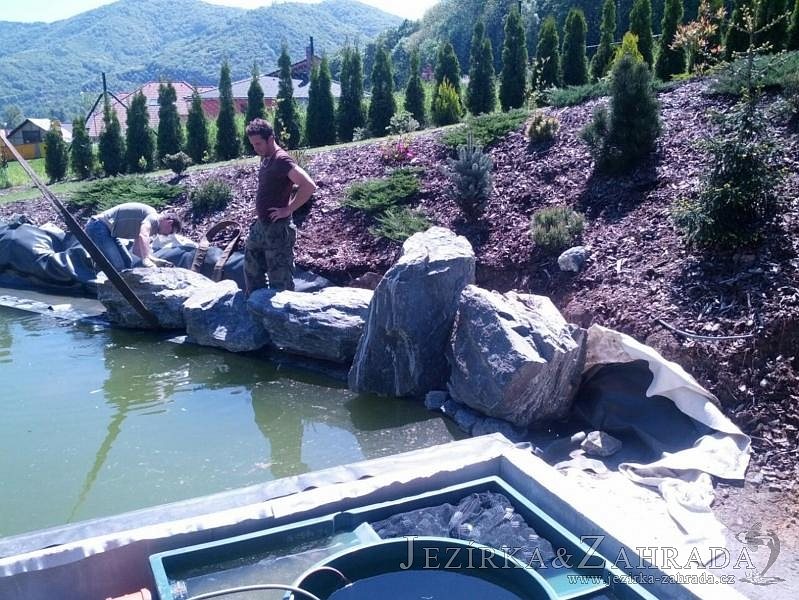 Na přání našeho zákazníka byl zpracován počítačový návrh na rekonstrukci jezírka s KOI kapry. Došlo k razantnímu zvětšení a prohloubení celého jezírka. Jezírko i technická místnost se připravila bagrem, dále se pak začalo stavět ze ztraceného bednění, které se pak následně zalilo betonem. Na dno se položila spodní vpusť-gule a do stěny se připevnila fóliová příruba pro skimmer Oase Aquaskim Gravity od nich se natáhlo potrubí do technické místnosti. Stěny jezírka se vypískovali, položila se geotextílie 500g a svařila se jezírková fólie Fatra Aquaplast 805 1,5mm olivově zelená. Dále se pak jeřábem usazovaly a aranžovaly velké okrasné kameny a dodával se kačírek. Dodaná technologie: biologicko-mechanický filtr Tripond Center-Vortex C80, UV lampa TMC Pro Pond Advantage 110W, 1x úsporné čerpadlo Oase AquaMax Gravity Eco 20000, PP šachta s kalovým čerpadlem, vzduchovací motor Resun LP 100.