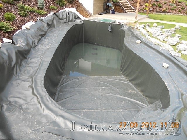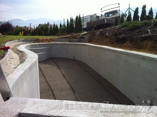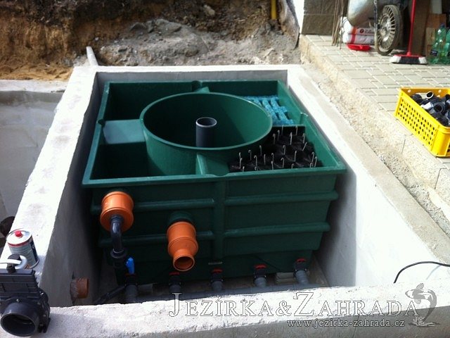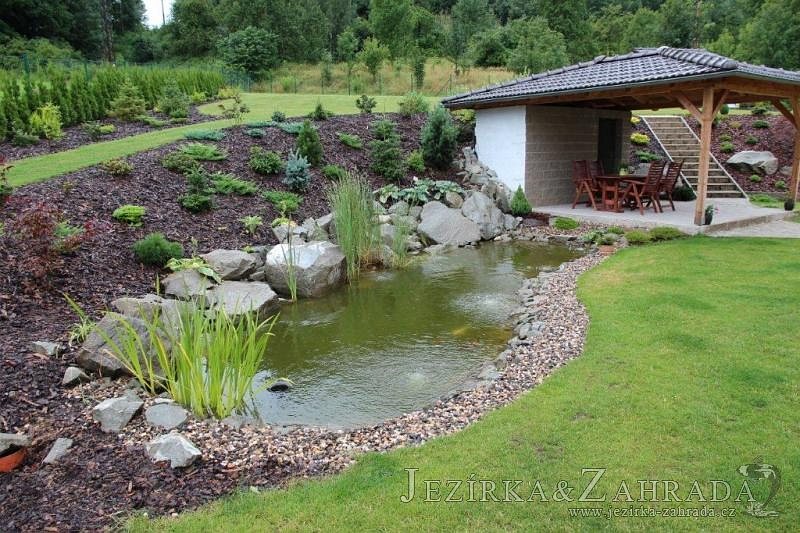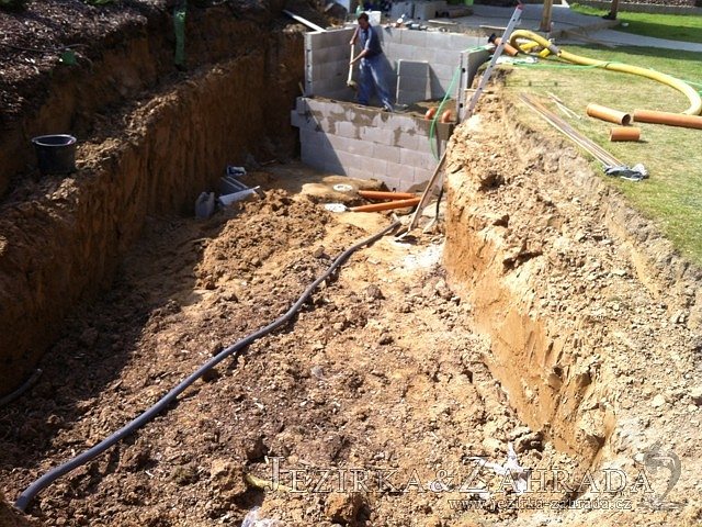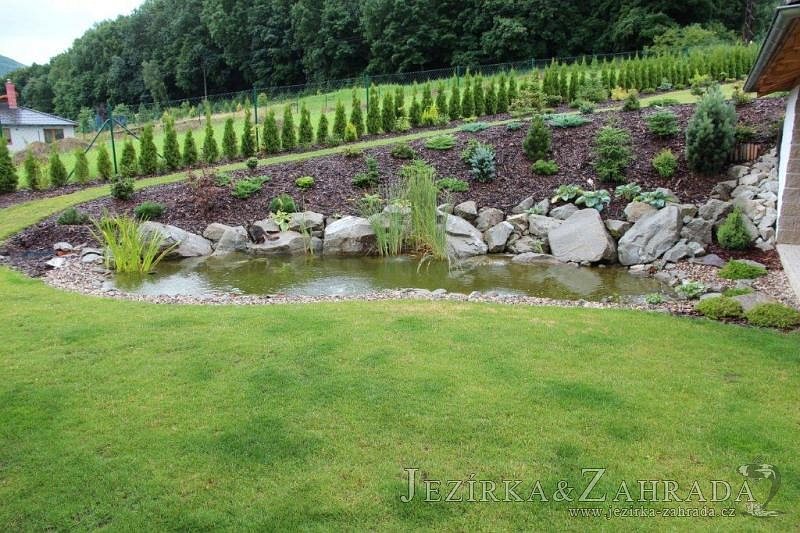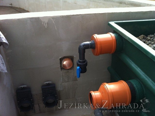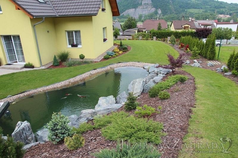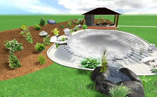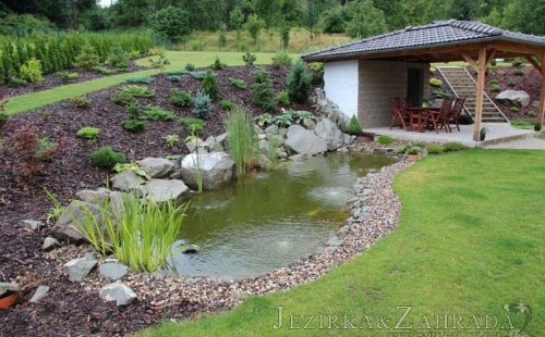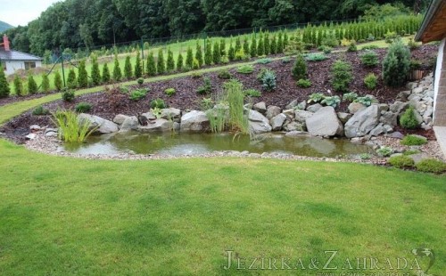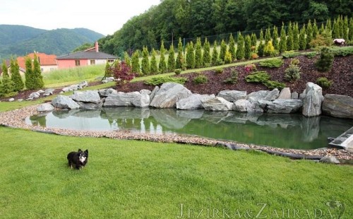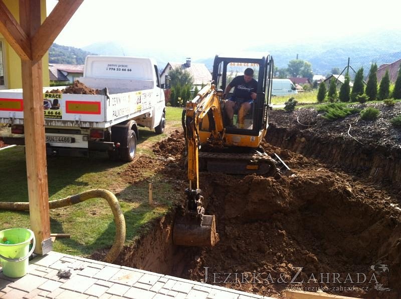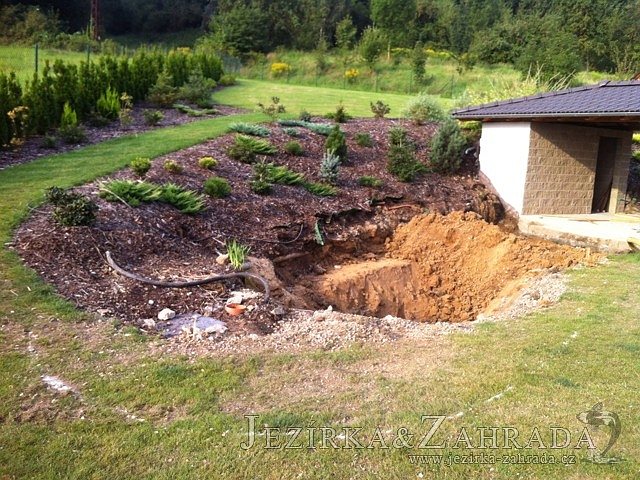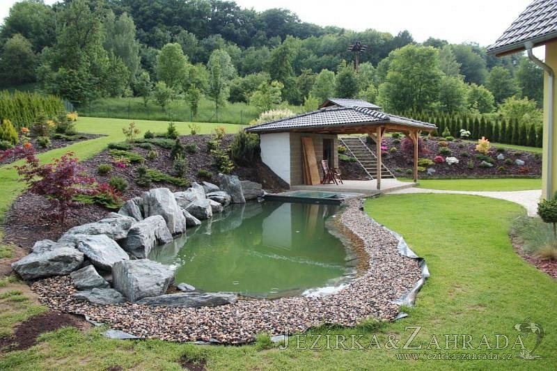 Na přání našeho zákazníka byl zpracován počítačový návrh na rekonstrukci jezírka s KOI kapry. Došlo k razantnímu zvětšení a prohloubení celého jezírka. Jezírko i technická místnost se připravila bagrem, dále se pak začalo stavět ze ztraceného bednění, které se pak následně zalilo betonem. Na dno se položila spodní vpusť-gule a do stěny se připevnila fóliová příruba pro skimmer Oase Aquaskim Gravity od nich se natáhlo potrubí do technické místnosti. Stěny jezírka se vypískovali, položila se geotextílie 500g a svařila se jezírková fólie Fatra Aquaplast 805 1,5mm olivově zelená. Dále se pak jeřábem usazovaly a aranžovaly velké okrasné kameny a dodával se kačírek. Dodaná technologie: biologicko-mechanický filtr Tripond Center-Vortex C80, UV lampa TMC Pro Pond Advantage 110W, 1x úsporné čerpadlo Oase AquaMax Gravity Eco 20000, PP šachta s kalovým čerpadlem, vzduchovací motor Resun LP 100.