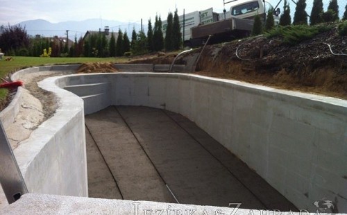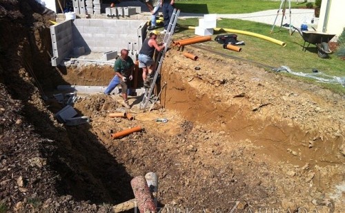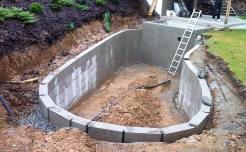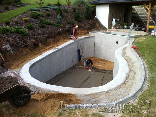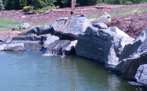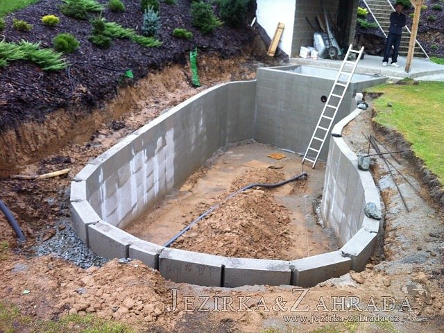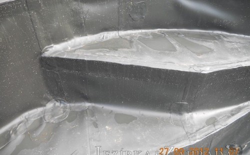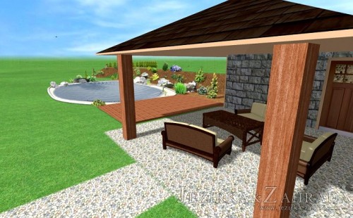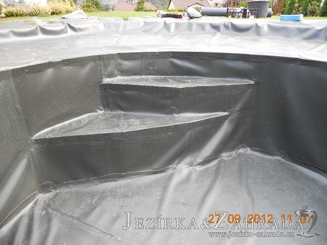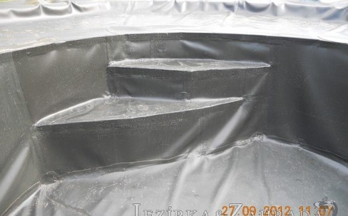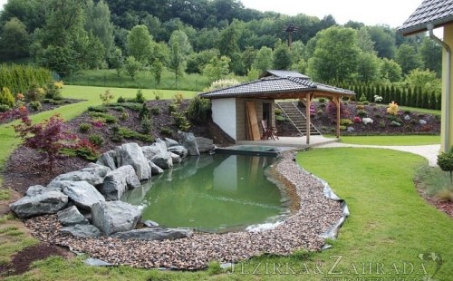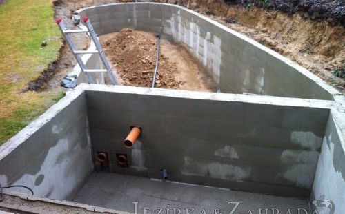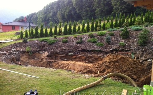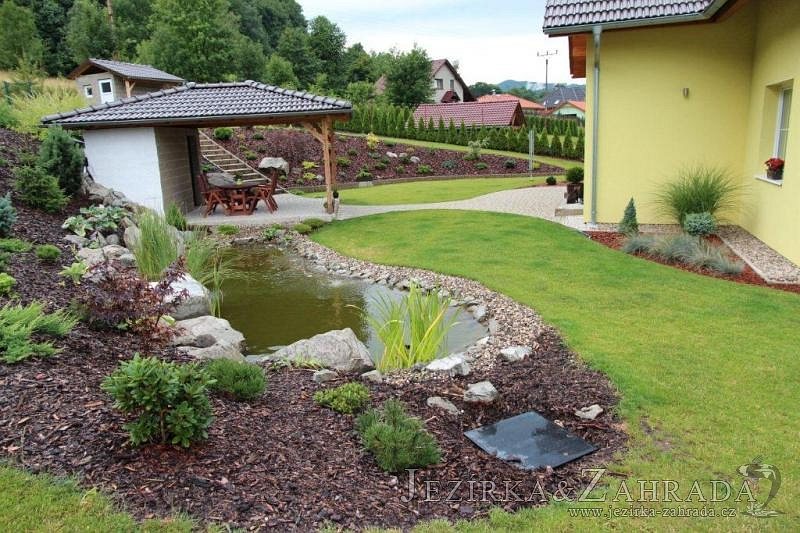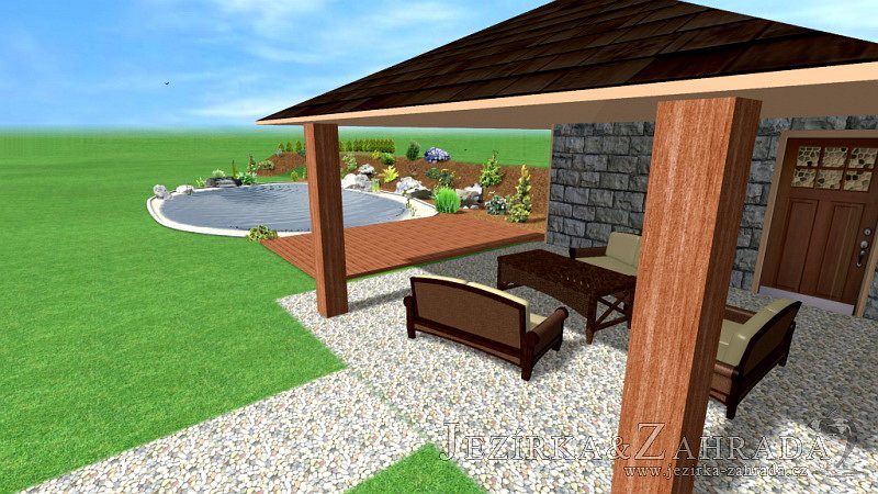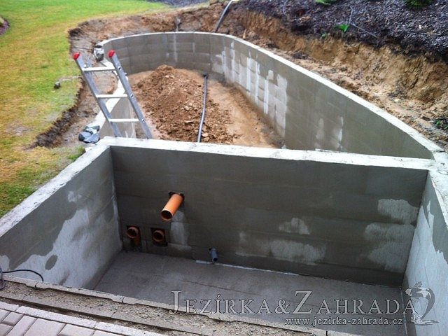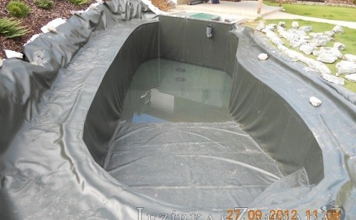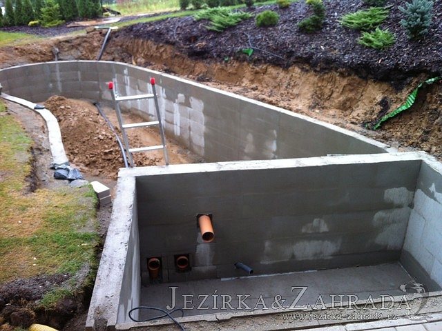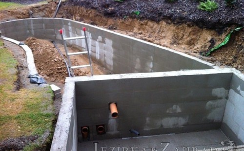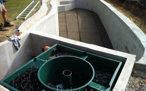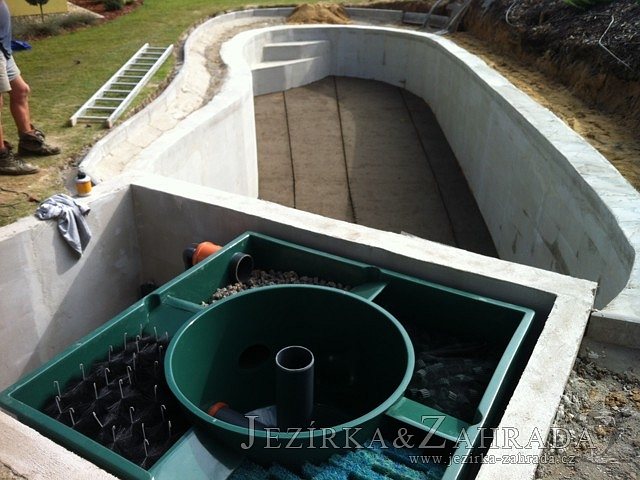 Na přání našeho zákazníka byl zpracován počítačový návrh na rekonstrukci jezírka s KOI kapry. Došlo k razantnímu zvětšení a prohloubení celého jezírka. Jezírko i technická místnost se připravila bagrem, dále se pak začalo stavět ze ztraceného bednění, které se pak následně zalilo betonem. Na dno se položila spodní vpusť-gule a do stěny se připevnila fóliová příruba pro skimmer Oase Aquaskim Gravity od nich se natáhlo potrubí do technické místnosti. Stěny jezírka se vypískovali, položila se geotextílie 500g a svařila se jezírková fólie Fatra Aquaplast 805 1,5mm olivově zelená. Dále se pak jeřábem usazovaly a aranžovaly velké okrasné kameny a dodával se kačírek. Dodaná technologie: biologicko-mechanický filtr Tripond Center-Vortex C80, UV lampa TMC Pro Pond Advantage 110W, 1x úsporné čerpadlo Oase AquaMax Gravity Eco 20000, PP šachta s kalovým čerpadlem, vzduchovací motor Resun LP 100.