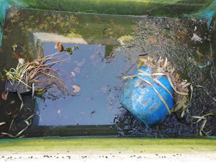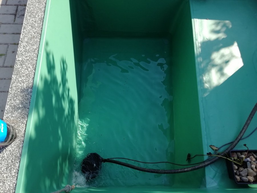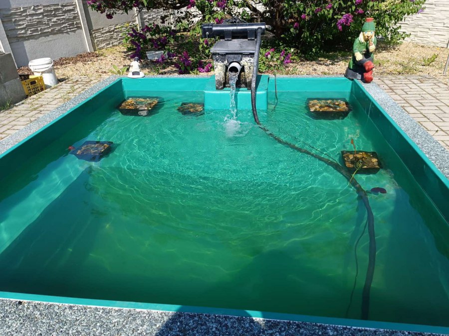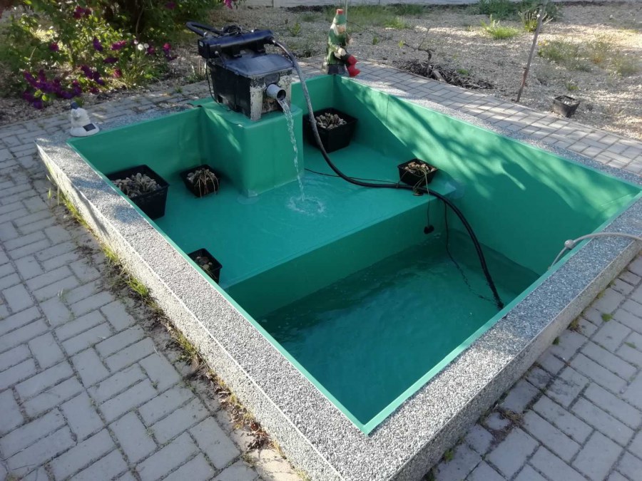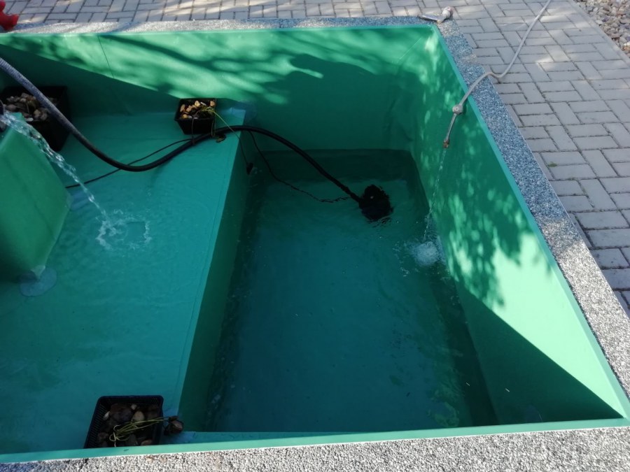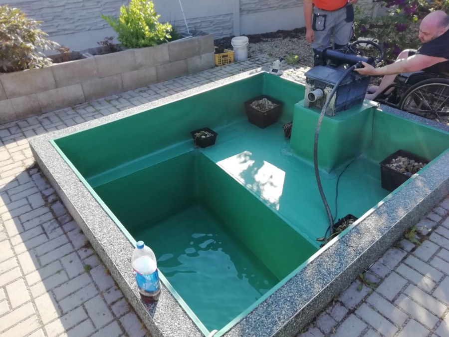 Po vyfóliování a kontrole svárů se mohla ihned začít napouštět voda. Na mělké zóny se usadili květináče a vypustili se zpět ryby. Jezírko je malé takže práce byli hotové za jeden den.