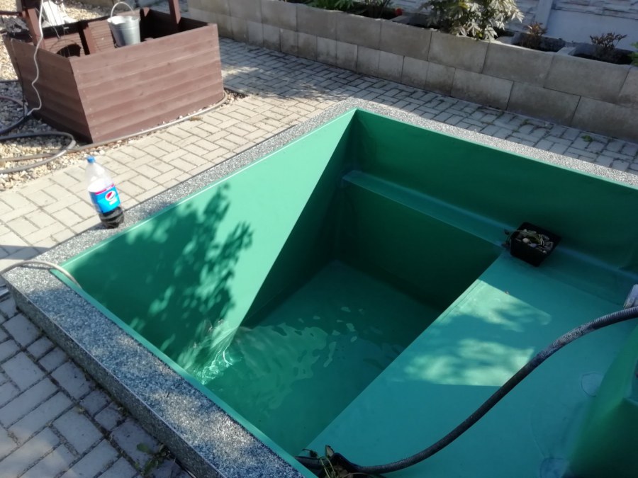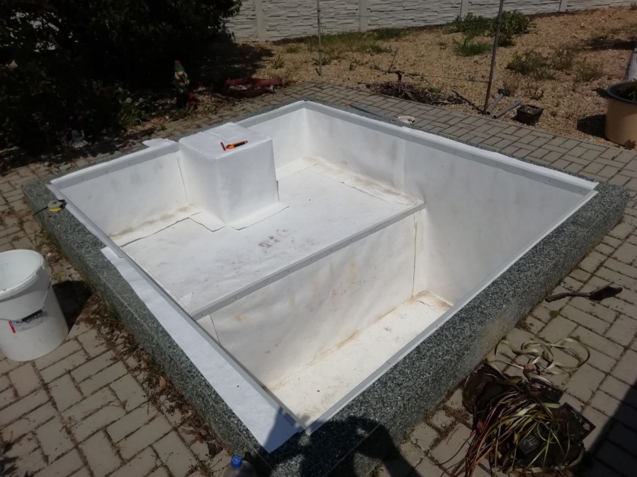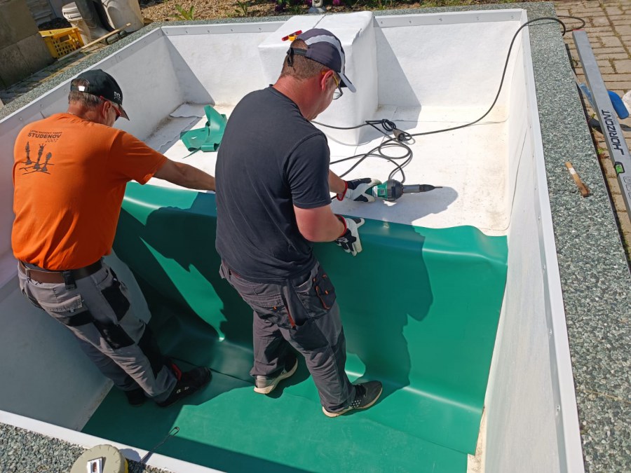 Po vypuštění vody a odstranění květin se dno a stěny vyčistili. Položila se geotextílie 500g a na hrany se navrtali fóliové lišty, na ty se začala navařovat fólie Fatra Aquaplast 805/V světle zelená.