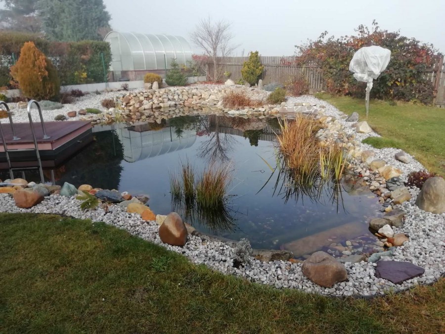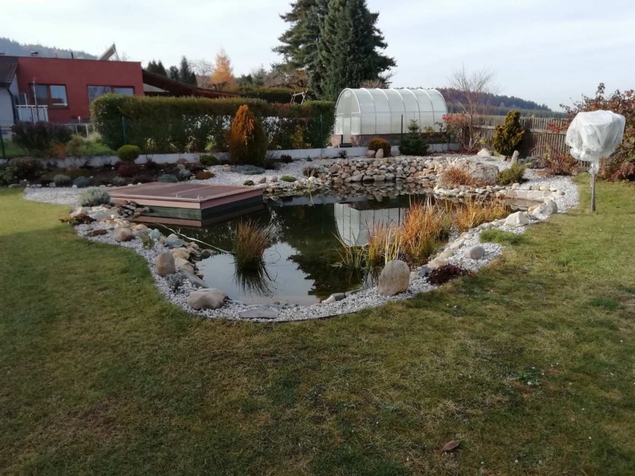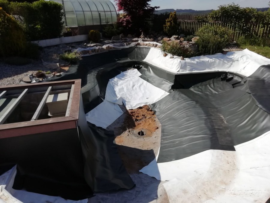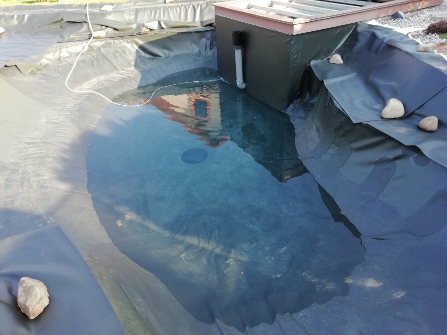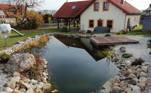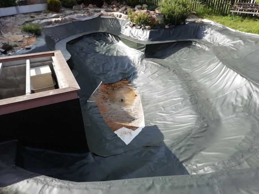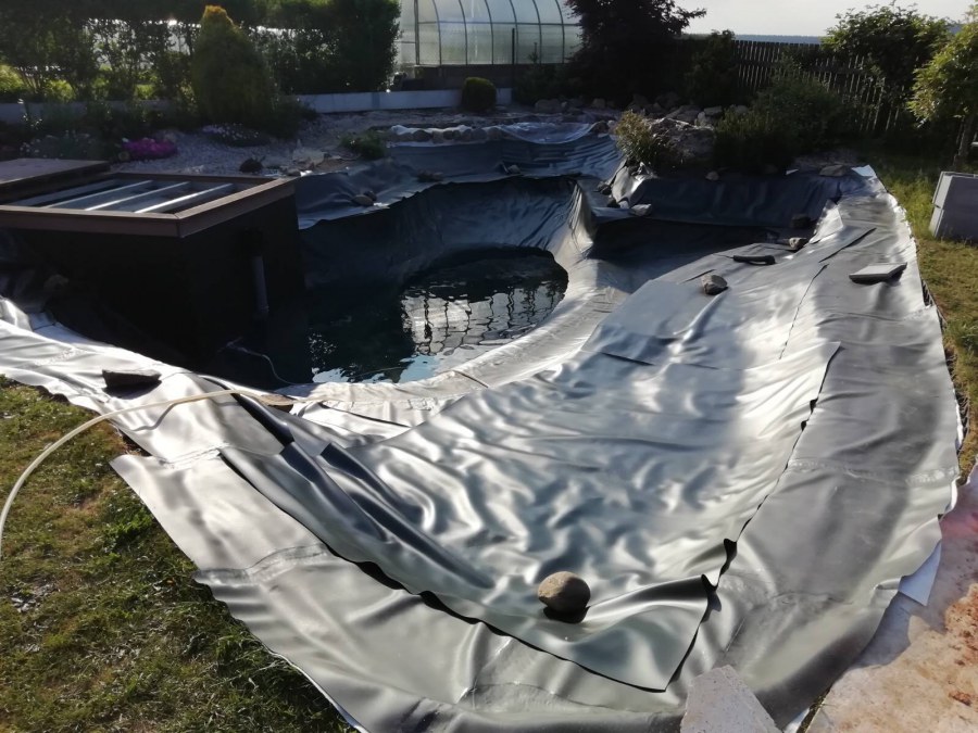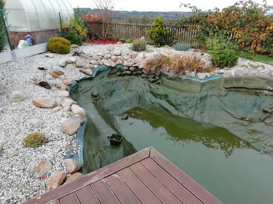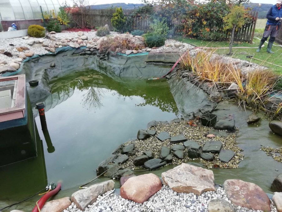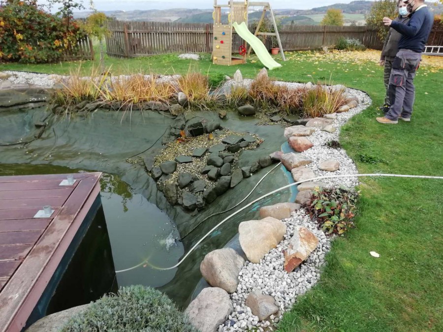 Letos na jaře proběhla dlouho plánovaná rekonstrukce stávajícího jezírka. Jezírko se stavělo před mnoha lety, časem a hlavně vinou spodní vody se bortili stěny jezírka. Proto se majitel rozhodl pro celkovou rekonstrukci. Práce měli 3 fáze. Nejdřív naši technici přelovili ryby do saku s filtrací. Poté vypustili vodu, odstranili kameny a květiny z břehů. Nakonec odstranili stávající fólii. Podle aktuálního stavu dna navrhli rozsah prací, které si majitel provedl sám z vlastních zdrojů. Upravil tvar a povrch jezírka. Zpevnil pobřežní zóny obrubníky a svislé hrany betonem. Pak mohli naši technici začít pokládat novou fólii. Nejdříve některá místa vypískovali kopaným pískem, poté položili geotextílii 500g a na ní začali svařovat fólii Fatra Aquaplast 805/V olivově zelenou. Technologie zůstala stejná, protože obsah jezírka se těmito pracemi nezměnil. V technické místnosti navazující na jezírko je usazen biologicko-mechanický filtr Tripond Center Vortex C80, UV lampa Pro Clear TMC 110W a čerpadlo Oase AquaMax Gravity 15000.