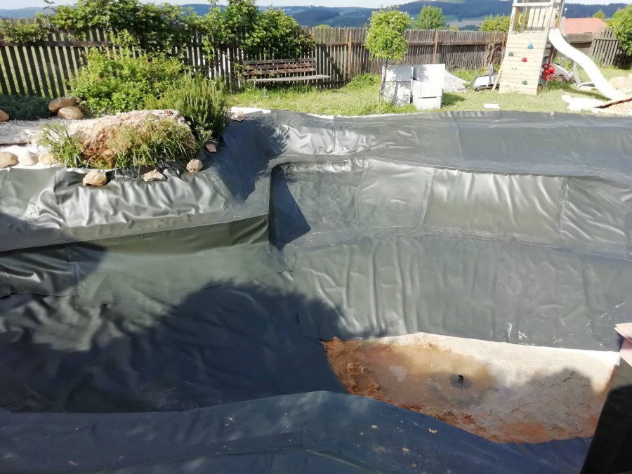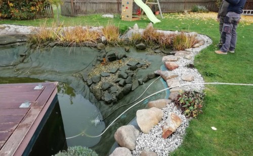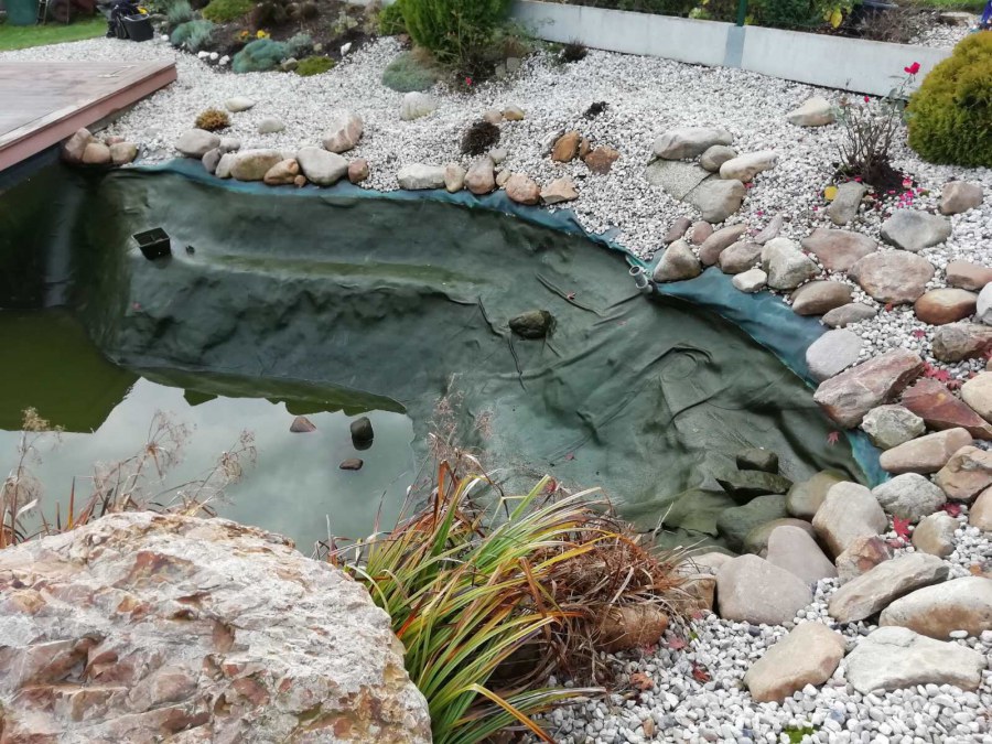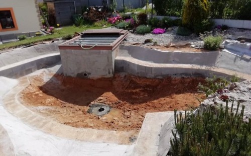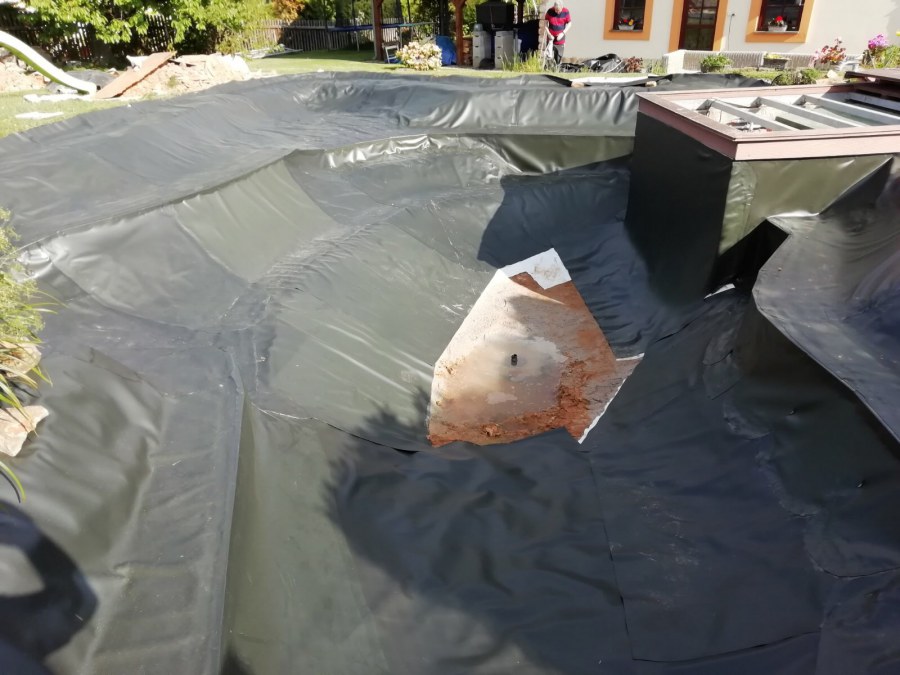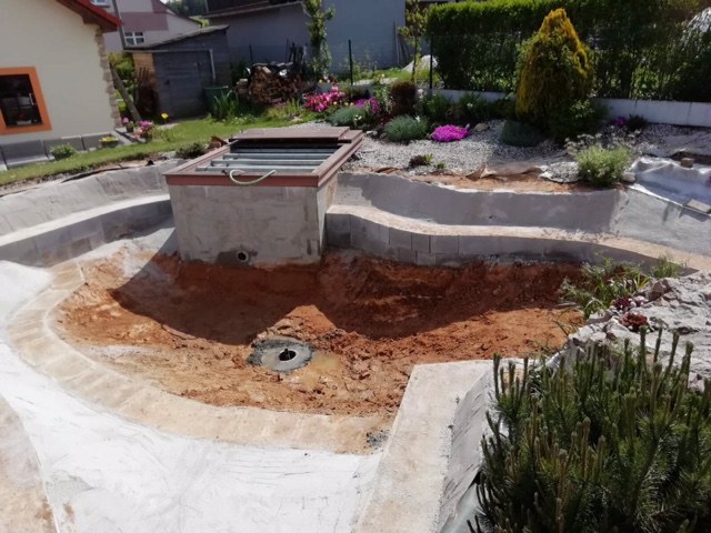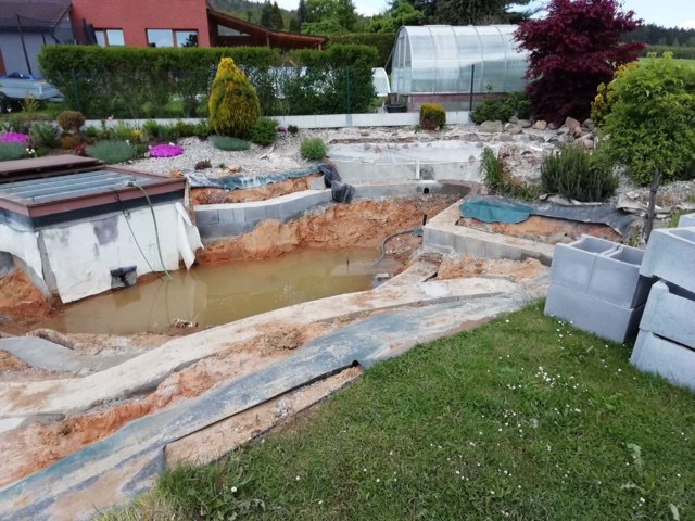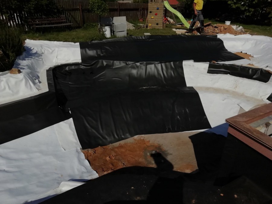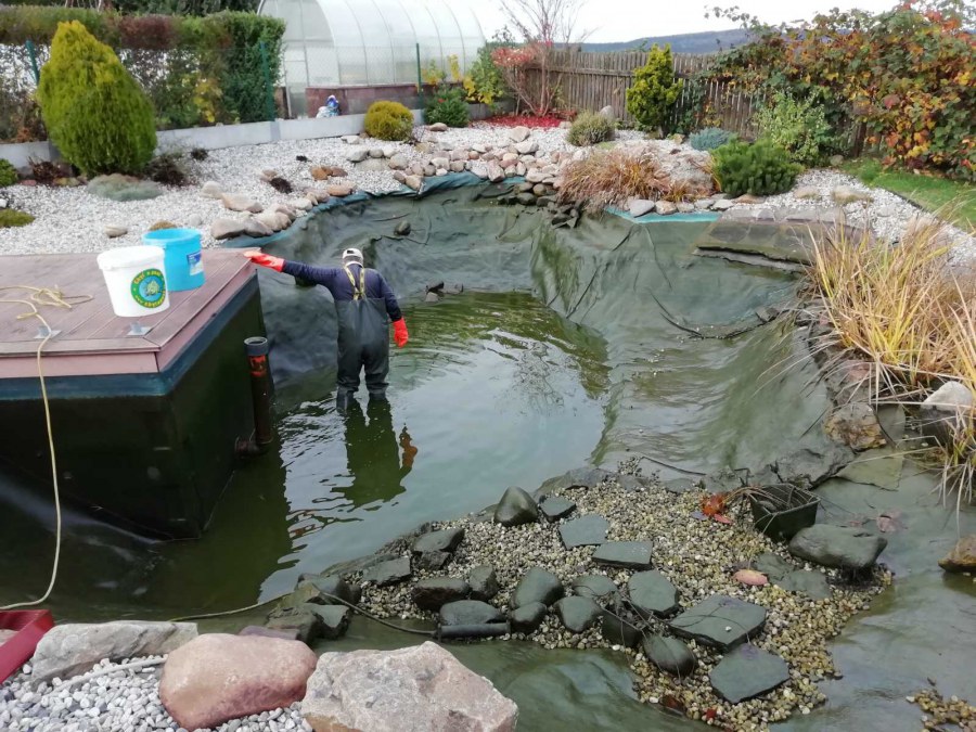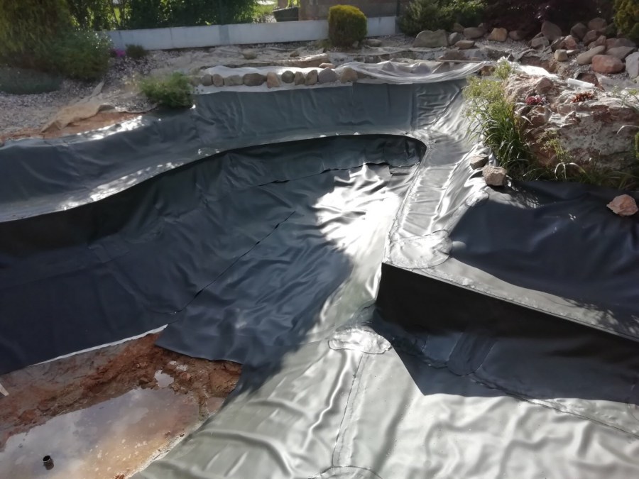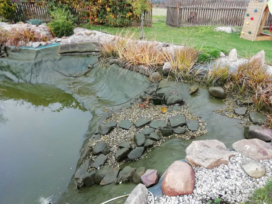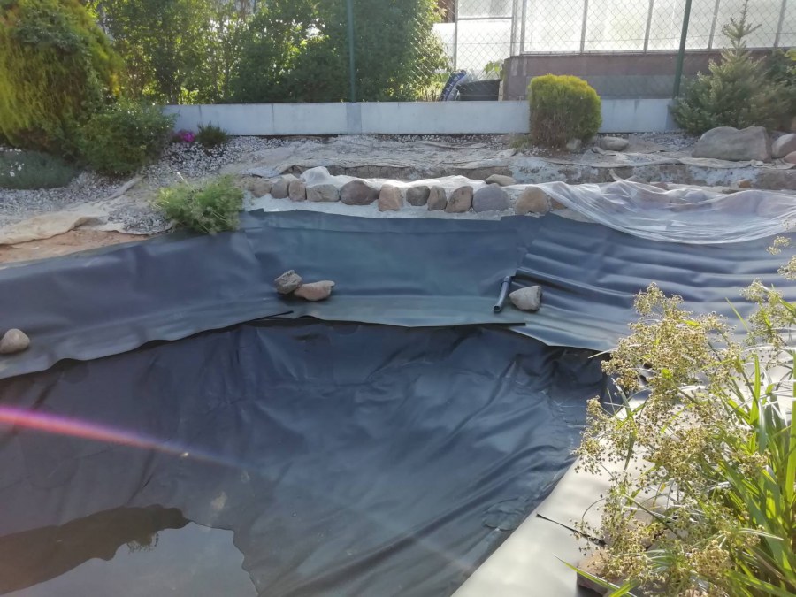 Letos na jaře proběhla dlouho plánovaná rekonstrukce stávajícího jezírka. Jezírko se stavělo před mnoha lety, časem a hlavně vinou spodní vody se bortili stěny jezírka. Proto se majitel rozhodl pro celkovou rekonstrukci. Práce měli 3 fáze. Nejdřív naši technici přelovili ryby do saku s filtrací. Poté vypustili vodu, odstranili kameny a květiny z břehů. Nakonec odstranili stávající fólii. Podle aktuálního stavu dna navrhli rozsah prací, které si majitel provedl sám z vlastních zdrojů. Upravil tvar a povrch jezírka. Zpevnil pobřežní zóny obrubníky a svislé hrany betonem. Pak mohli naši technici začít pokládat novou fólii. Nejdříve některá místa vypískovali kopaným pískem, poté položili geotextílii 500g a na ní začali svařovat fólii Fatra Aquaplast 805/V olivově zelenou. Technologie zůstala stejná, protože obsah jezírka se těmito pracemi nezměnil. V technické místnosti navazující na jezírko je usazen biologicko-mechanický filtr Tripond Center Vortex C80, UV lampa Pro Clear TMC 110W a čerpadlo Oase AquaMax Gravity 15000.