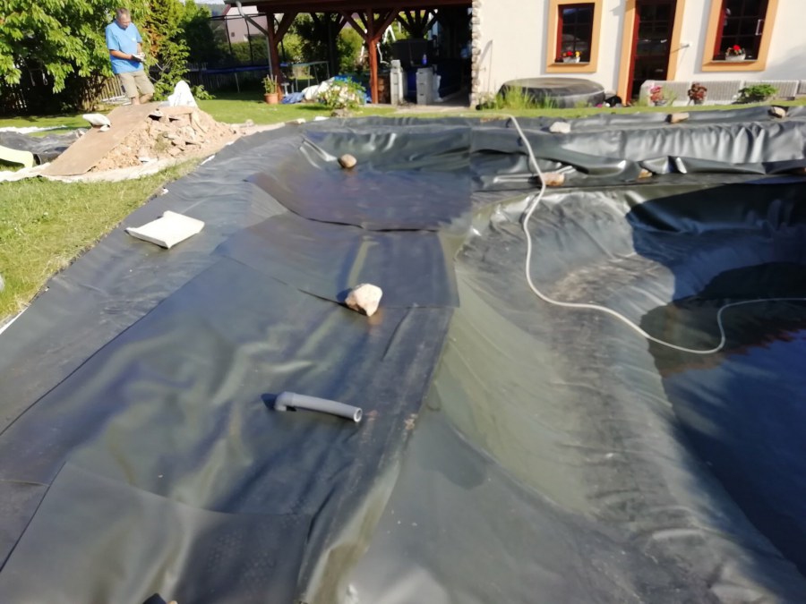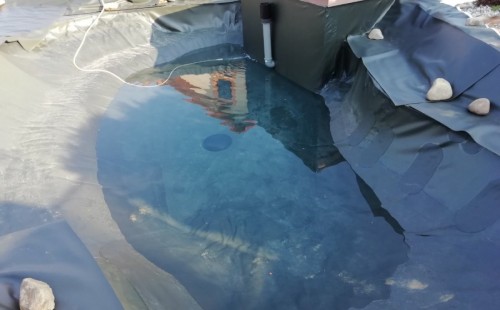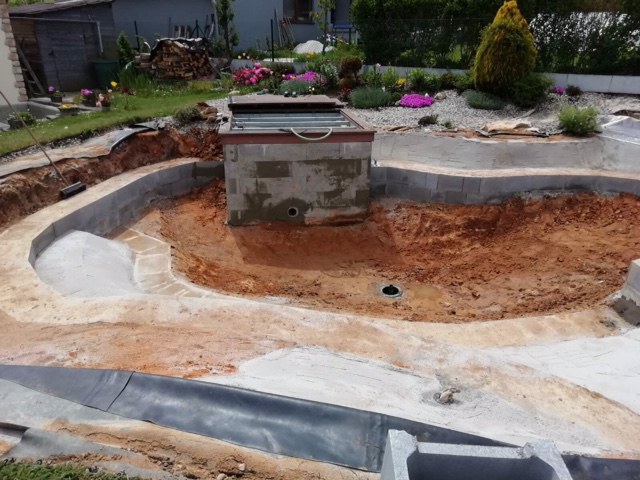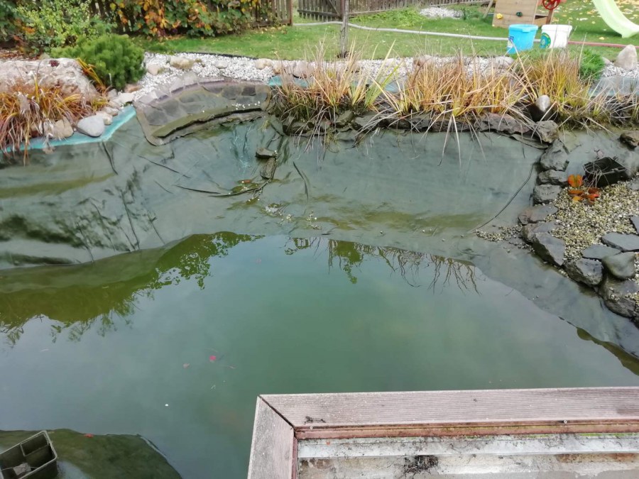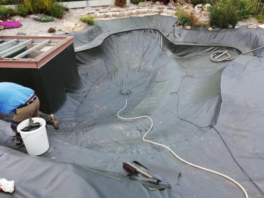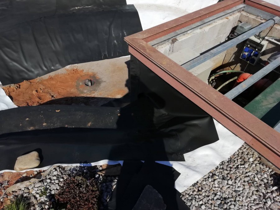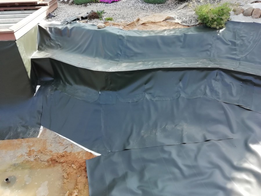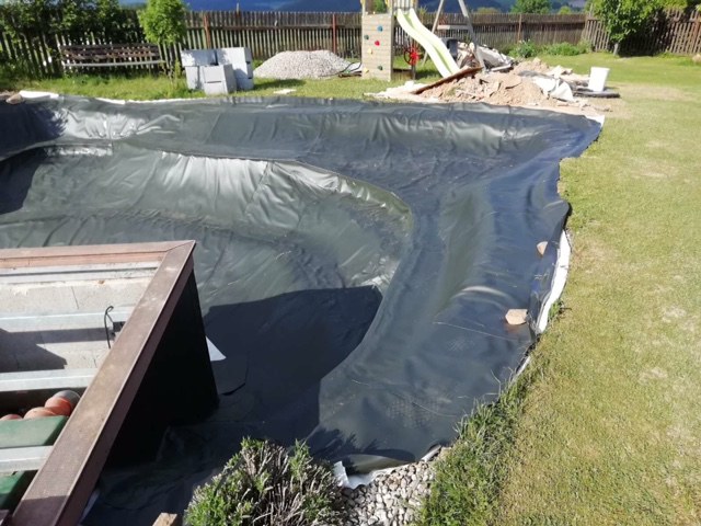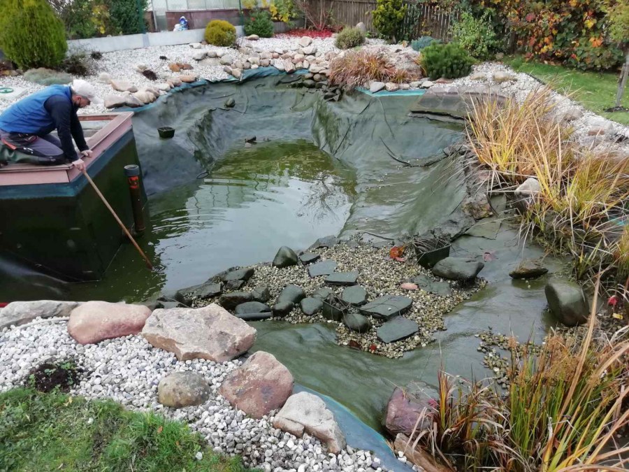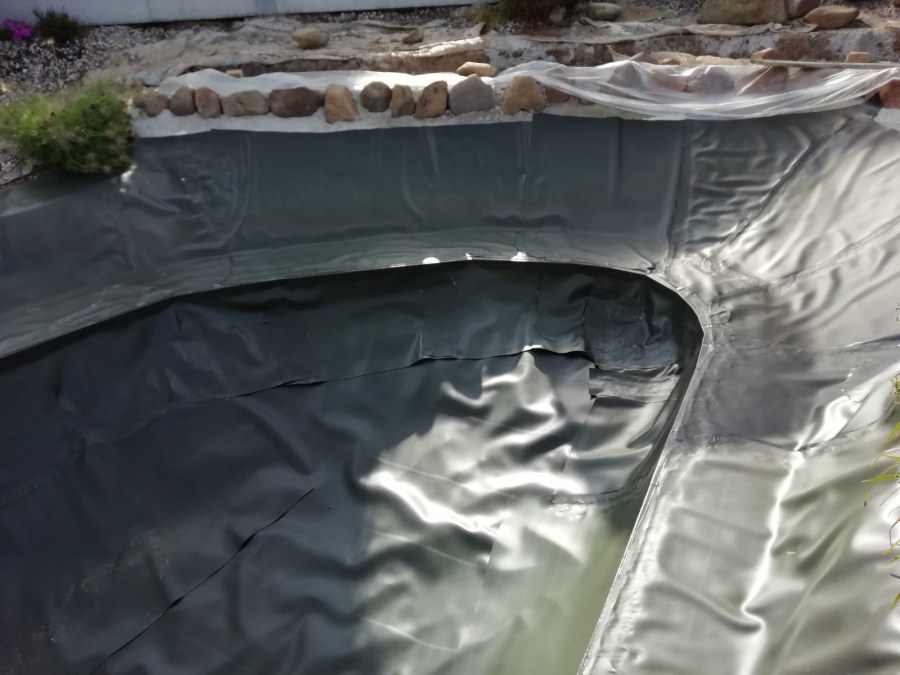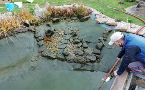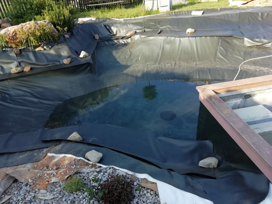 Letos na jaře proběhla dlouho plánovaná rekonstrukce stávajícího jezírka. Jezírko se stavělo před mnoha lety, časem a hlavně vinou spodní vody se bortili stěny jezírka. Proto se majitel rozhodl pro celkovou rekonstrukci. Práce měli 3 fáze. Nejdřív naši technici přelovili ryby do saku s filtrací. Poté vypustili vodu, odstranili kameny a květiny z břehů. Nakonec odstranili stávající fólii. Podle aktuálního stavu dna navrhli rozsah prací, které si majitel provedl sám z vlastních zdrojů. Upravil tvar a povrch jezírka. Zpevnil pobřežní zóny obrubníky a svislé hrany betonem. Pak mohli naši technici začít pokládat novou fólii. Nejdříve některá místa vypískovali kopaným pískem, poté položili geotextílii 500g a na ní začali svařovat fólii Fatra Aquaplast 805/V olivově zelenou. Technologie zůstala stejná, protože obsah jezírka se těmito pracemi nezměnil. V technické místnosti navazující na jezírko je usazen biologicko-mechanický filtr Tripond Center Vortex C80, UV lampa Pro Clear TMC 110W a čerpadlo Oase AquaMax Gravity 15000.