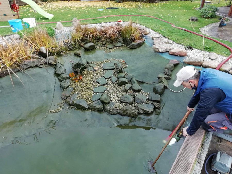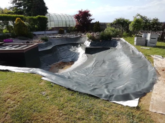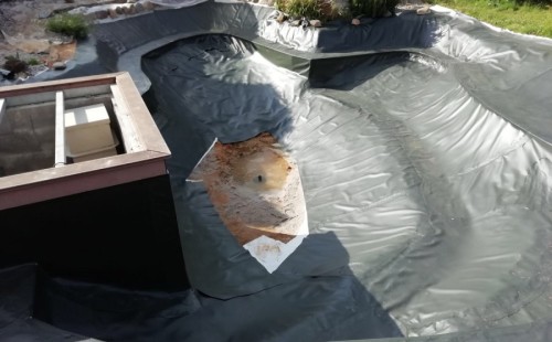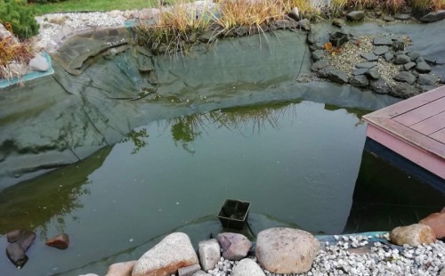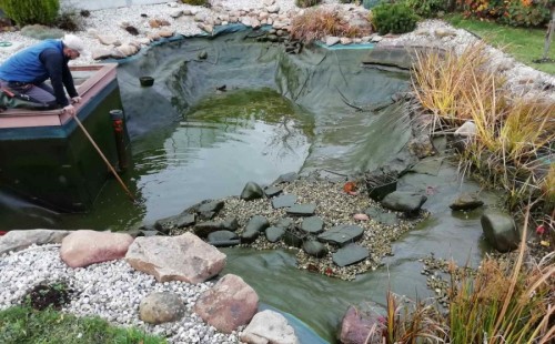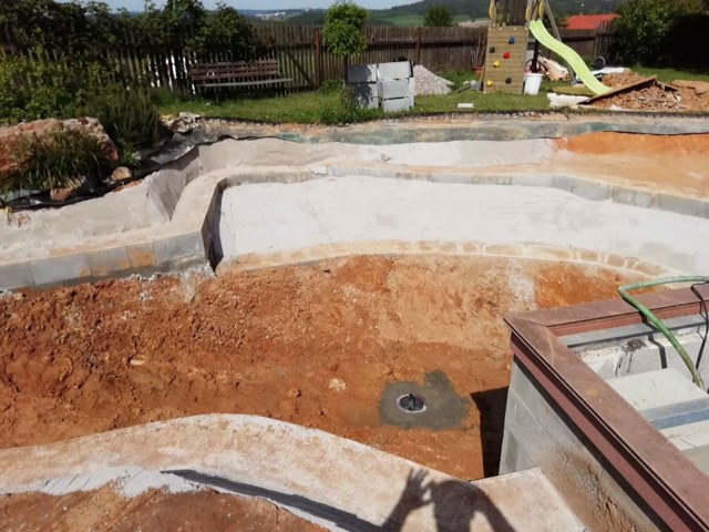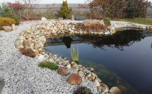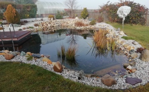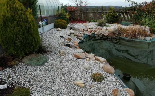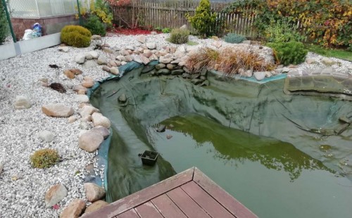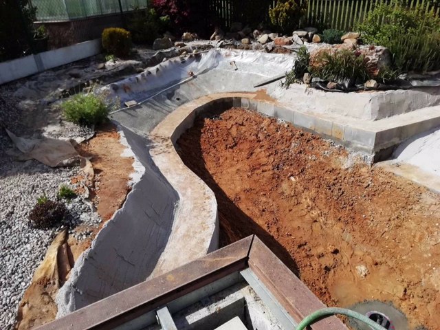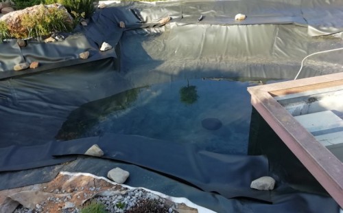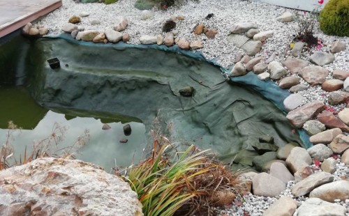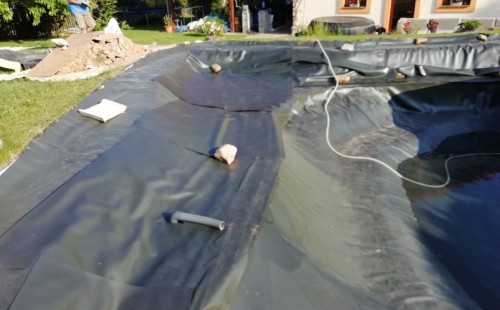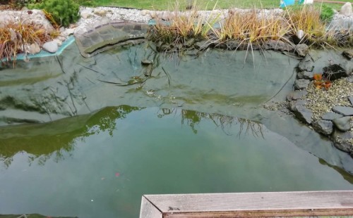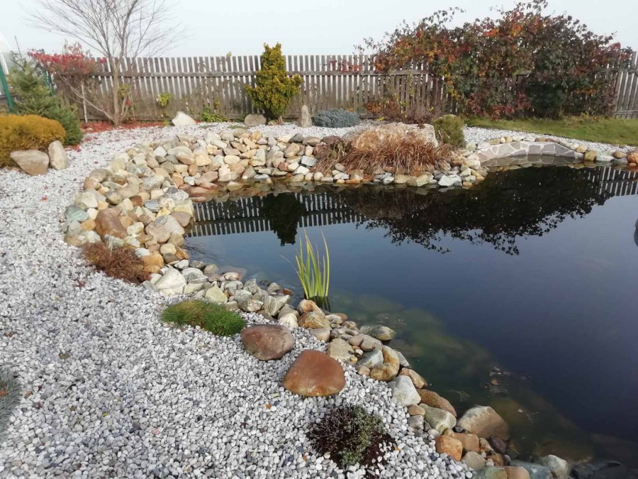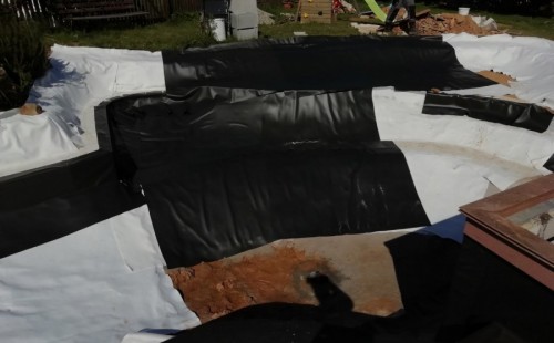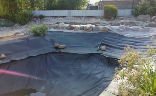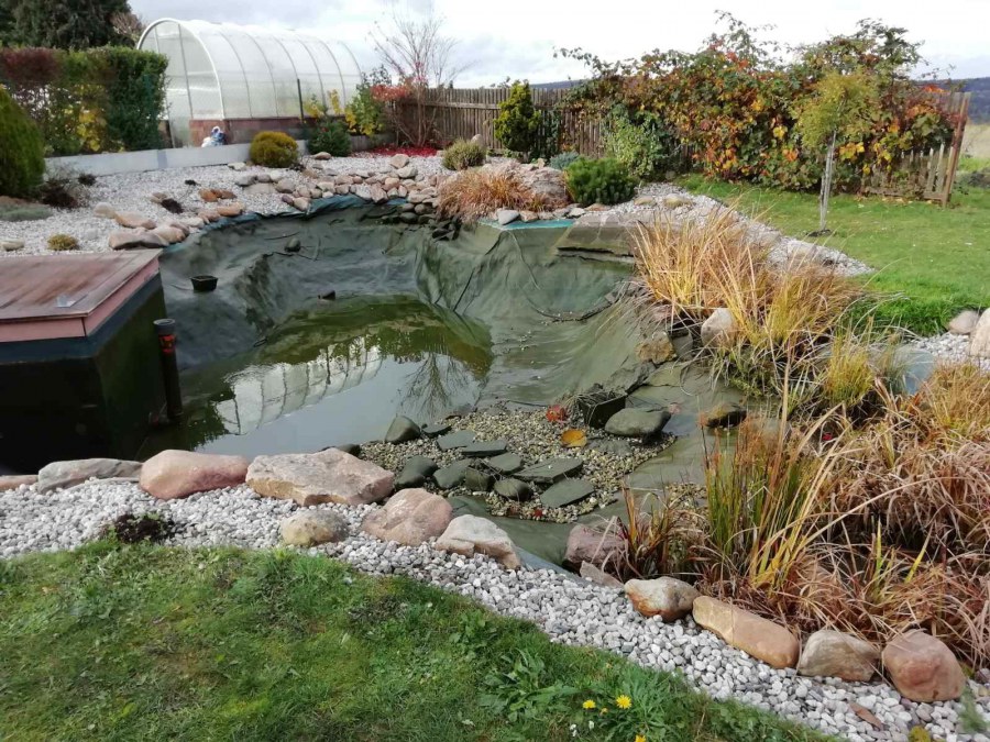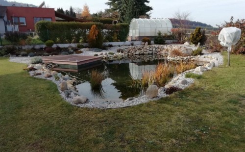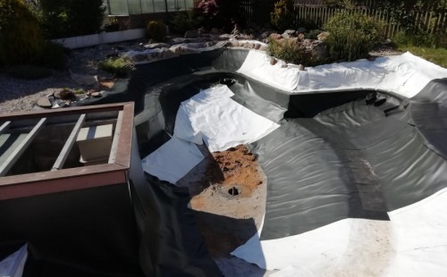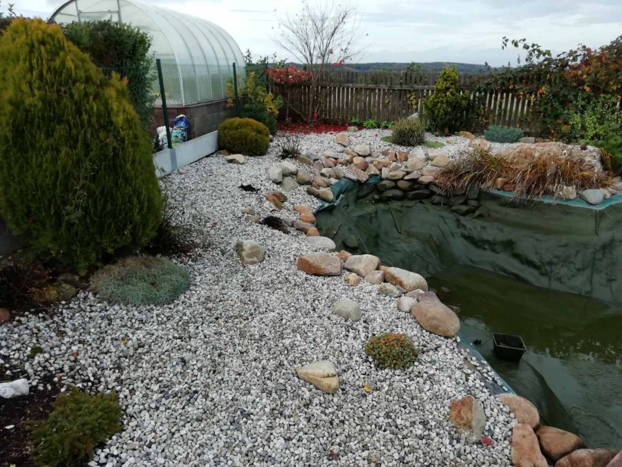 Letos na jaře proběhla dlouho plánovaná rekonstrukce stávajícího jezírka. Jezírko se stavělo před mnoha lety, časem a hlavně vinou spodní vody se bortili stěny jezírka. Proto se majitel rozhodl pro celkovou rekonstrukci. Práce měli 3 fáze. Nejdřív naši technici přelovili ryby do saku s filtrací. Poté vypustili vodu, odstranili kameny a květiny z břehů. Nakonec odstranili stávající fólii. Podle aktuálního stavu dna navrhli rozsah prací, které si majitel provedl sám z vlastních zdrojů. Upravil tvar a povrch jezírka. Zpevnil pobřežní zóny obrubníky a svislé hrany betonem. Pak mohli naši technici začít pokládat novou fólii. Nejdříve některá místa vypískovali kopaným pískem, poté položili geotextílii 500g a na ní začali svařovat fólii Fatra Aquaplast 805/V olivově zelenou. Technologie zůstala stejná, protože obsah jezírka se těmito pracemi nezměnil. V technické místnosti navazující na jezírko je usazen biologicko-mechanický filtr Tripond Center Vortex C80, UV lampa Pro Clear TMC 110W a čerpadlo Oase AquaMax Gravity 15000.