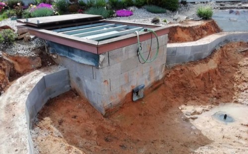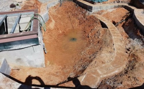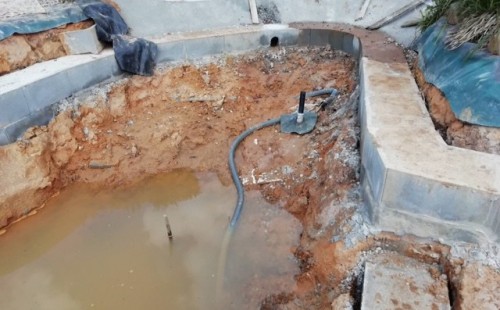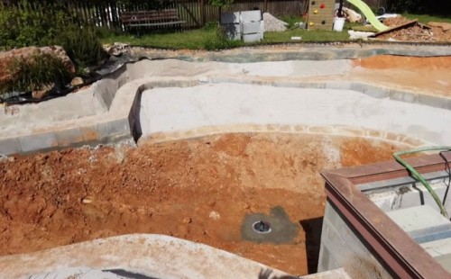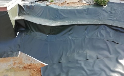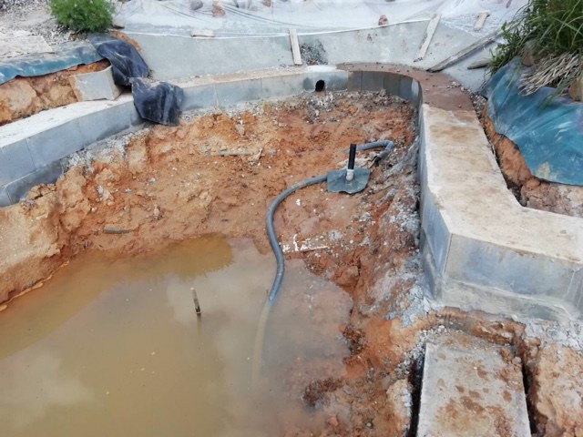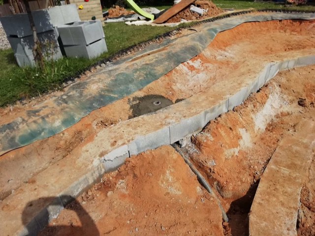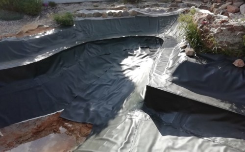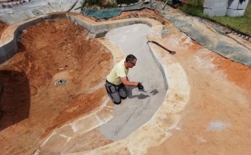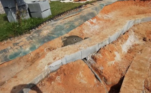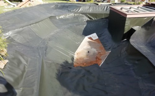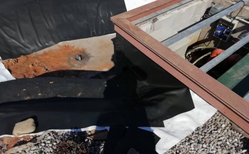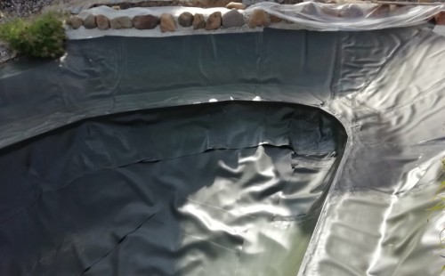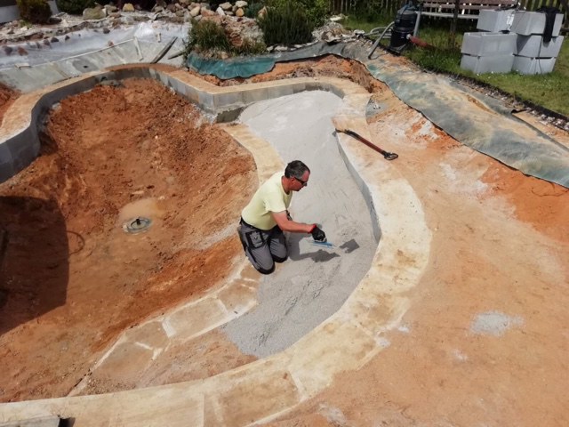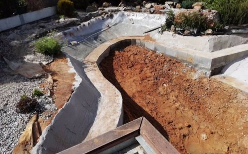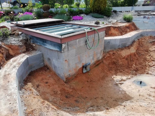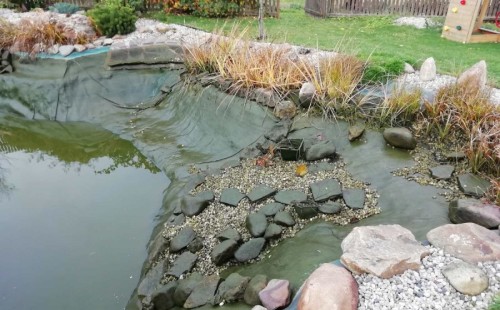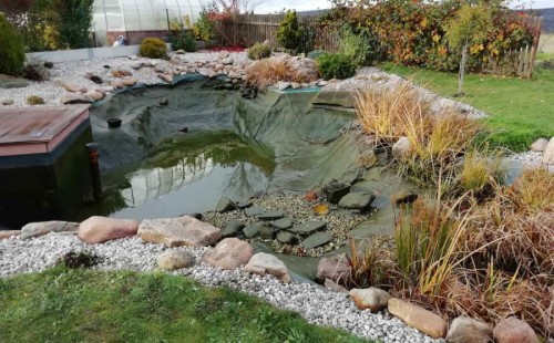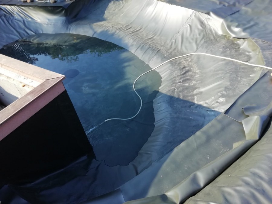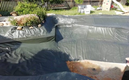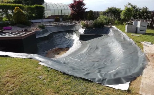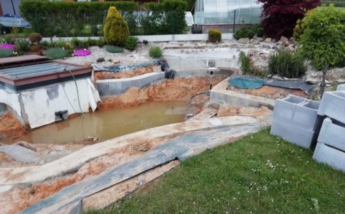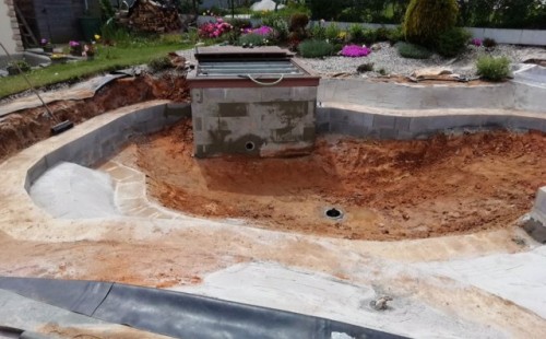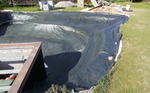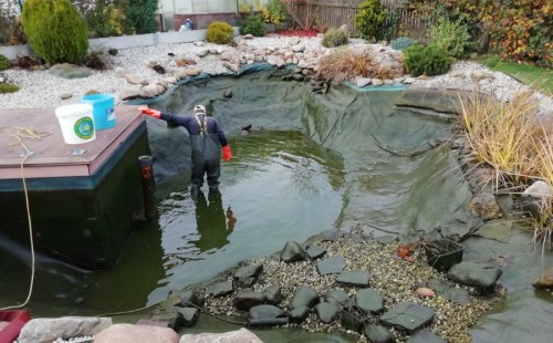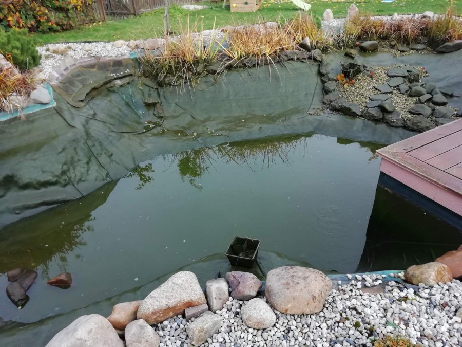 Letos na jaře proběhla dlouho plánovaná rekonstrukce stávajícího jezírka. Jezírko se stavělo před mnoha lety, časem a hlavně vinou spodní vody se bortili stěny jezírka. Proto se majitel rozhodl pro celkovou rekonstrukci. Práce měli 3 fáze. Nejdřív naši technici přelovili ryby do saku s filtrací. Poté vypustili vodu, odstranili kameny a květiny z břehů. Nakonec odstranili stávající fólii. Podle aktuálního stavu dna navrhli rozsah prací, které si majitel provedl sám z vlastních zdrojů. Upravil tvar a povrch jezírka. Zpevnil pobřežní zóny obrubníky a svislé hrany betonem. Pak mohli naši technici začít pokládat novou fólii. Nejdříve některá místa vypískovali kopaným pískem, poté položili geotextílii 500g a na ní začali svařovat fólii Fatra Aquaplast 805/V olivově zelenou. Technologie zůstala stejná, protože obsah jezírka se těmito pracemi nezměnil. V technické místnosti navazující na jezírko je usazen biologicko-mechanický filtr Tripond Center Vortex C80, UV lampa Pro Clear TMC 110W a čerpadlo Oase AquaMax Gravity 15000.