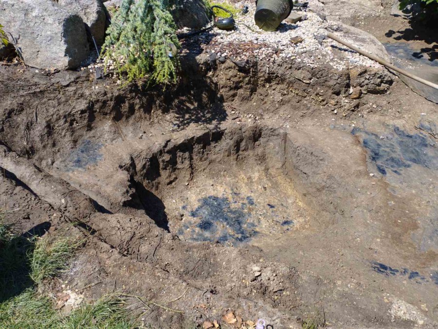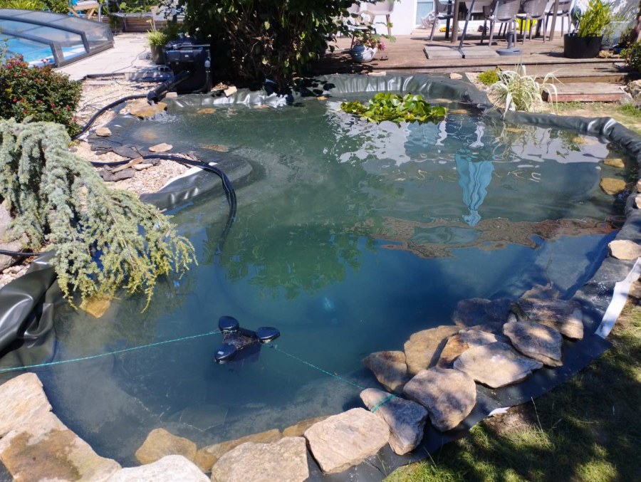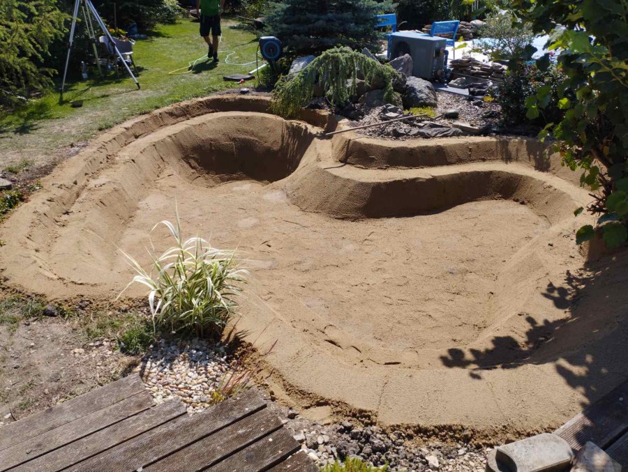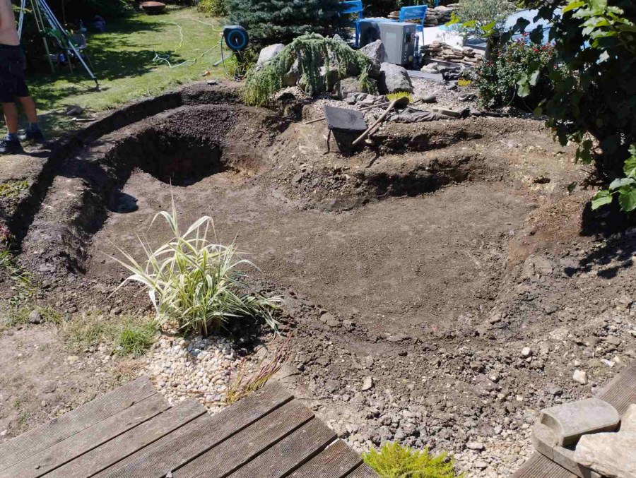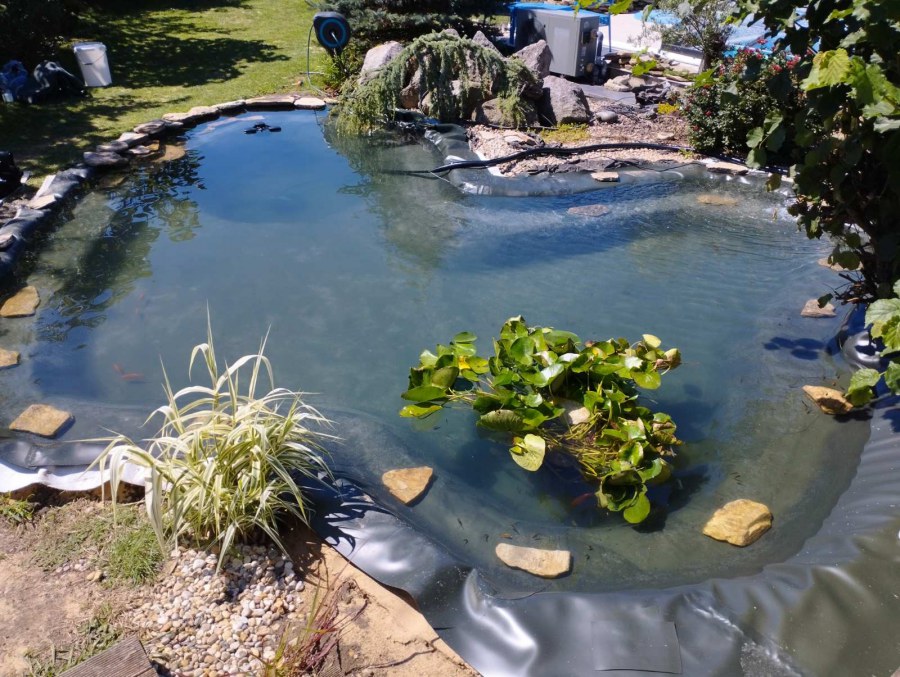 Rekonstrukce tohoto jezírka na klíč probíhala velmi rychle….klient se s žádostí o rekonstrukci trefil do zrovna uvolněného okna v našem kalendáři. Muselo se ale vše velmi rychle domluvit a začít s pracemi. Již za pár dní byl jasný plán prací. Jezírko se muselo vypustit, vylovit ryby, odstranit a uchovat vodní květiny…hlavně lekníny a zlikvidovat starou fólii. Poté se ručně upravil tvar jezírka, prohloubilo se a upravili se pobřežní zóny. Následně se na celý povrch dal kopaný písek, na který se položila geotextílie 500g na kterou se začala navařovat jezírková fólie Fatra Aquaplast 805/V olivově zelená. Po dokončení se mohli dát do pobřežních zón kameny Kubo a zasadit květiny. Hned poté se mohla začít napouštět voda. Technologii jsme zvolili jednoduchou na obsluhu filtr Oase BioSmart Screenmatic2 90000 na něj jsme pověsili UV lampu Oase Bitron C 55W a na dno jezírka jsme dali čerpadlo Jebao ECO FTP 10000, tento systém, jednoduchý na ovládání udrží vodu v jezírku krásně čistou celou sezónu.
