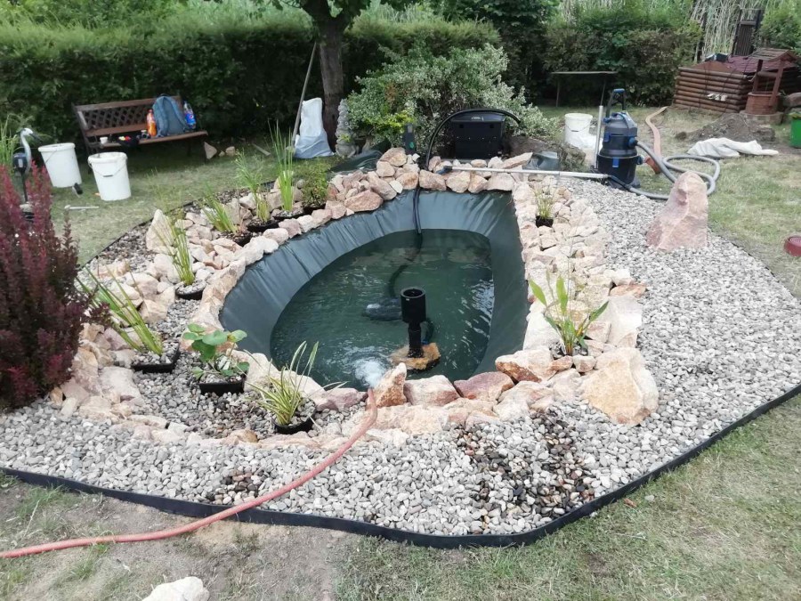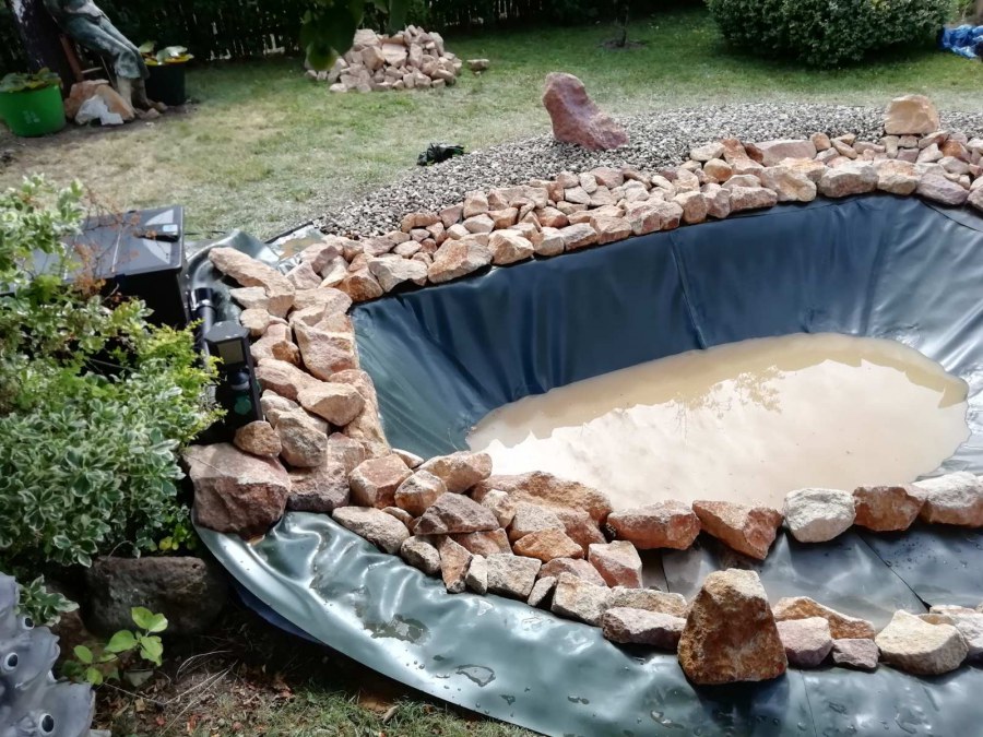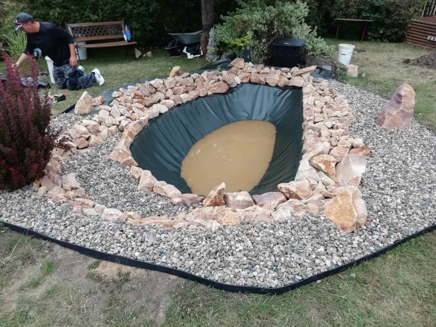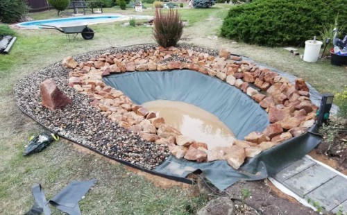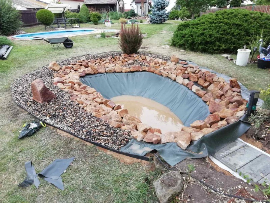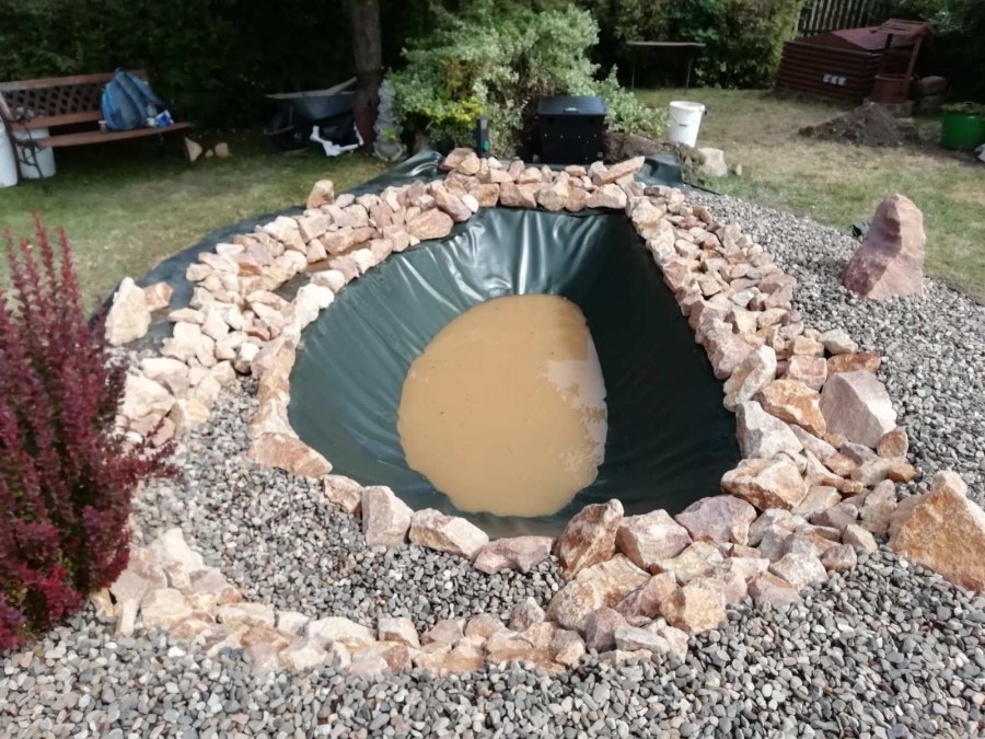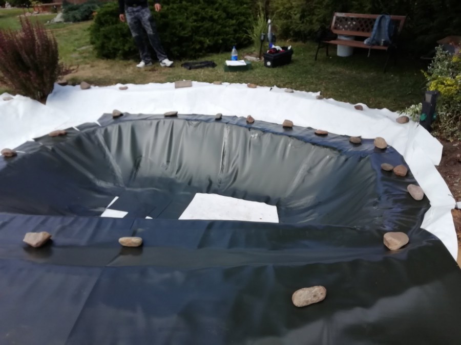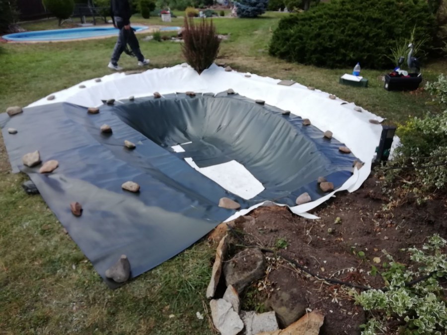 Na začátku prázdnin jsme začali s rekonstrukcí malého okrasného jezírka na chalupě u Žatce. Když jsme přijeli na místo bylo to malé, zarostlé nefunkční jezírko. Nejprve jsme vyčerpali vodu a odstranili starou fólii. Odkryté dno se zarovnalo, upravil se povrch do požadovaného tvaru a pokrylo kopaným pískem. Poté se začalo s pokládkou geotextílie 500g a na ní se ihned svařovala jezírková fólie, Fatra Aquaplast 805/V olivově zelená, dle tvaru jezírka. Po vyfóliování se ihned začala napouštět voda. Mezi tím se přivezli větší kameny a kačírek, okrasné okraje jezírka se vyhranili neviditelnými obrubníky. Do pobřežní zóny se usadili větší kameny a dosypali se menším kačírkem, zasadili se vybrané vodní květiny.