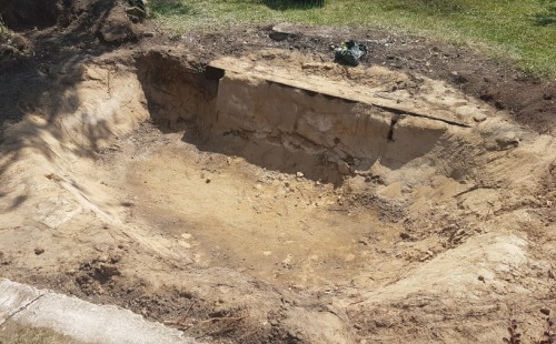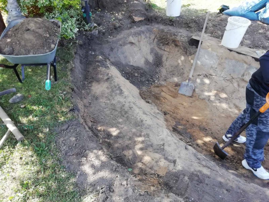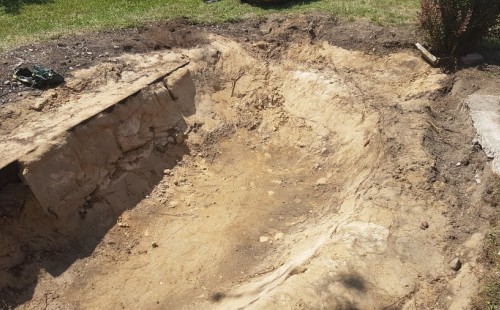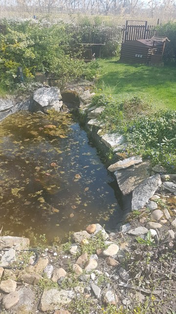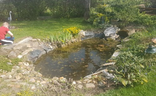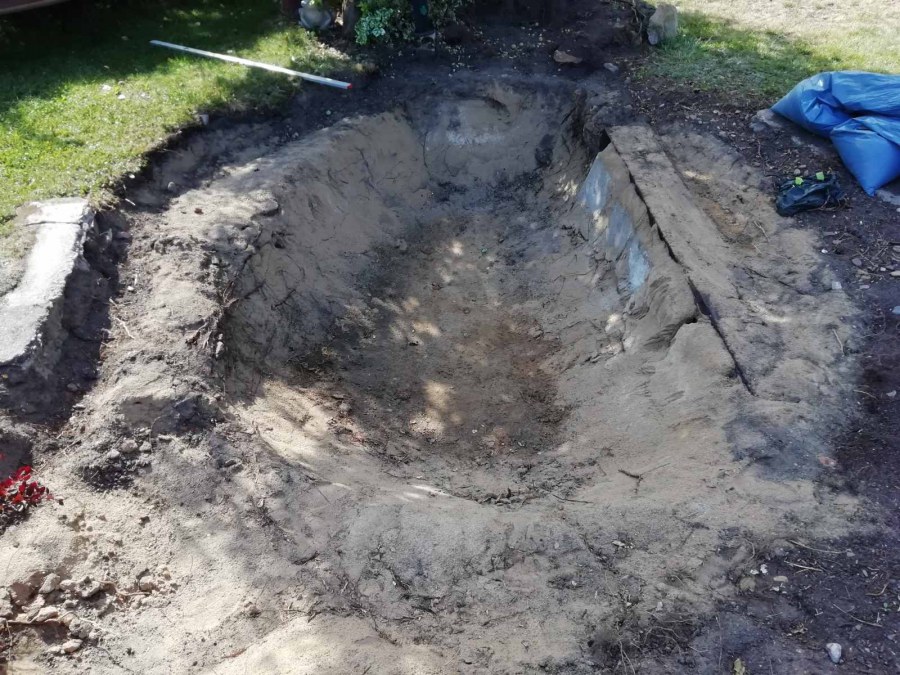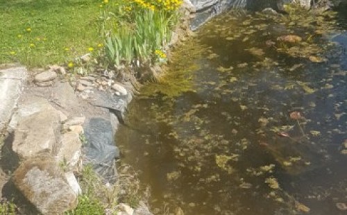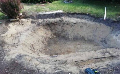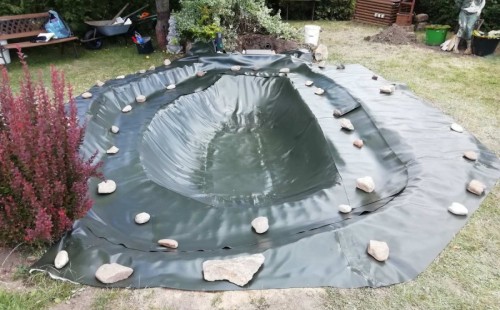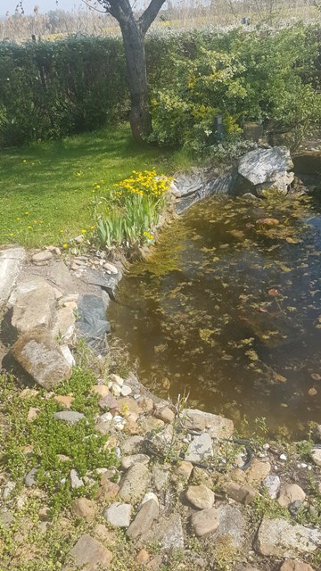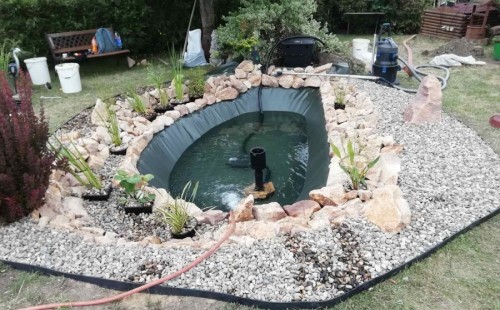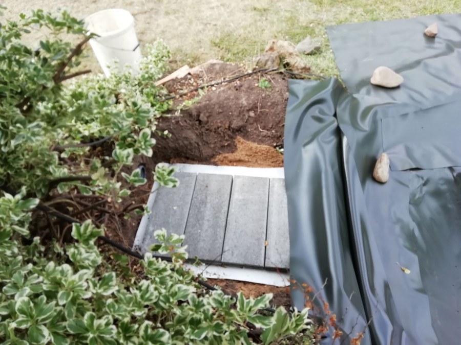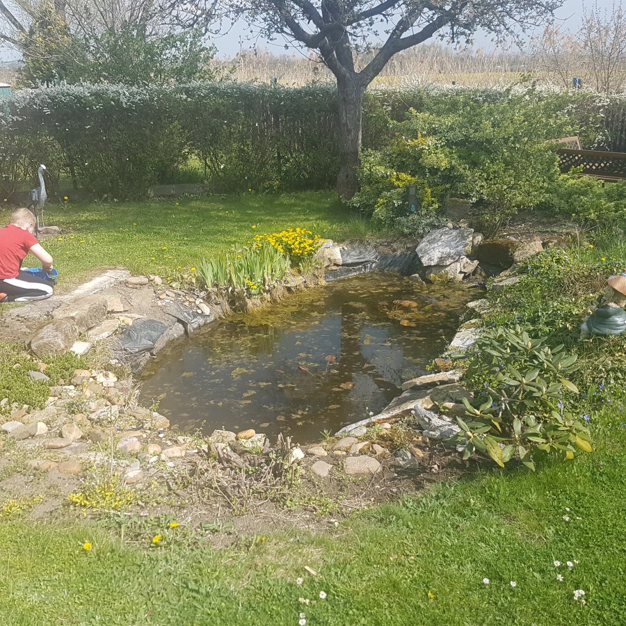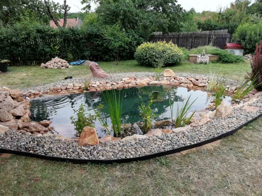Na začátku prázdnin jsme začali s rekonstrukcí malého okrasného jezírka na chalupě u Žatce. Když jsme přijeli na místo bylo to malé, zarostlé nefunkční jezírko. Nejprve jsme vyčerpali vodu a odstranili starou fólii. Odkryté dno se zarovnalo, upravil se povrch do požadovaného tvaru a pokrylo kopaným pískem. Poté se začalo s pokládkou geotextílie 500g a na ní se ihned svařovala jezírková fólie, Fatra Aquaplast 805/V olivově zelená, dle tvaru jezírka. Po vyfóliování se ihned začala napouštět voda. Mezi tím se přivezli větší kameny a kačírek, okrasné okraje jezírka se vyhranili neviditelnými obrubníky. Do pobřežní zóny se usadili větší kameny a dosypali se menším kačírkem, zasadili se vybrané vodní květiny.