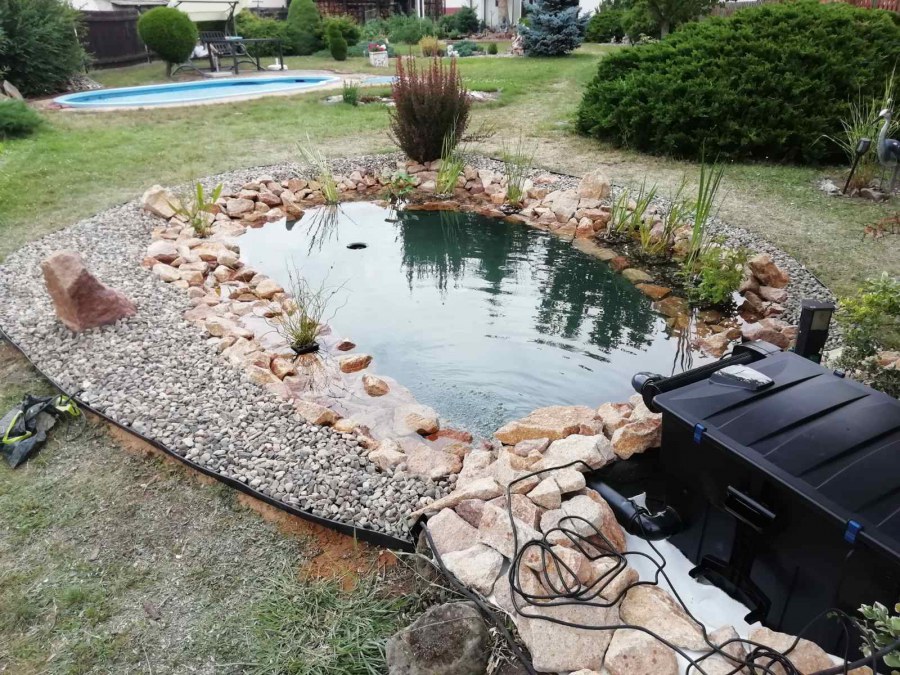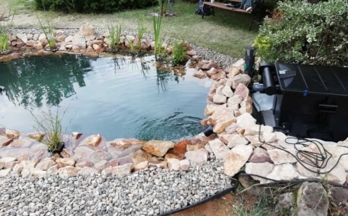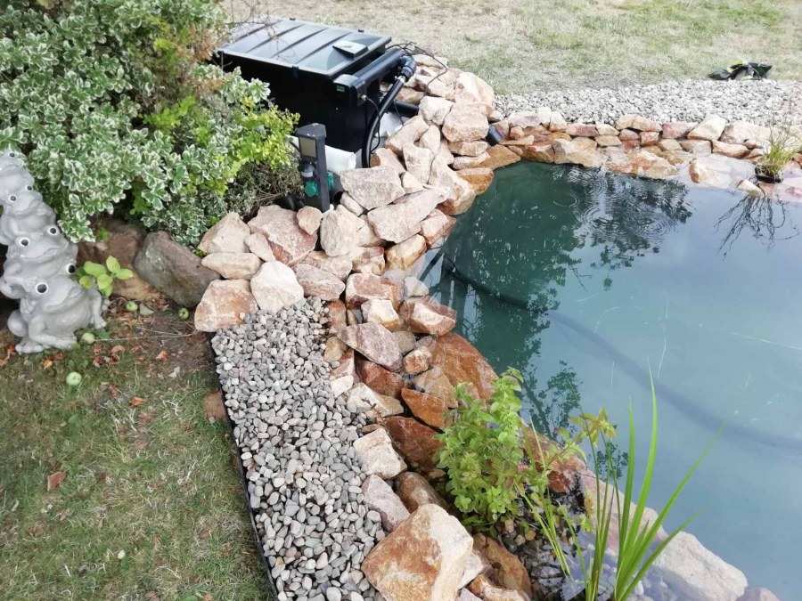 Do pobřežní zóny jezírka se postavil skimmer Oase AquaSkim 40, ten se hadicí napojil na dvouvětvé čerpadlo Oase AquaMax Eco Premium 10000 uložené na dně jezírka. Čerpadlo táhne vodu z jezírka do filtru Oase BioTec ScreenMatic 60000, který stojí na břehu jezírka, na něj je napojená UV lampa Oase Vitronic 36W.
