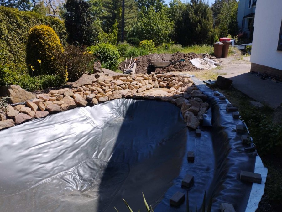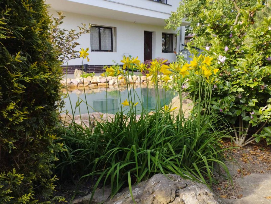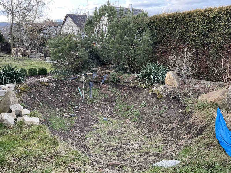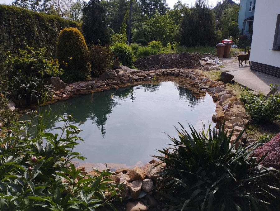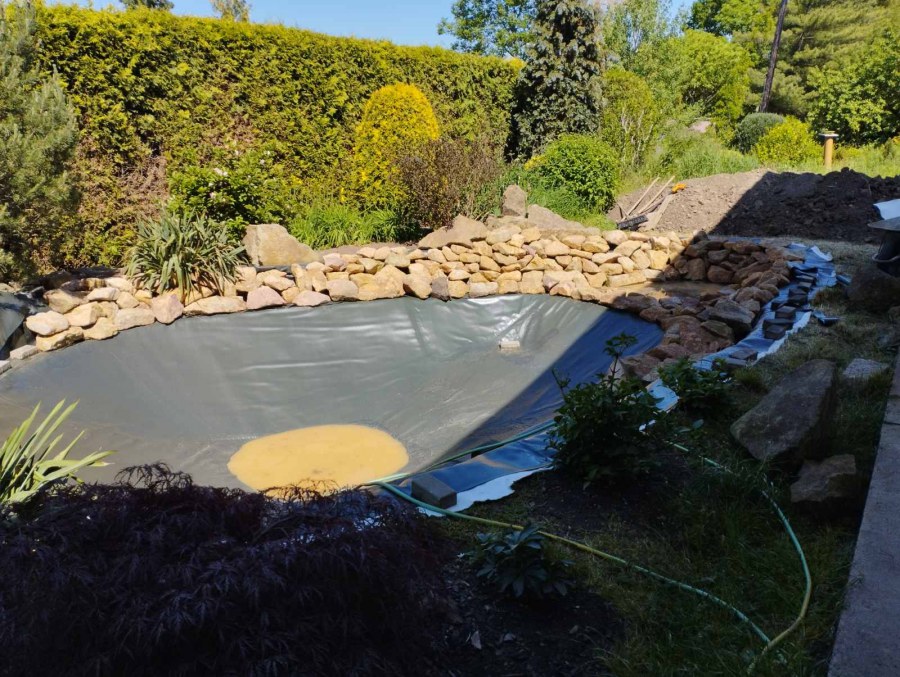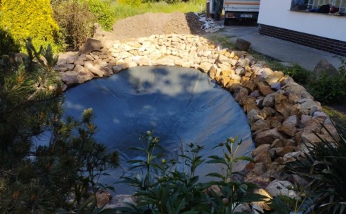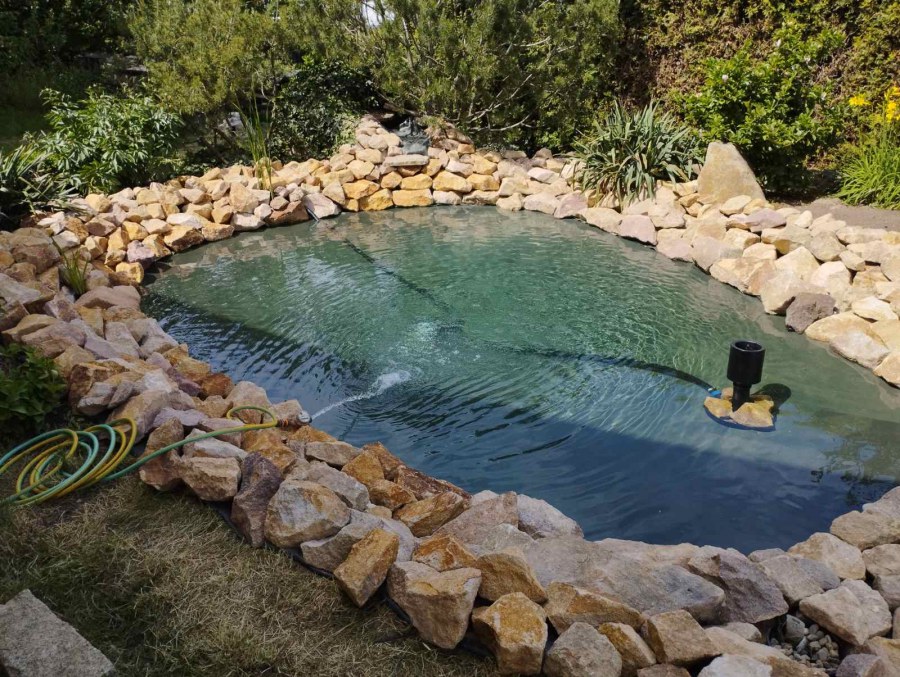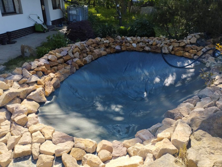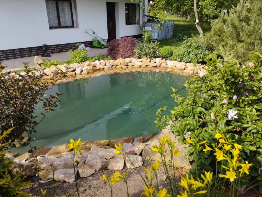 Z jara nás oslovili klienti, kteří měli několik let na zahradě u domu nedokončené jezírko, s tím, že letos by ho už rádi dodělali. Tak jsme se dostali k tomuto malému okrasnému jezírku. Čekala nás spousta práce. Nejprve se musel vyčistit zarostlý, již postavený základ. Odstranila se stará fólie, upravil tvar jezírka, vytvořili se pobřežní zóny, potůček a malý vodopád. Upravený povrch se pokryl kopaným pískem. Po vypískování se mohlo začít s pokládkou jezírkové fólie Fatra Aquaplast 805/V olivově zelená, ta se svařuje na místě dle tvaru jezírka. Po dokončení svařování se do pobřežních zón začali rovnat kameny, usazovat vodní květiny a zároveň napouštět voda. Mezi tím se instalovala technologie. Do pobřežní zóny se postavil skimmer Oase AquaSkim 40, ten se hadicí propojil s dvouvětvým čerpadlem Jebao OEP ECO 12000, které se položilo na dno jezírka. Z čerpadla se poté tahá voda do UV lampy Oase Vitronic 36W která je pověšená na filtraci Oase BioTec ScreenMatic2 60000, z té poté teče čistá voda přes potůček zpět do jezírka.