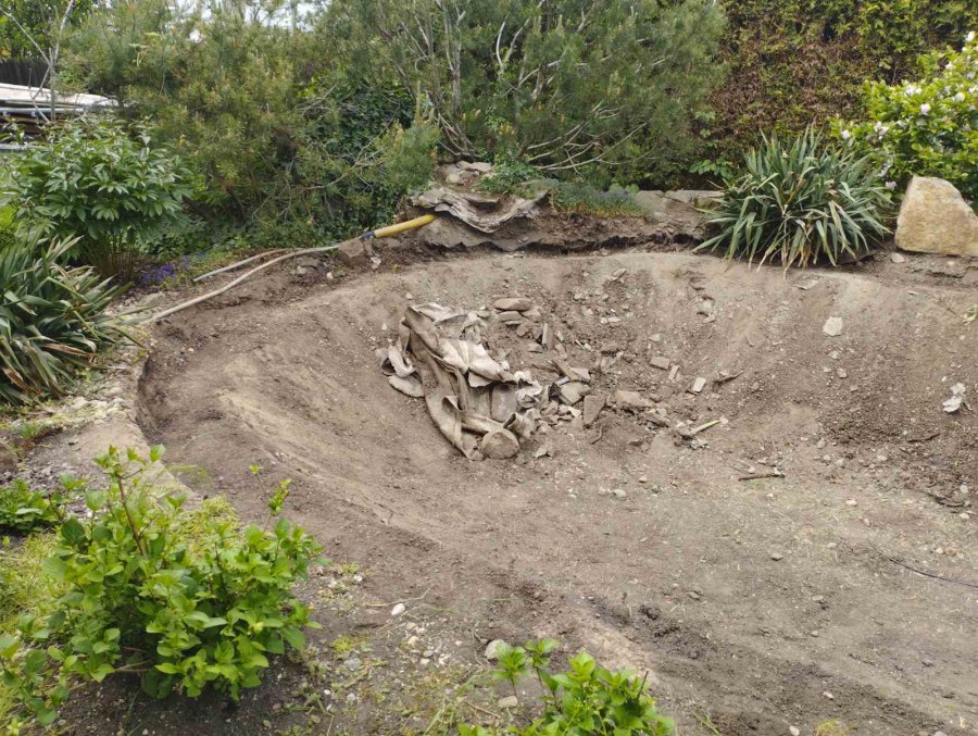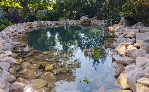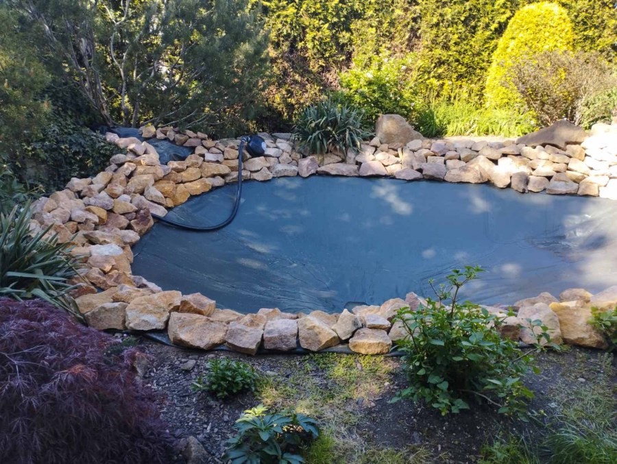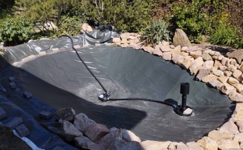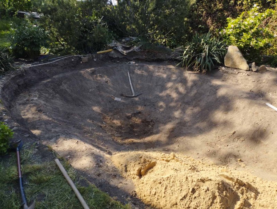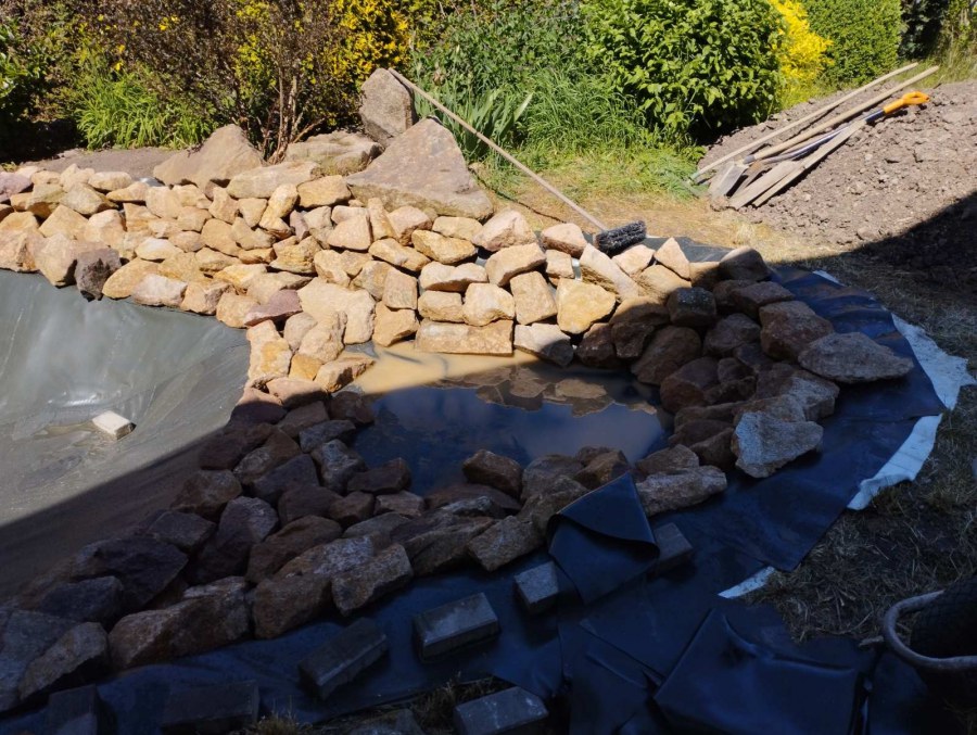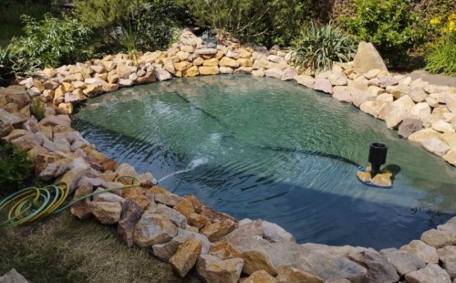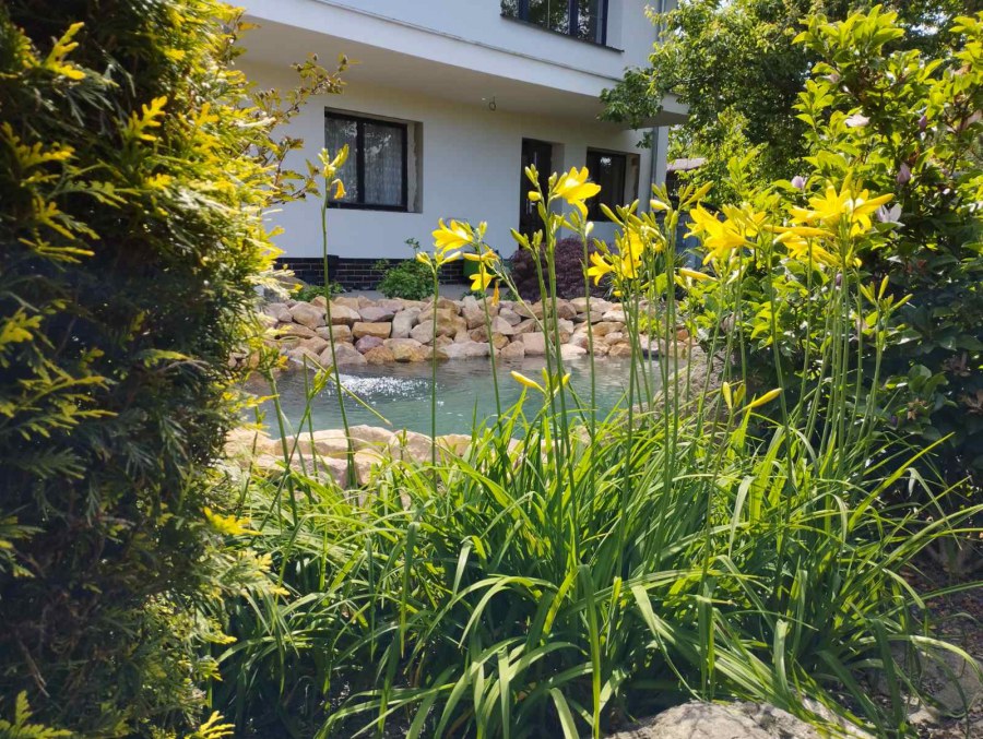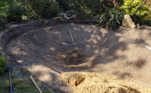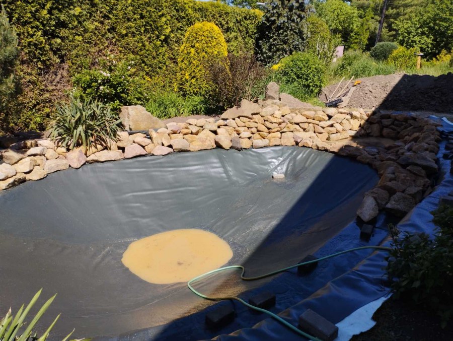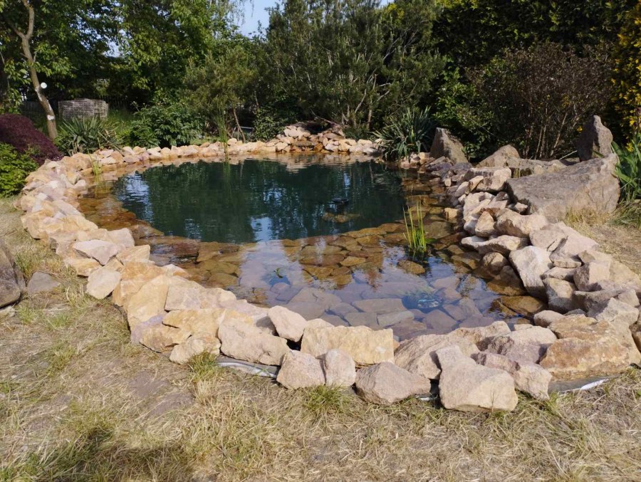 Z jara nás oslovili klienti, kteří měli několik let na zahradě u domu nedokončené jezírko, s tím, že letos by ho už rádi dodělali. Tak jsme se dostali k tomuto malému okrasnému jezírku. Čekala nás spousta práce. Nejprve se musel vyčistit zarostlý, již postavený základ. Odstranila se stará fólie, upravil tvar jezírka, vytvořili se pobřežní zóny, potůček a malý vodopád. Upravený povrch se pokryl kopaným pískem. Po vypískování se mohlo začít s pokládkou jezírkové fólie Fatra Aquaplast 805/V olivově zelená, ta se svařuje na místě dle tvaru jezírka. Po dokončení svařování se do pobřežních zón začali rovnat kameny, usazovat vodní květiny a zároveň napouštět voda. Mezi tím se instalovala technologie. Do pobřežní zóny se postavil skimmer Oase AquaSkim 40, ten se hadicí propojil s dvouvětvým čerpadlem Jebao OEP ECO 12000, které se položilo na dno jezírka. Z čerpadla se poté tahá voda do UV lampy Oase Vitronic 36W která je pověšená na filtraci Oase BioTec ScreenMatic2 60000, z té poté teče čistá voda přes potůček zpět do jezírka.