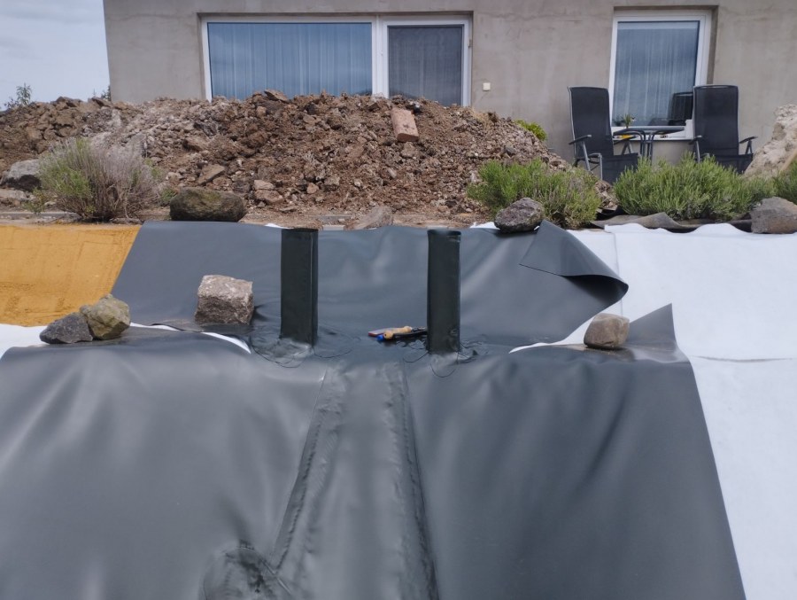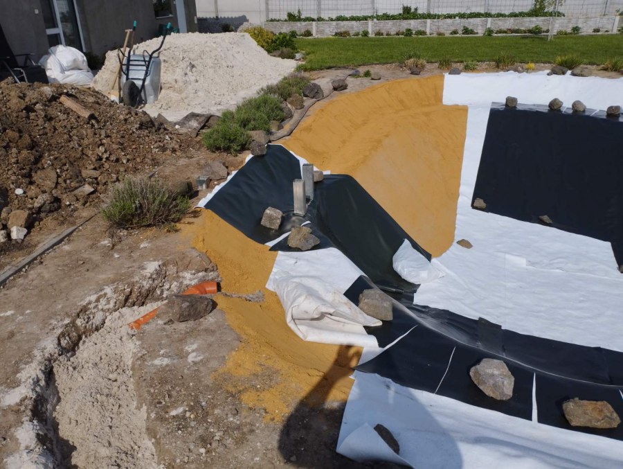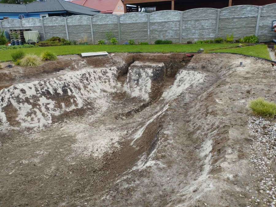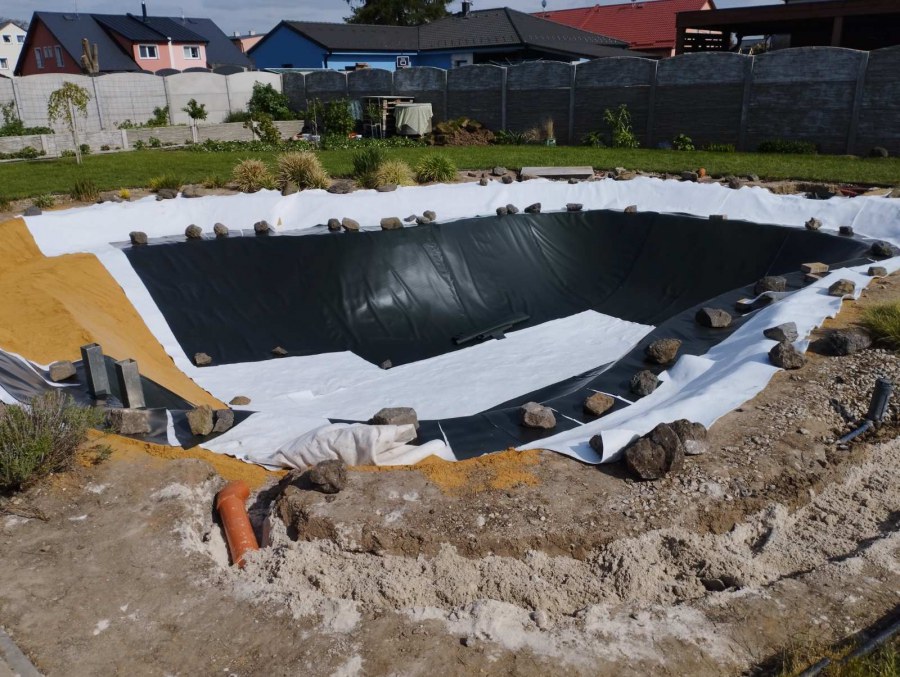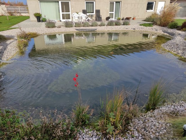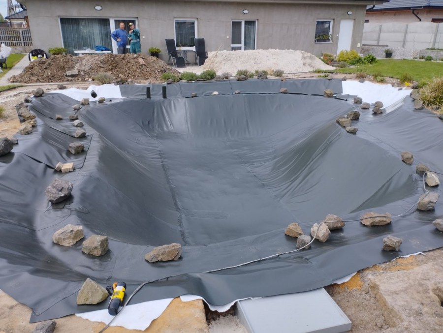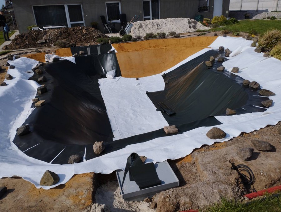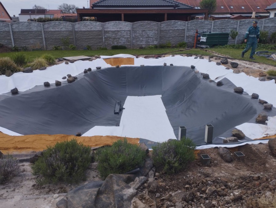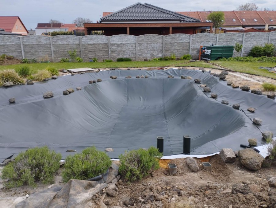 Letos jsme zvětšovali stávající jezírko u rodinného domu. Klient si svépomocí provedl likvidaci, vypustil vodu, odstranil květiny, kameny a starou fólii. Po konzultaci s našimi techniky upravil jezírko do požadovaného tvaru, zabetonoval spodní vpusť- gulu, připravil fóliovou přírubu na skimmer Oase AquaSkim Gravity, zapustil čerpadlovou šachtu a vyvedl k ní potrubí. Připravil také vývod čisté vody z filtru do jezírka. Poté se dno pokrylo kopaným pískem a pak už mohli naši technici začít s pokládkou jezírkové fólie. Nejprve se položila geotextílie 500g a na ní se začala navařovat fólie Fatra Aquaplast 805/V olivově zelená, dle tvaru jezírka. Poté připojili technologii. Po domluvě s majitelem jsme zvolili systém s čerpadlovou šachtou, kdy jde voda gulí a skimmerem do šachty gravitačně a odtud je přečerpávána systémovým čerpadlem AquaForte O-Series 16000 do filtru Tripond Vortex Center C-80, na něj je napojena UV lampa TMC Pro Clear 110W. Z filtru teče voda samospádem zpět do jezírka.