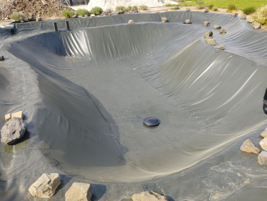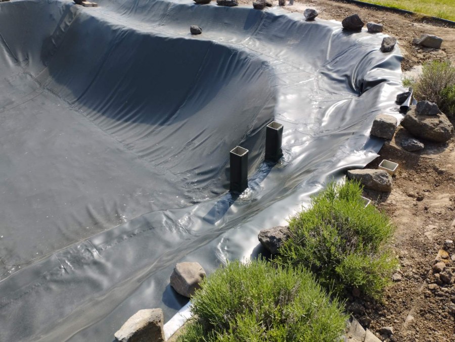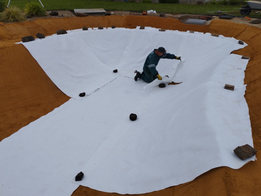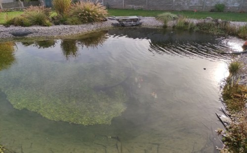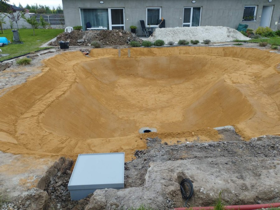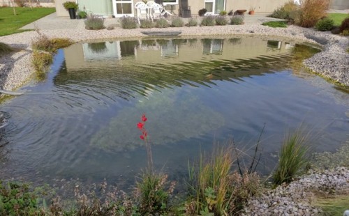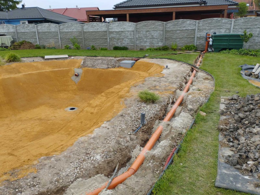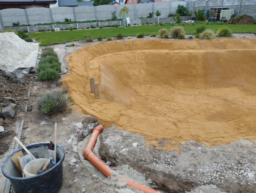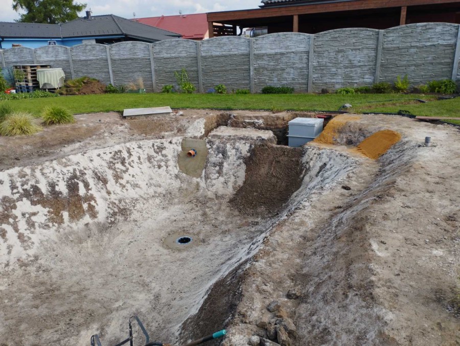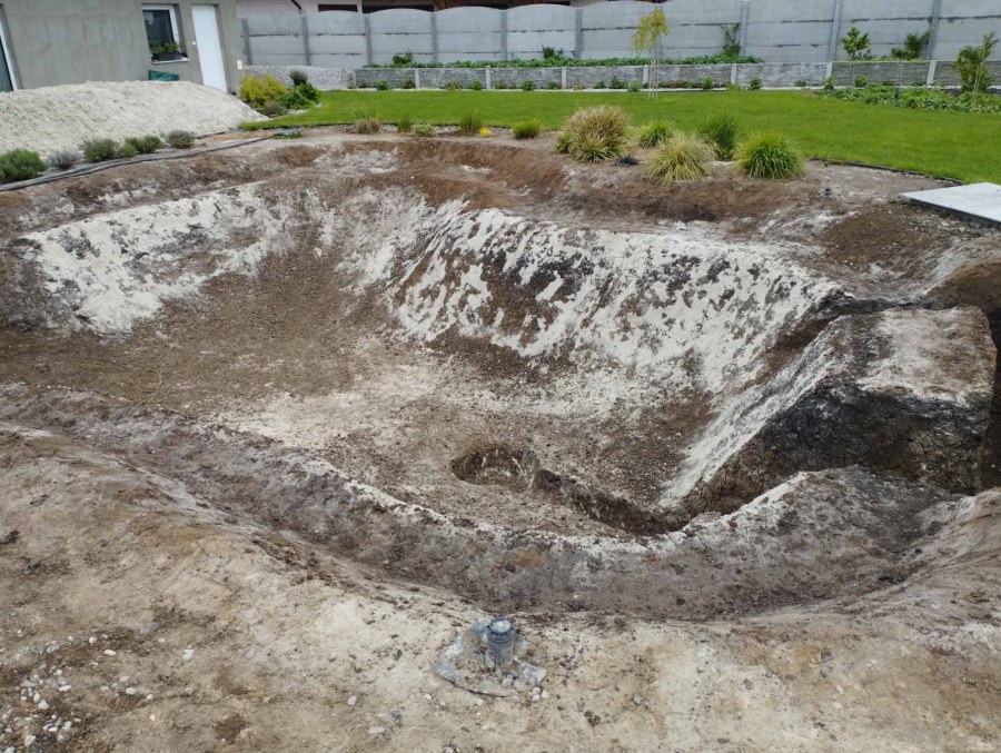 Letos jsme zvětšovali stávající jezírko u rodinného domu. Klient si svépomocí provedl likvidaci, vypustil vodu, odstranil květiny, kameny a starou fólii. Po konzultaci s našimi techniky upravil jezírko do požadovaného tvaru, zabetonoval spodní vpusť- gulu, připravil fóliovou přírubu na skimmer Oase AquaSkim Gravity, zapustil čerpadlovou šachtu a vyvedl k ní potrubí. Připravil také vývod čisté vody z filtru do jezírka. Poté se dno pokrylo kopaným pískem a pak už mohli naši technici začít s pokládkou jezírkové fólie. Nejprve se položila geotextílie 500g a na ní se začala navařovat fólie Fatra Aquaplast 805/V olivově zelená, dle tvaru jezírka. Poté připojili technologii. Po domluvě s majitelem jsme zvolili systém s čerpadlovou šachtou, kdy jde voda gulí a skimmerem do šachty gravitačně a odtud je přečerpávána systémovým čerpadlem AquaForte O-Series 16000 do filtru Tripond Vortex Center C-80, na něj je napojena UV lampa TMC Pro Clear 110W. Z filtru teče voda samospádem zpět do jezírka.