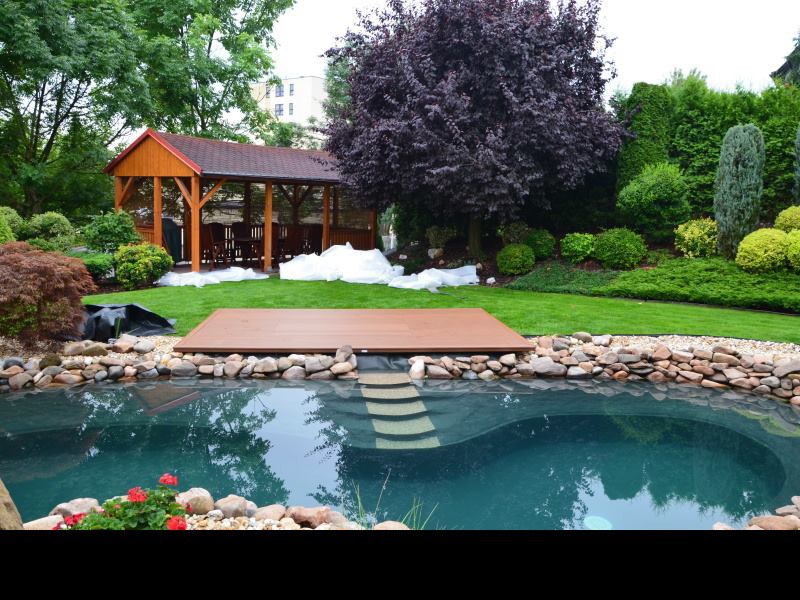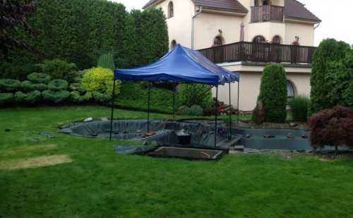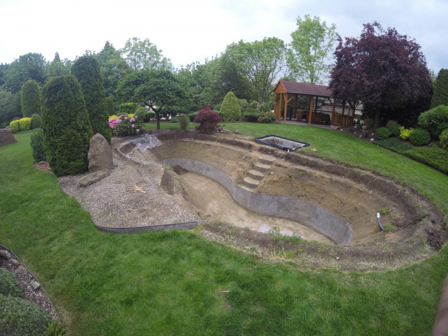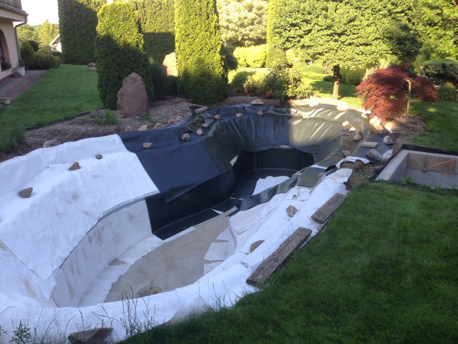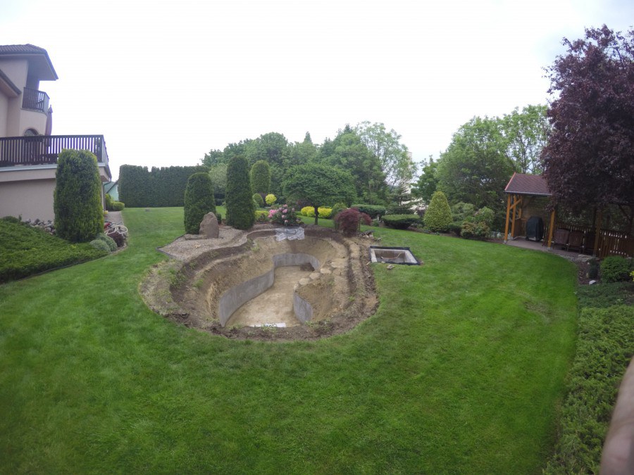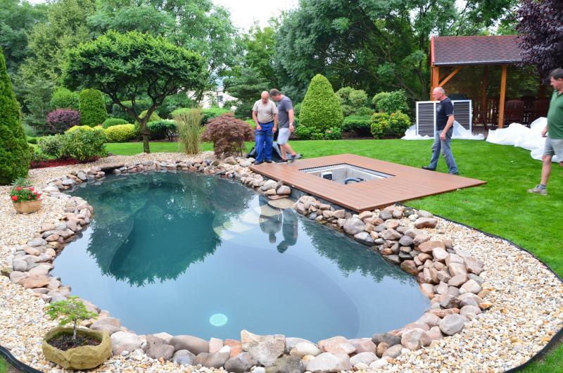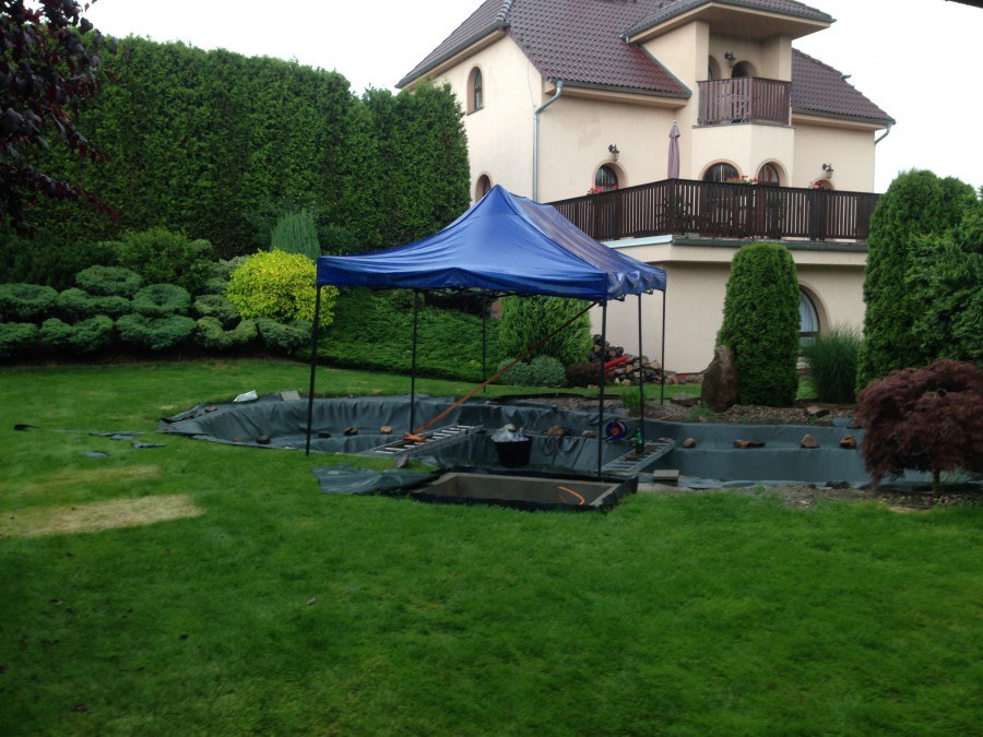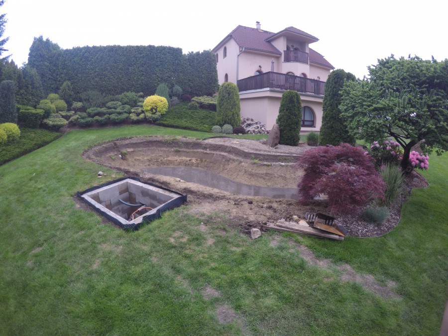 Zákazník si přál vystavět na své okrasné zahradě koupací jezírko s bazénovou technologií. Uprostřed této okrasné zahrady byl vytvořen požadovaný tvar a začalo se s výkopem jezírka + technické místnosti na bazénovou technologii. Položilo se potřebné potrubí pro technologii a zabetonovala se dno celého jezírka a spodní část stěn. Natáhla se geotextílie 500g, připevnila se speciální poplastovaná lišta a začala se svařovat fólie Fatra Aquaplast 805 1,5mm. Uprostřed jezírka byly vytvořeny schůdky, ty se po vyfóliování ještě polepily kamínkovou fólií. Pro tento systém bylo navrženo: bazénový filtr Azur Kit a čerpadlo Preva, 2x, podlahová tryska Kripsol, bazénová spodní gula a skimmer. Plastovou terasu přes technickou místnost dodávala firma NMC CZECH s.ro., kterou Vám vřele doporučujeme.