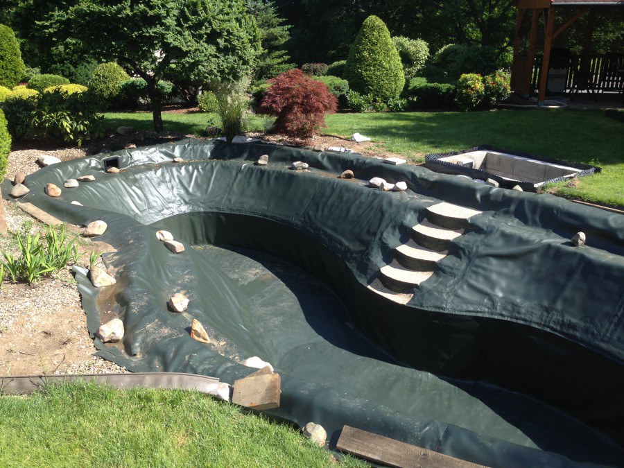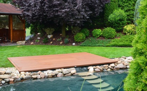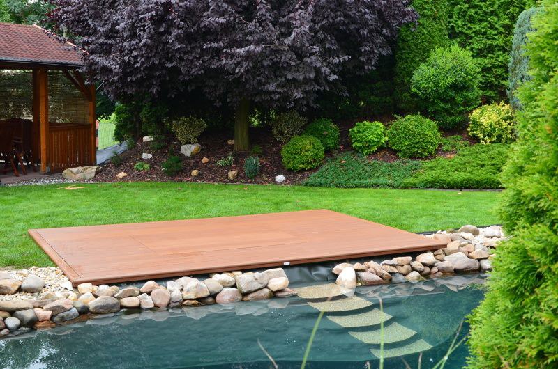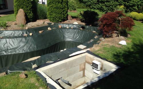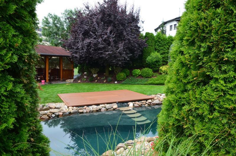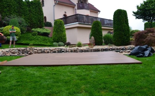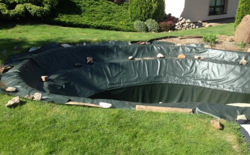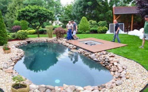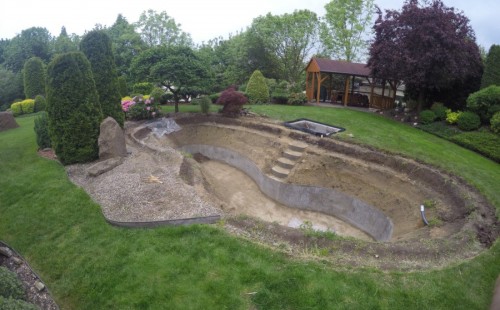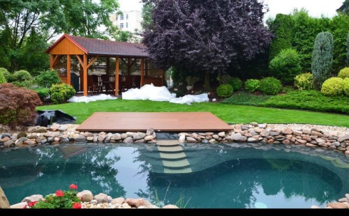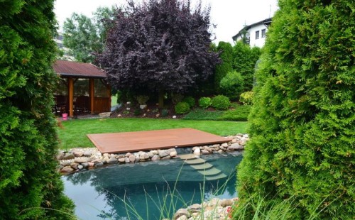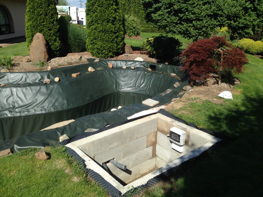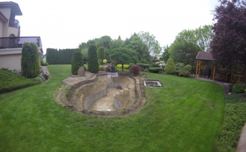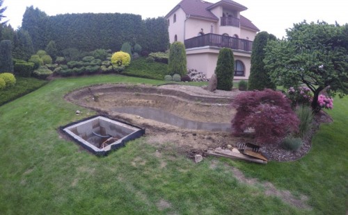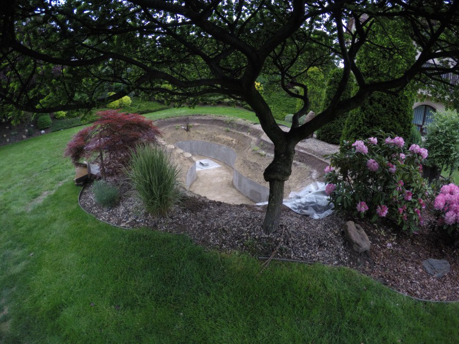 Zákazník si přál vystavět na své okrasné zahradě koupací jezírko s bazénovou technologií. Uprostřed této okrasné zahrady byl vytvořen požadovaný tvar a začalo se s výkopem jezírka + technické místnosti na bazénovou technologii. Položilo se potřebné potrubí pro technologii a zabetonovala se dno celého jezírka a spodní část stěn. Natáhla se geotextílie 500g, připevnila se speciální poplastovaná lišta a začala se svařovat fólie Fatra Aquaplast 805 1,5mm. Uprostřed jezírka byly vytvořeny schůdky, ty se po vyfóliování ještě polepily kamínkovou fólií. Pro tento systém bylo navrženo: bazénový filtr Azur Kit a čerpadlo Preva, 2x, podlahová tryska Kripsol, bazénová spodní gula a skimmer. Plastovou terasu přes technickou místnost dodávala firma NMC CZECH s.ro., kterou Vám vřele doporučujeme.