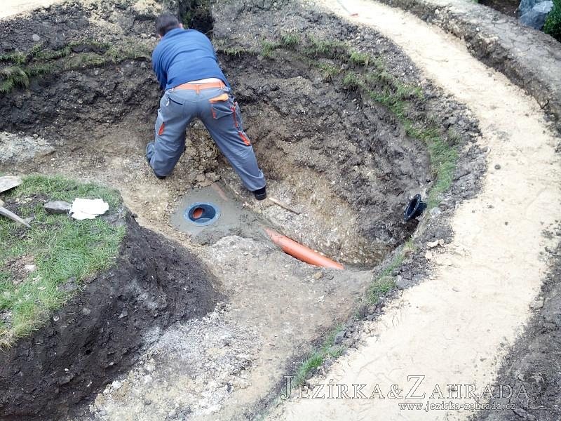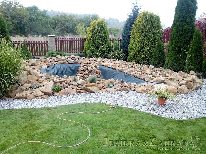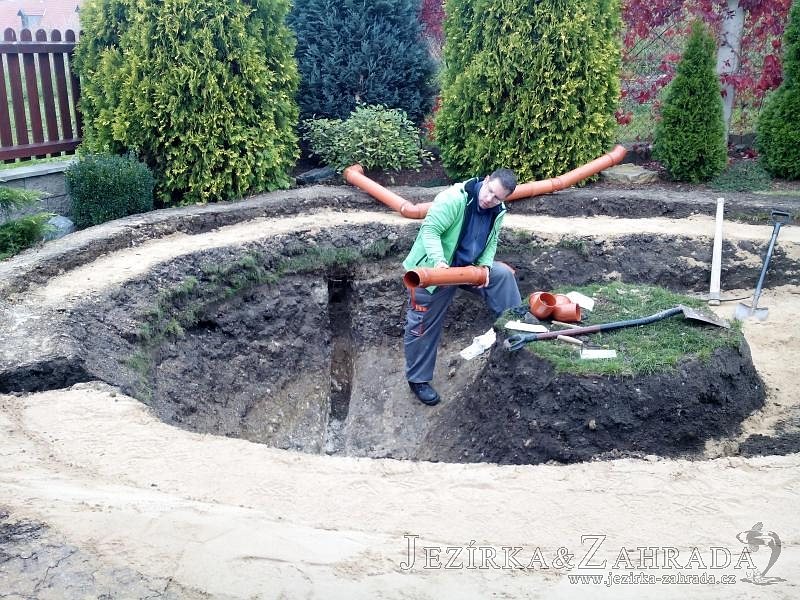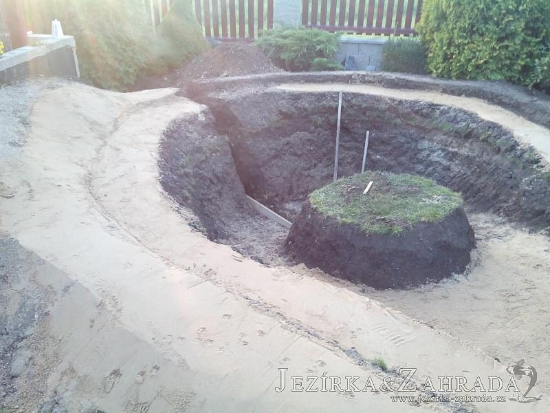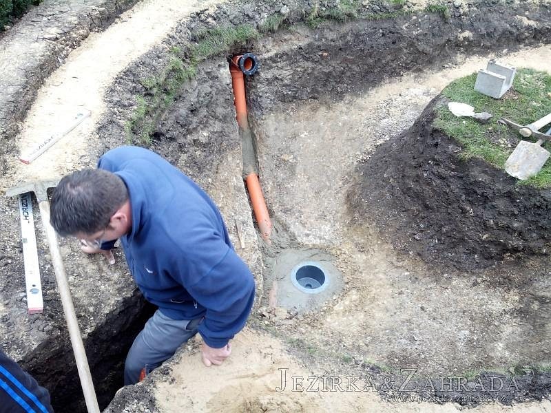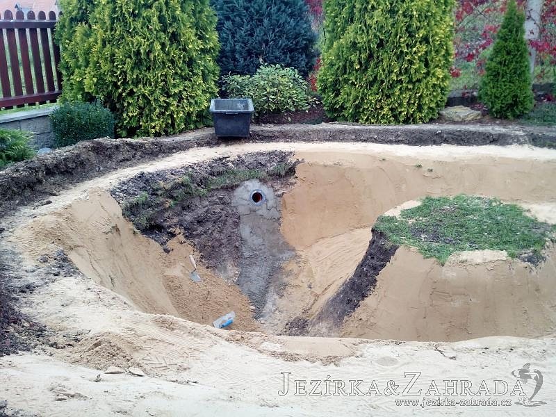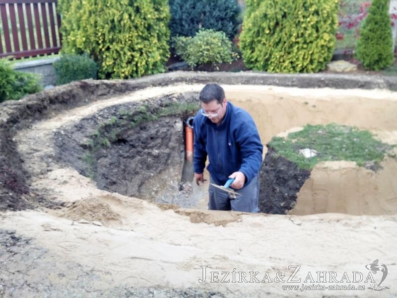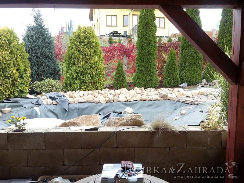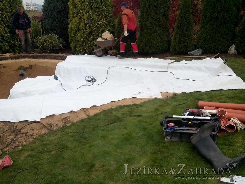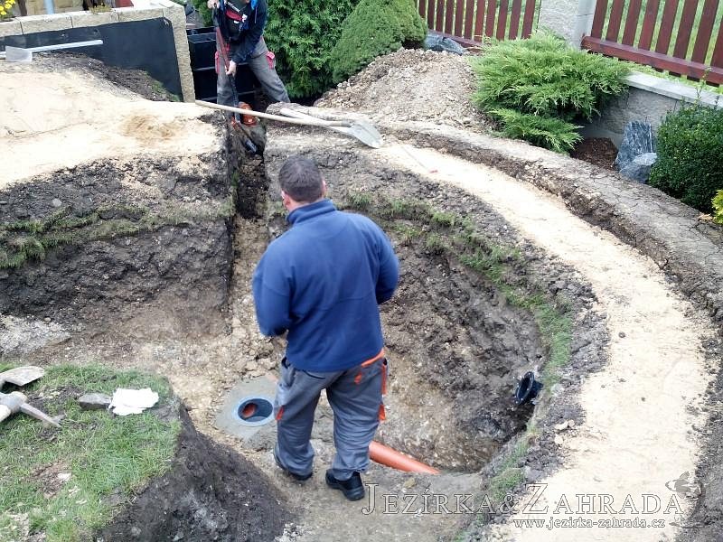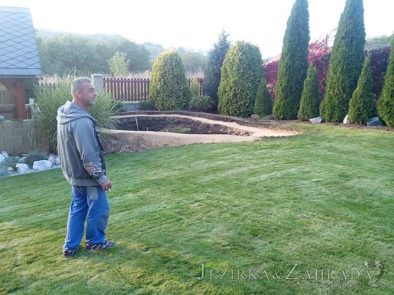 Tato realizace jezírka byla jedna z nejrychleji postavených jezírek. Zákazník se shlédl v jezírku, které máme vystavěno u naší firmy v Okružní ul. v Mostě. Ihned si sjednal schůzku s p. Studentem, kde došlo k navržení technologie a postupu prací. Odpoledne se začalo s vytíčením jezírka a následně i s výkopem. Cca. za 2 dny bylo jezírko připraveno pro položení spodní vpusti-gule, do stěny se připevnila fóliová příruba pro skimmer Oase Aquaskim Gravity. Následně se jezírko vypískovalo kopaným pískem, položila se geotextílie 500g a začalo se s pokládkou jezírkové fólie Fatra Aquaplast 805 1,5mm olivově zelené. Navržená technologie: průtokový filtr Oase BioTec 30, UV lampa Oase Bitron C 72W, čerpadlo na systém Jebao ECO-FTP 6500, čerpadlo na efekty Jebao ECO-FTP 8500, vzduchovací motor Hailea HAP-60 a osvětlovací set Oase LunAqua Classic LED set 3. Po zapojení technologie si klient dotvořil jezírko kameny a osázel květinami. Celé jezírko bylo dokončeno cca. za týden.