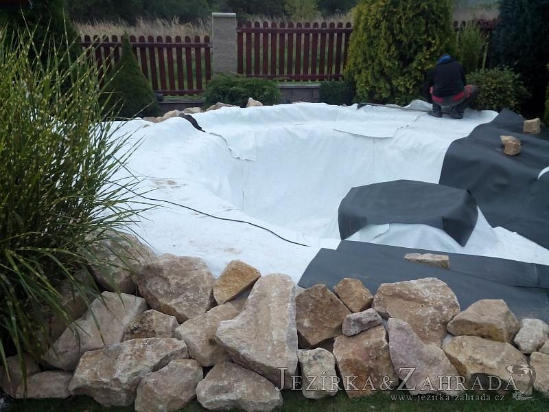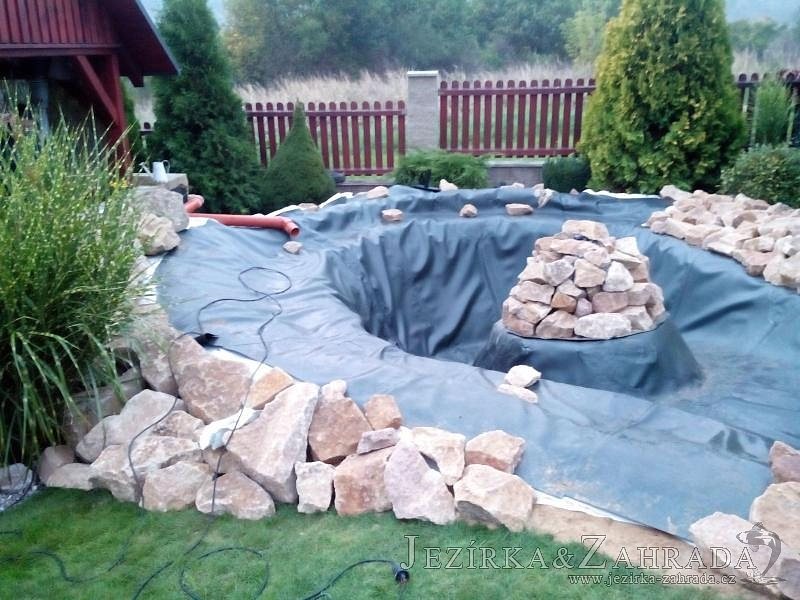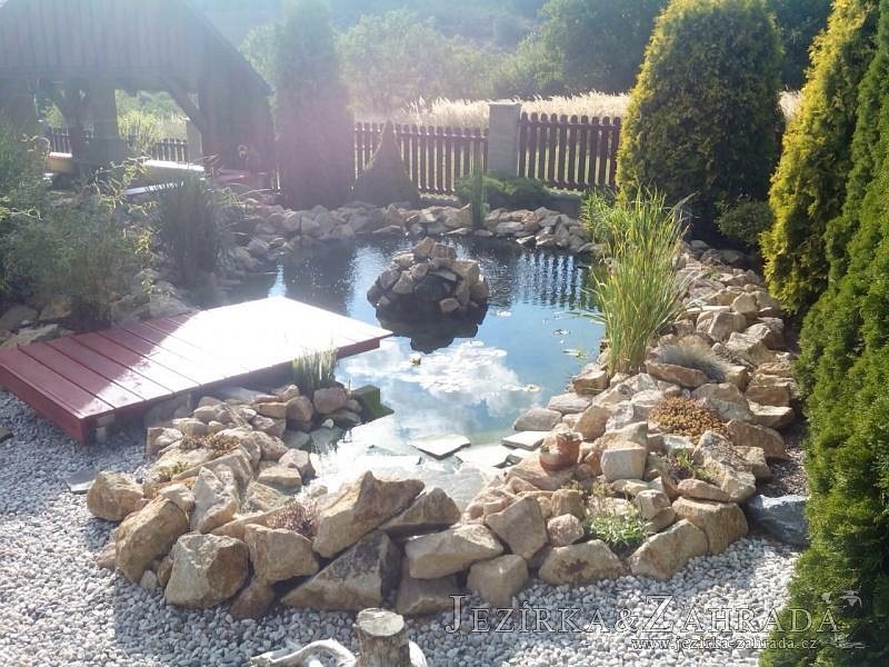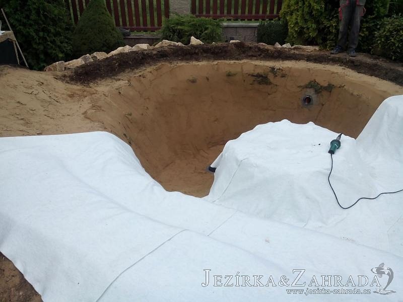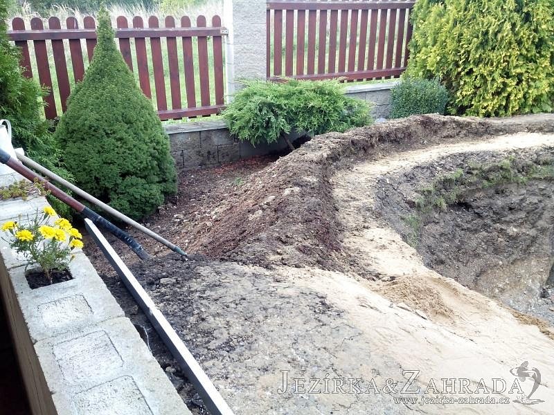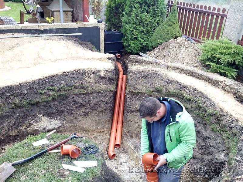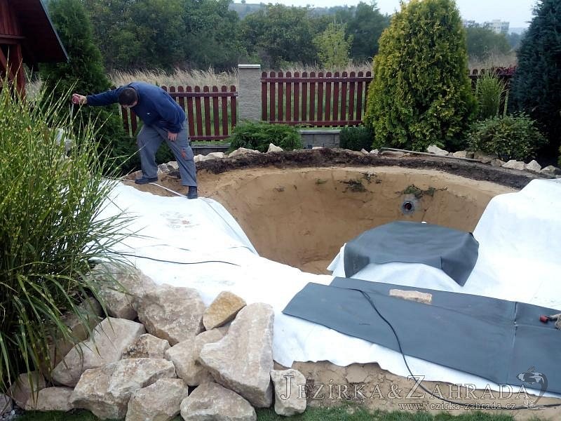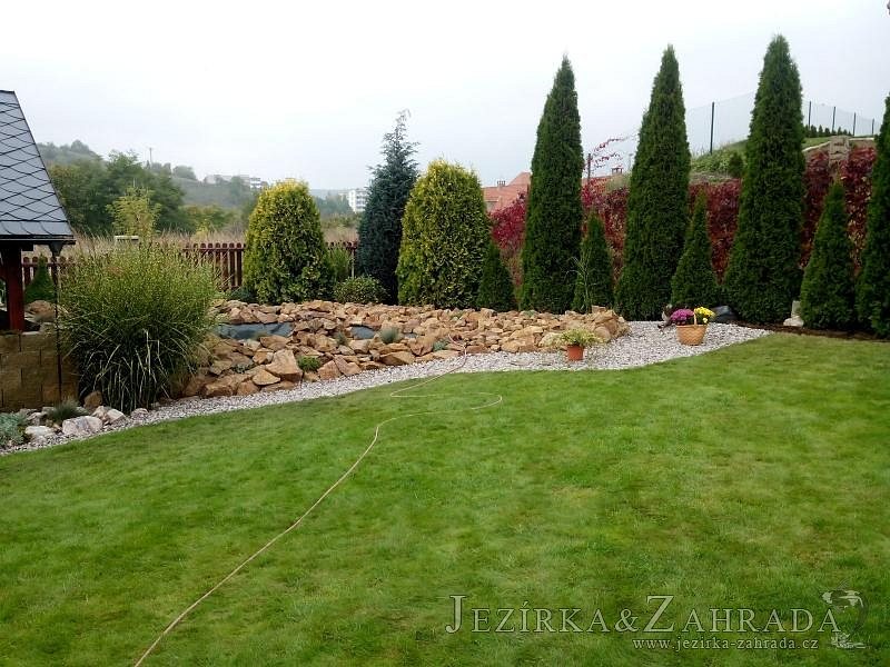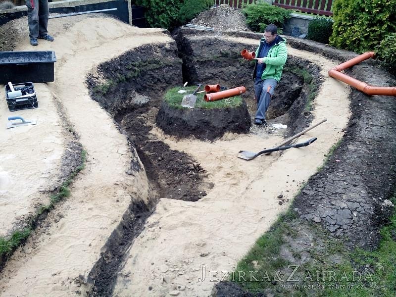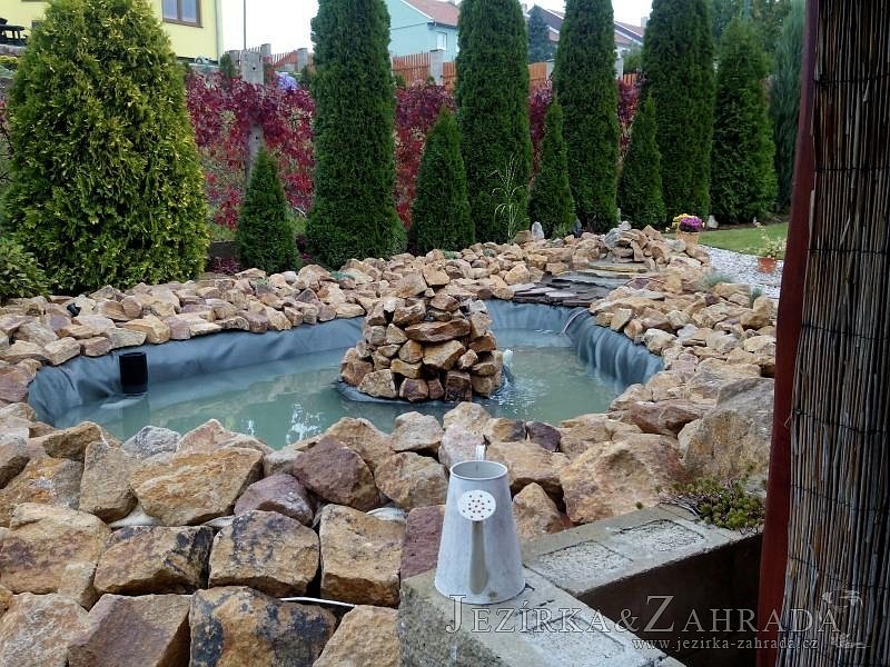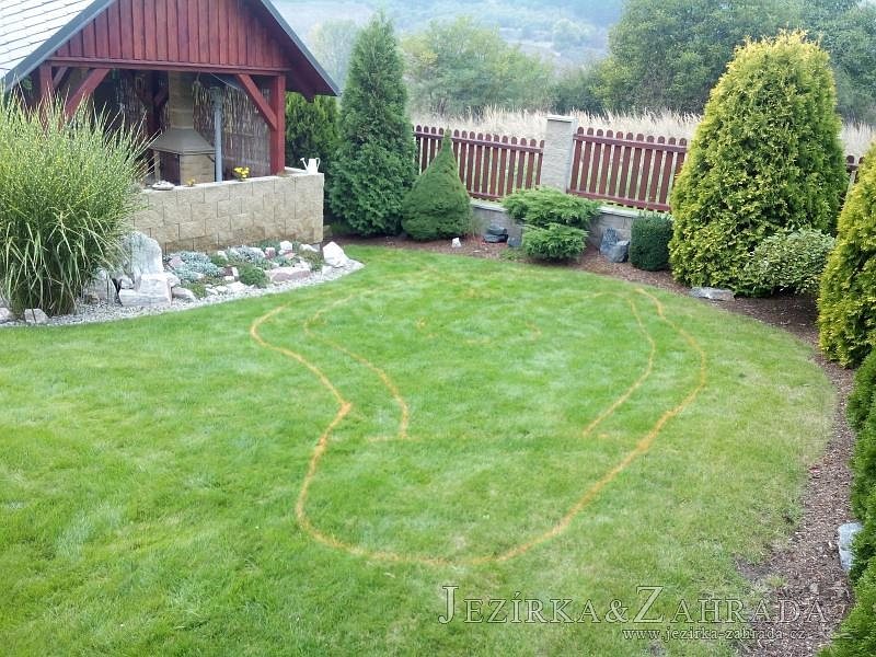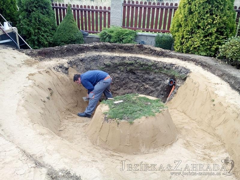 Tato realizace jezírka byla jedna z nejrychleji postavených jezírek. Zákazník se shlédl v jezírku, které máme vystavěno u naší firmy v Okružní ul. v Mostě. Ihned si sjednal schůzku s p. Studentem, kde došlo k navržení technologie a postupu prací. Odpoledne se začalo s vytíčením jezírka a následně i s výkopem. Cca. za 2 dny bylo jezírko připraveno pro položení spodní vpusti-gule, do stěny se připevnila fóliová příruba pro skimmer Oase Aquaskim Gravity. Následně se jezírko vypískovalo kopaným pískem, položila se geotextílie 500g a začalo se s pokládkou jezírkové fólie Fatra Aquaplast 805 1,5mm olivově zelené. Navržená technologie: průtokový filtr Oase BioTec 30, UV lampa Oase Bitron C 72W, čerpadlo na systém Jebao ECO-FTP 6500, čerpadlo na efekty Jebao ECO-FTP 8500, vzduchovací motor Hailea HAP-60 a osvětlovací set Oase LunAqua Classic LED set 3. Po zapojení technologie si klient dotvořil jezírko kameny a osázel květinami. Celé jezírko bylo dokončeno cca. za týden.