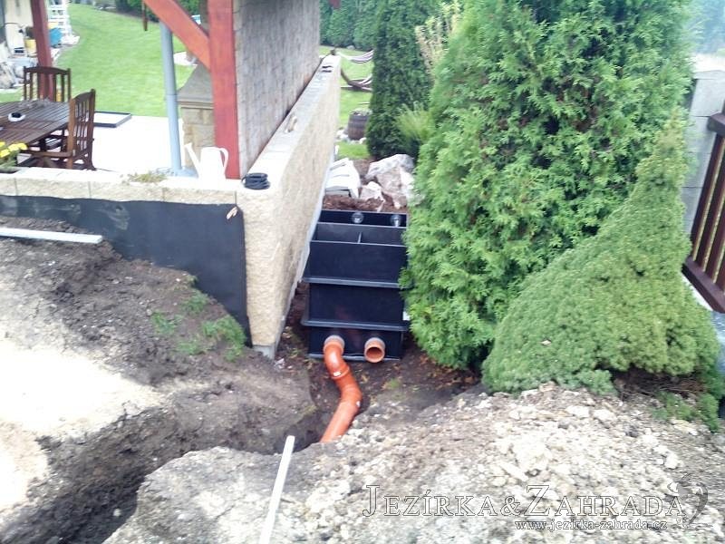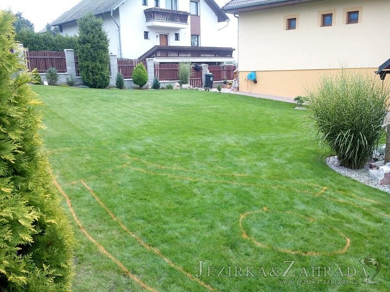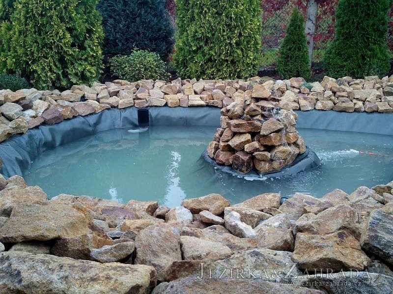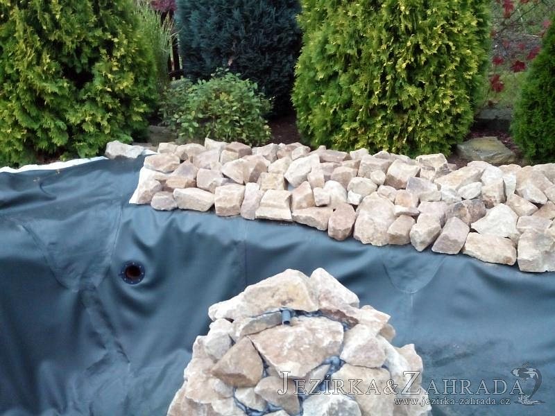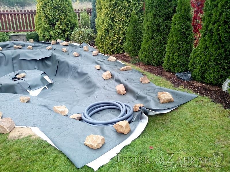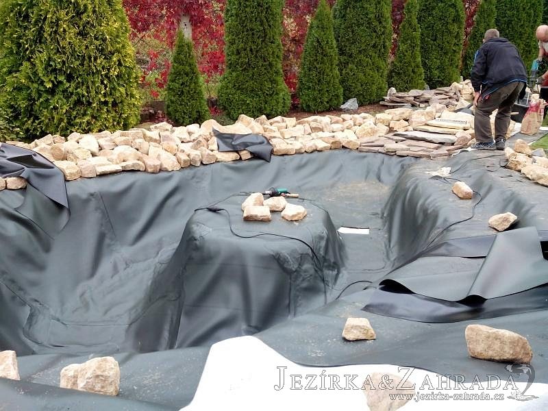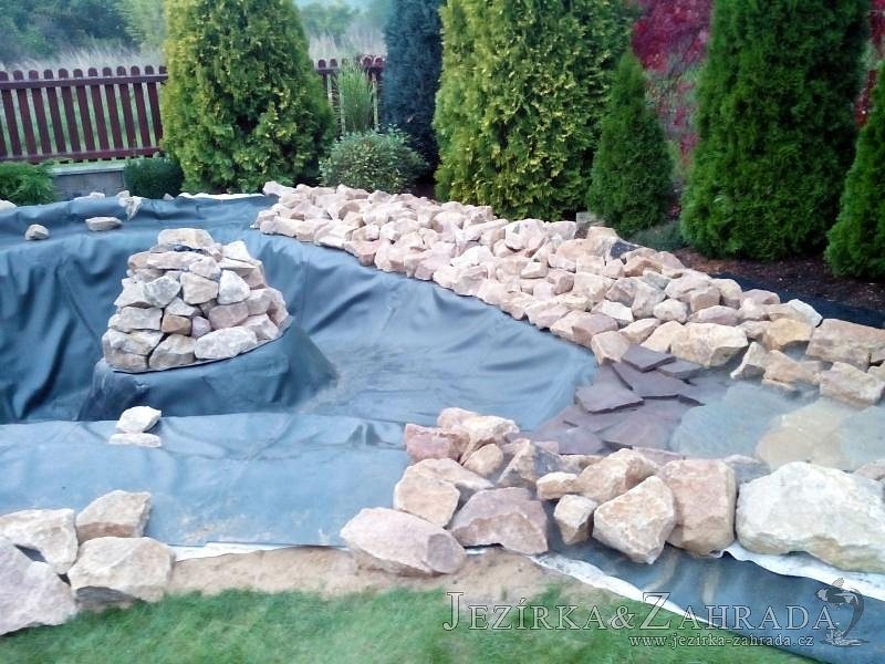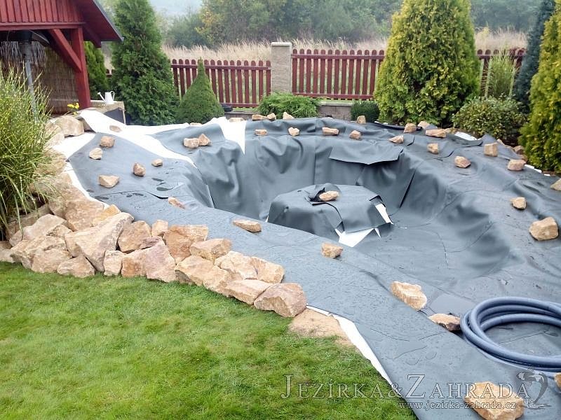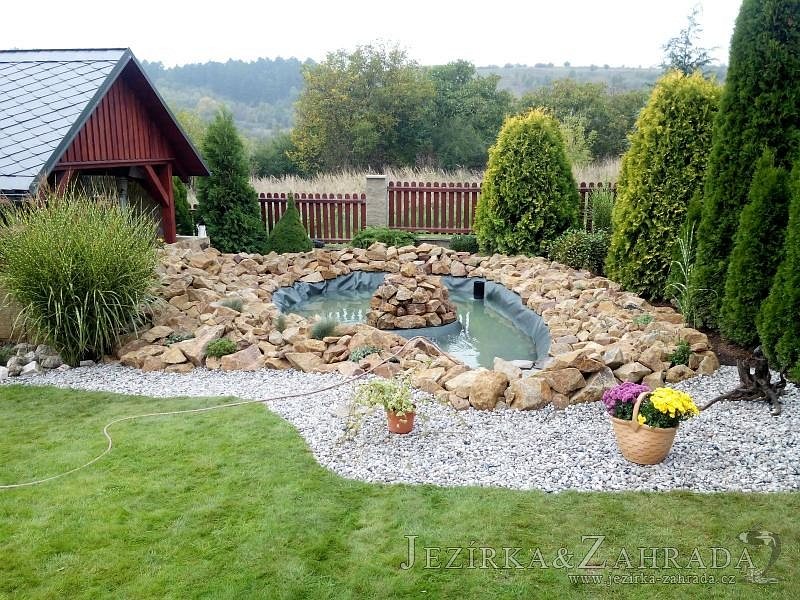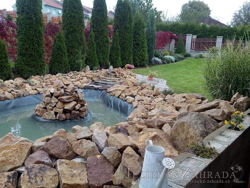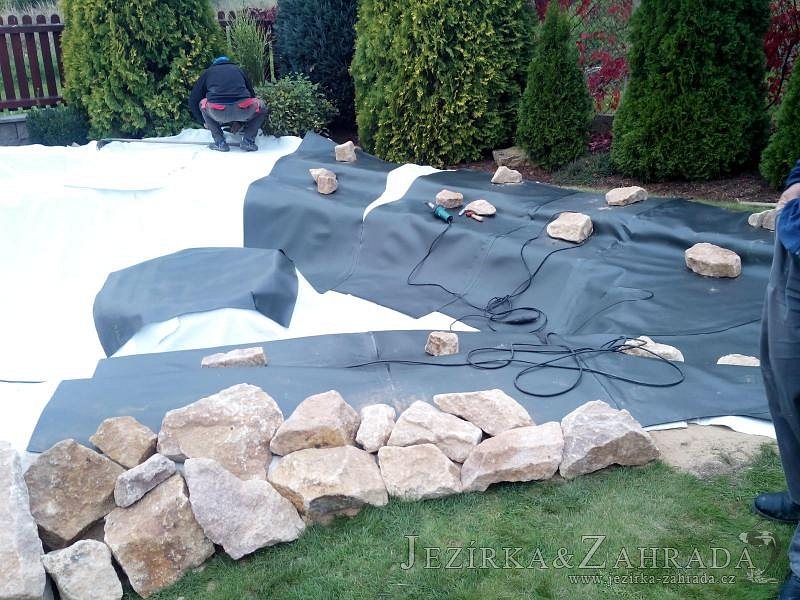 Tato realizace jezírka byla jedna z nejrychleji postavených jezírek. Zákazník se shlédl v jezírku, které máme vystavěno u naší firmy v Okružní ul. v Mostě. Ihned si sjednal schůzku s p. Studentem, kde došlo k navržení technologie a postupu prací. Odpoledne se začalo s vytíčením jezírka a následně i s výkopem. Cca. za 2 dny bylo jezírko připraveno pro položení spodní vpusti-gule, do stěny se připevnila fóliová příruba pro skimmer Oase Aquaskim Gravity. Následně se jezírko vypískovalo kopaným pískem, položila se geotextílie 500g a začalo se s pokládkou jezírkové fólie Fatra Aquaplast 805 1,5mm olivově zelené. Navržená technologie: průtokový filtr Oase BioTec 30, UV lampa Oase Bitron C 72W, čerpadlo na systém Jebao ECO-FTP 6500, čerpadlo na efekty Jebao ECO-FTP 8500, vzduchovací motor Hailea HAP-60 a osvětlovací set Oase LunAqua Classic LED set 3. Po zapojení technologie si klient dotvořil jezírko kameny a osázel květinami. Celé jezírko bylo dokončeno cca. za týden.