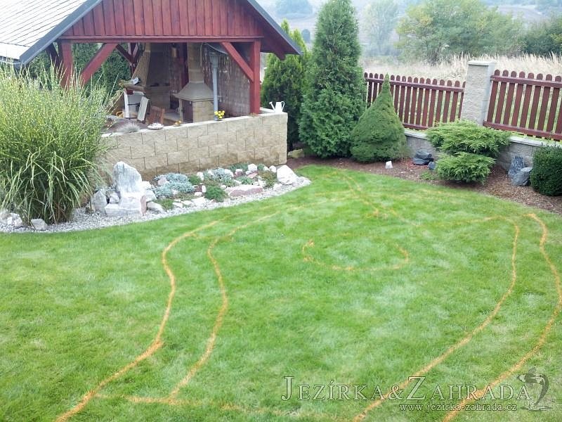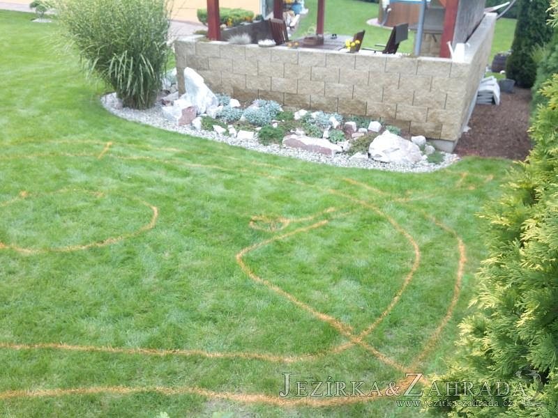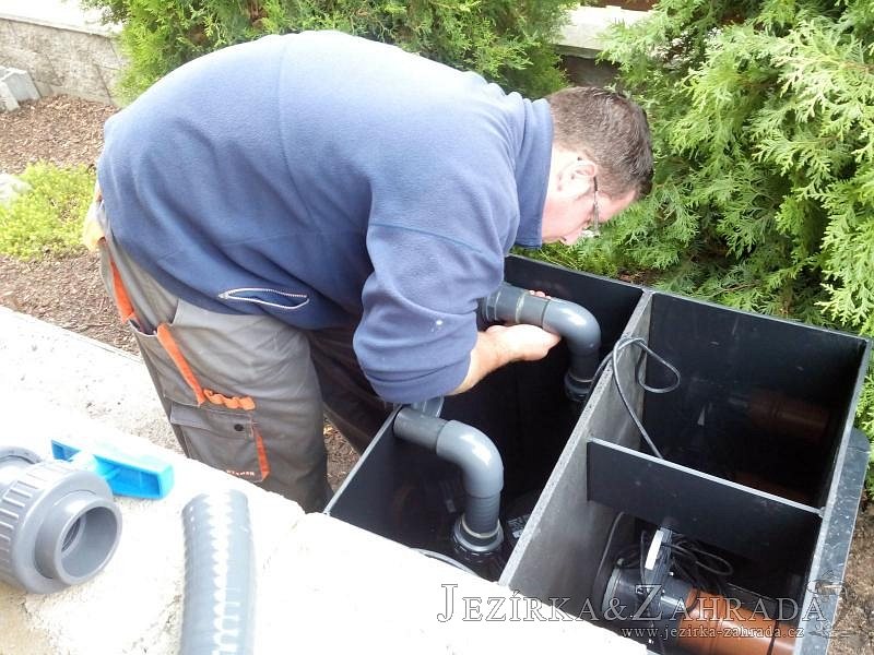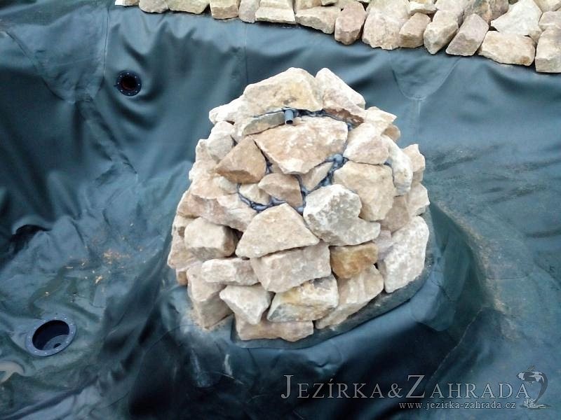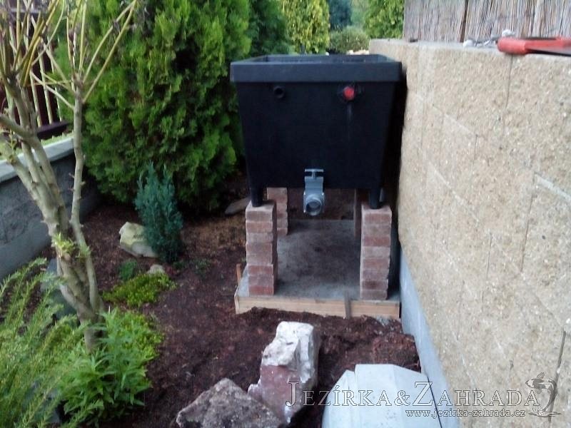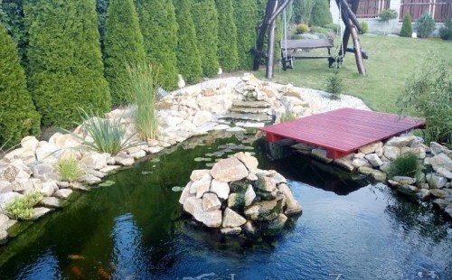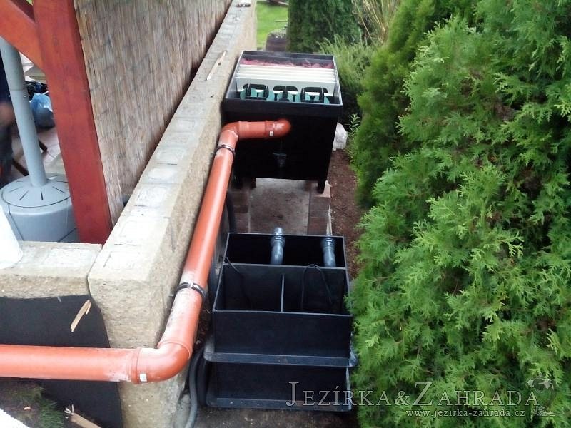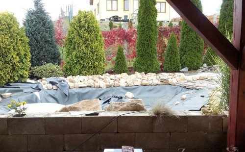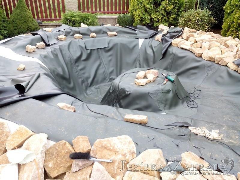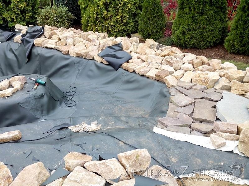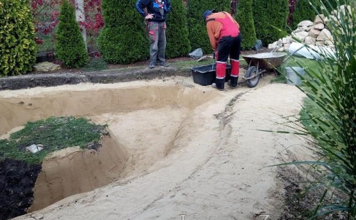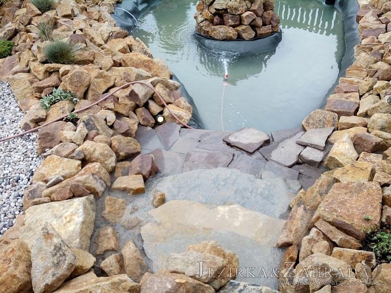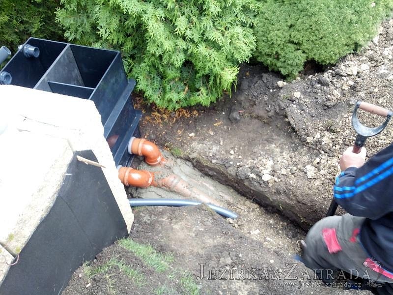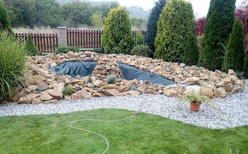 Tato realizace jezírka byla jedna z nejrychleji postavených jezírek. Zákazník se shlédl v jezírku, které máme vystavěno u naší firmy v Okružní ul. v Mostě. Ihned si sjednal schůzku s p. Studentem, kde došlo k navržení technologie a postupu prací. Odpoledne se začalo s vytíčením jezírka a následně i s výkopem. Cca. za 2 dny bylo jezírko připraveno pro položení spodní vpusti-gule, do stěny se připevnila fóliová příruba pro skimmer Oase Aquaskim Gravity. Následně se jezírko vypískovalo kopaným pískem, položila se geotextílie 500g a začalo se s pokládkou jezírkové fólie Fatra Aquaplast 805 1,5mm olivově zelené. Navržená technologie: průtokový filtr Oase BioTec 30, UV lampa Oase Bitron C 72W, čerpadlo na systém Jebao ECO-FTP 6500, čerpadlo na efekty Jebao ECO-FTP 8500, vzduchovací motor Hailea HAP-60 a osvětlovací set Oase LunAqua Classic LED set 3. Po zapojení technologie si klient dotvořil jezírko kameny a osázel květinami. Celé jezírko bylo dokončeno cca. za týden.