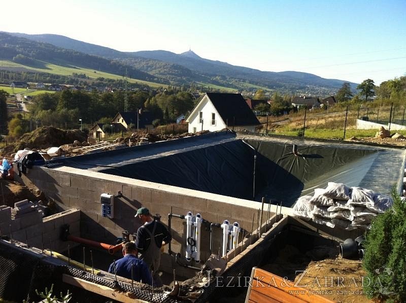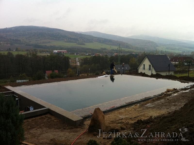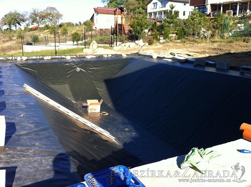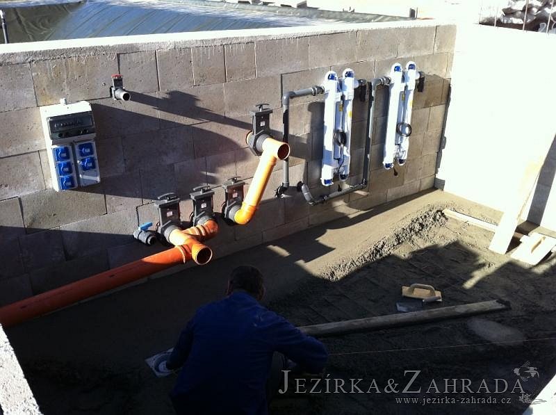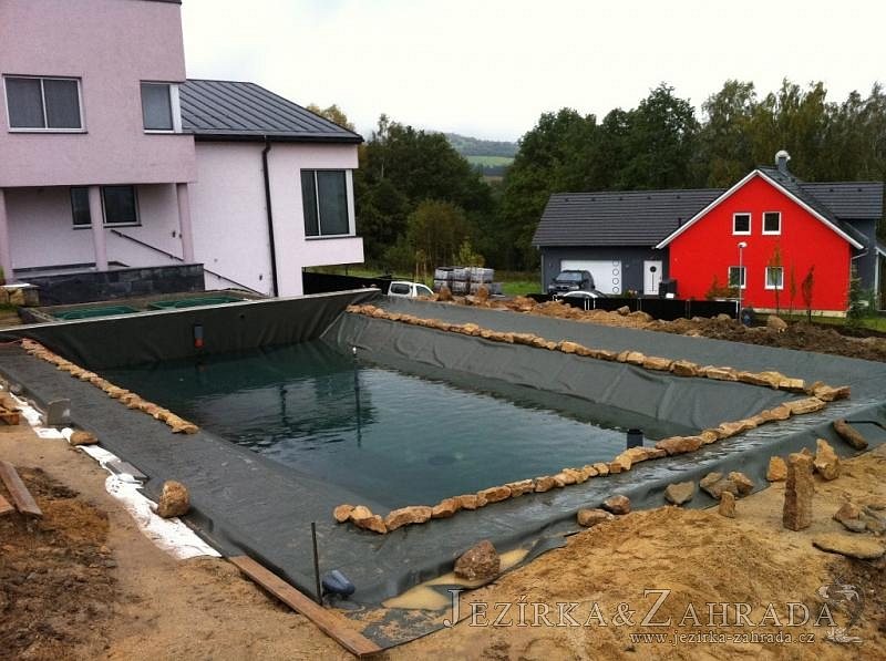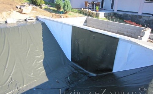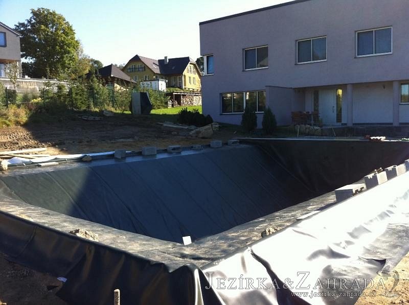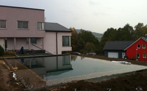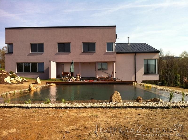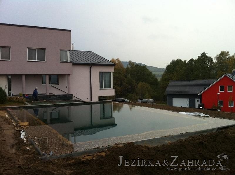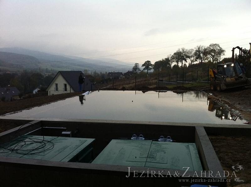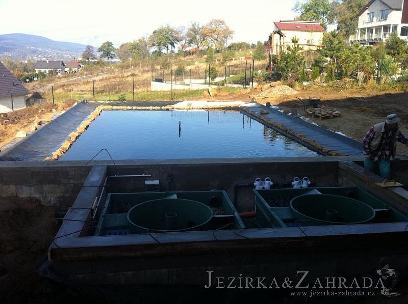 U této realizace se jednalo o kompletní stavbu moderního okrasného jezírka. Jezírko se vybagrovalo, zpevnili se stěny betonovým potěrem a ze ztraceného bednění se postavila technická místnost. Na dno jezírka se položily spodní vpusti-gule a do stěny se připevnila fóliová příruba pro skimmer Oase Aquaskim Gravity, od nich se natáhlo potrubí do technické místnosti, tam se uzavřelo šoupaty 110mm. Jezírko se pokrylo kopaným pískem, na něj se položila geotextílie 500g a následně se začala pokládat jezírková fólie Fatra Aquaplast 805/V olivově zelená. Byla zde navrhnuta technologie: 2x filtr Tripond Center-Vortex C115, 2x UV lampa TMC Pro Pond Advantage 110W, 1x čerpadlo Messner eco X-20000l/hod. a vzduchovací zařízení AquaForte V-60. Součástí jezírka je vodotrysk se samostatným čerpadlem Oase Nautilus 450 s tryskou Oase 35-10E. Technická místnost je ukryta v těsné blízkosti jezírka pod dřevěným molem. Na přání klienta bylo do systému namontováno zařízení pro automatické dopouštění vody, hladinový spínač Belimo. Osvětlení jezírka: 2x Oase LunAqua Led set 3.