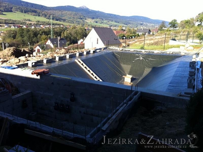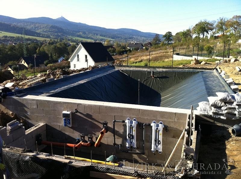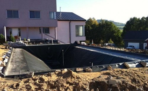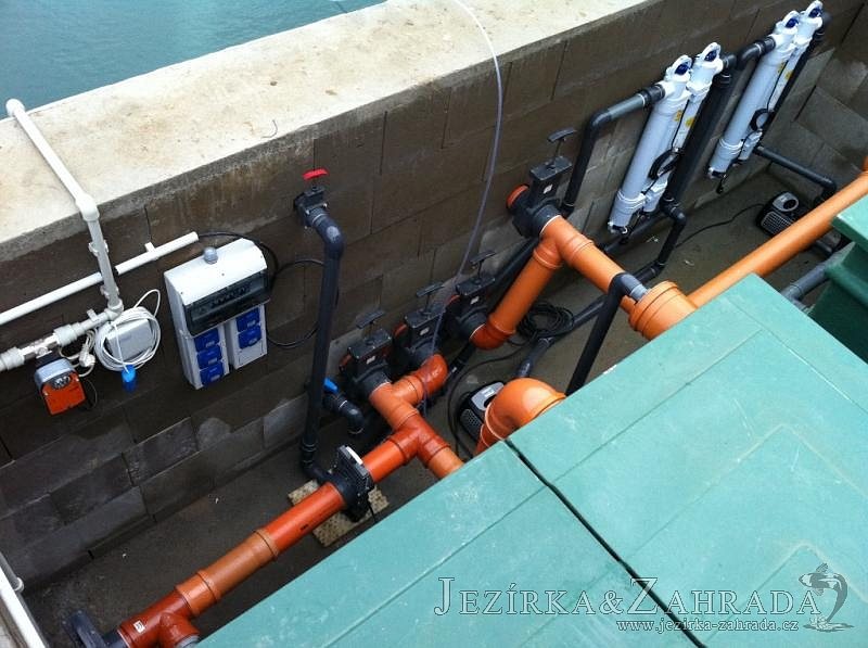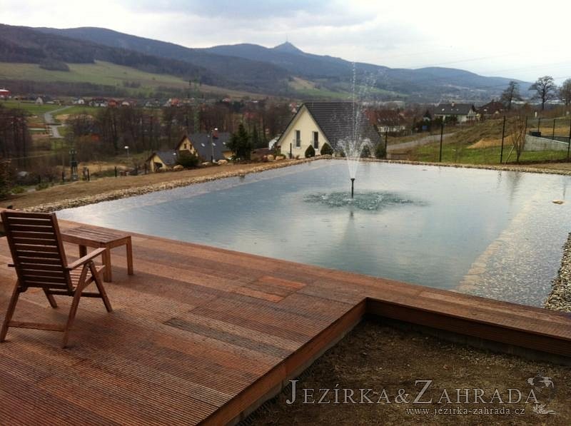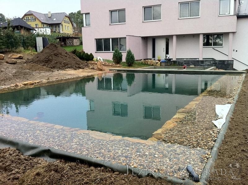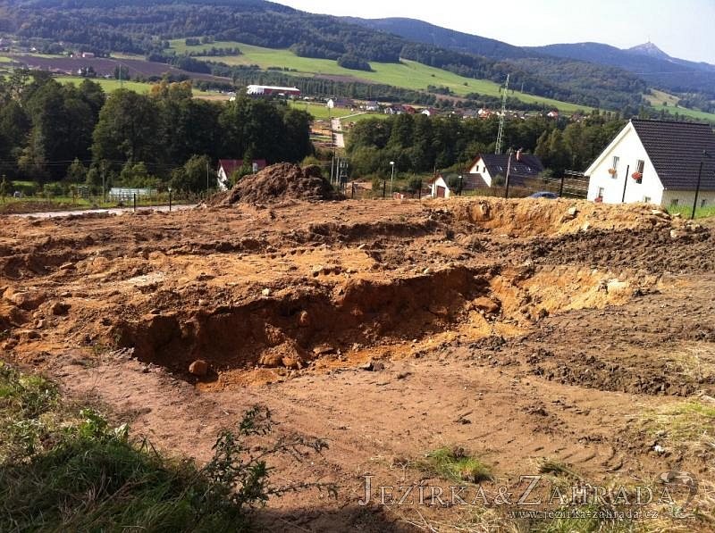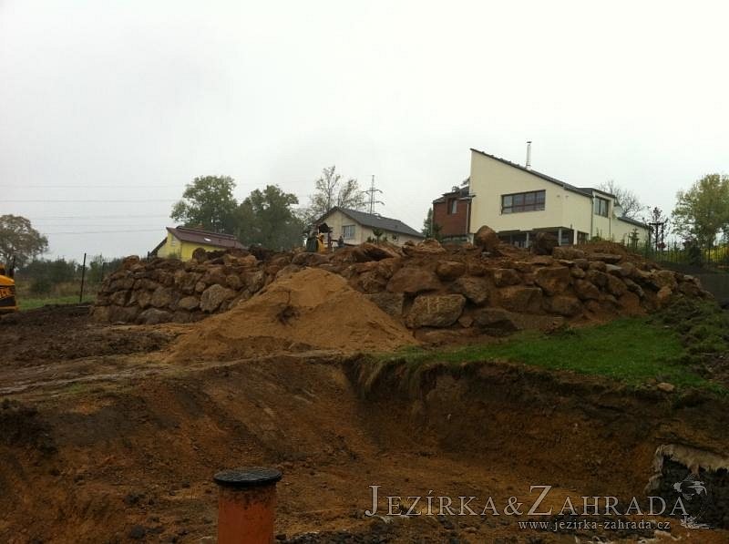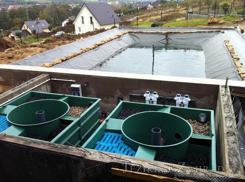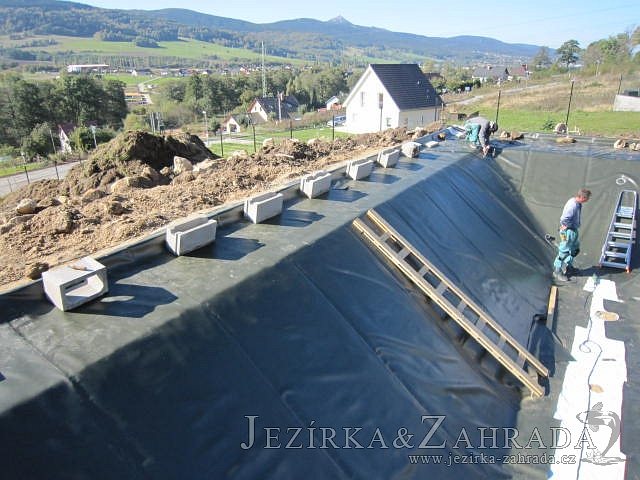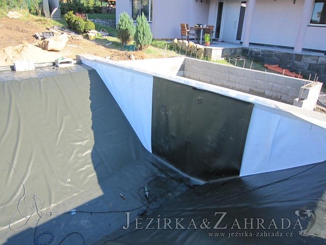 U této realizace se jednalo o kompletní stavbu moderního okrasného jezírka. Jezírko se vybagrovalo, zpevnili se stěny betonovým potěrem a ze ztraceného bednění se postavila technická místnost. Na dno jezírka se položily spodní vpusti-gule a do stěny se připevnila fóliová příruba pro skimmer Oase Aquaskim Gravity, od nich se natáhlo potrubí do technické místnosti, tam se uzavřelo šoupaty 110mm. Jezírko se pokrylo kopaným pískem, na něj se položila geotextílie 500g a následně se začala pokládat jezírková fólie Fatra Aquaplast 805/V olivově zelená. Byla zde navrhnuta technologie: 2x filtr Tripond Center-Vortex C115, 2x UV lampa TMC Pro Pond Advantage 110W, 1x čerpadlo Messner eco X-20000l/hod. a vzduchovací zařízení AquaForte V-60. Součástí jezírka je vodotrysk se samostatným čerpadlem Oase Nautilus 450 s tryskou Oase 35-10E. Technická místnost je ukryta v těsné blízkosti jezírka pod dřevěným molem. Na přání klienta bylo do systému namontováno zařízení pro automatické dopouštění vody, hladinový spínač Belimo. Osvětlení jezírka: 2x Oase LunAqua Led set 3.