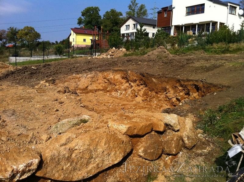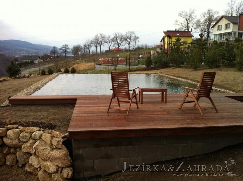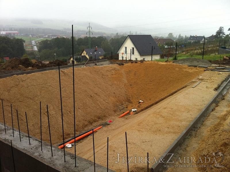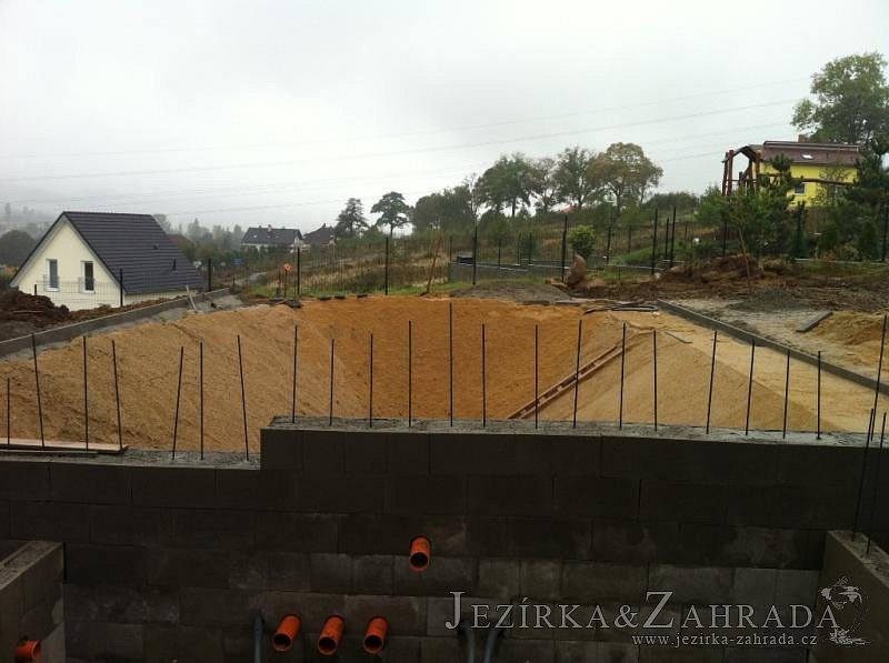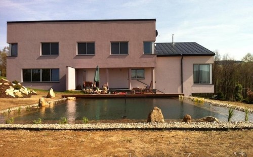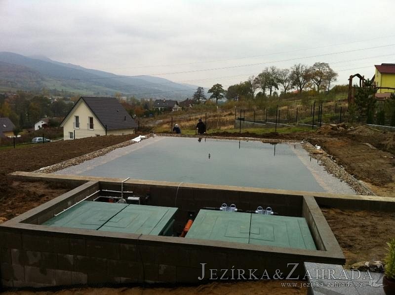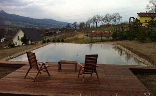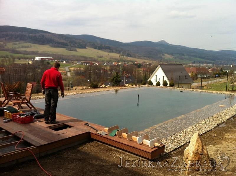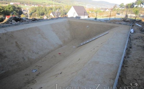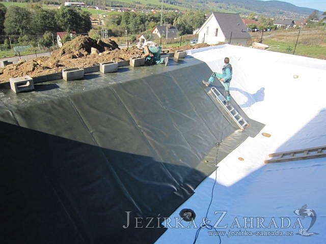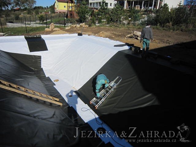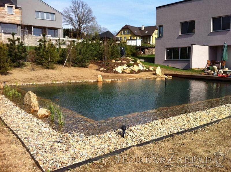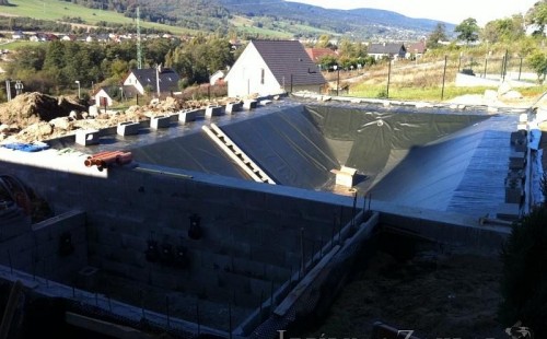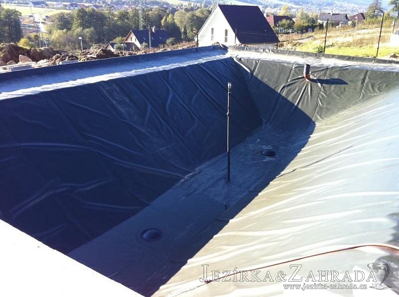 U této realizace se jednalo o kompletní stavbu moderního okrasného jezírka. Jezírko se vybagrovalo, zpevnili se stěny betonovým potěrem a ze ztraceného bednění se postavila technická místnost. Na dno jezírka se položily spodní vpusti-gule a do stěny se připevnila fóliová příruba pro skimmer Oase Aquaskim Gravity, od nich se natáhlo potrubí do technické místnosti, tam se uzavřelo šoupaty 110mm. Jezírko se pokrylo kopaným pískem, na něj se položila geotextílie 500g a následně se začala pokládat jezírková fólie Fatra Aquaplast 805/V olivově zelená. Byla zde navrhnuta technologie: 2x filtr Tripond Center-Vortex C115, 2x UV lampa TMC Pro Pond Advantage 110W, 1x čerpadlo Messner eco X-20000l/hod. a vzduchovací zařízení AquaForte V-60. Součástí jezírka je vodotrysk se samostatným čerpadlem Oase Nautilus 450 s tryskou Oase 35-10E. Technická místnost je ukryta v těsné blízkosti jezírka pod dřevěným molem. Na přání klienta bylo do systému namontováno zařízení pro automatické dopouštění vody, hladinový spínač Belimo. Osvětlení jezírka: 2x Oase LunAqua Led set 3.