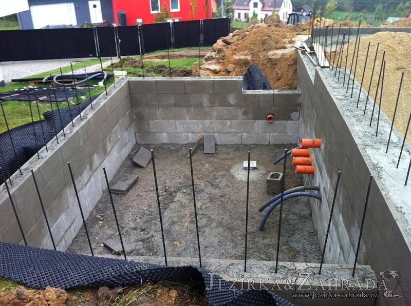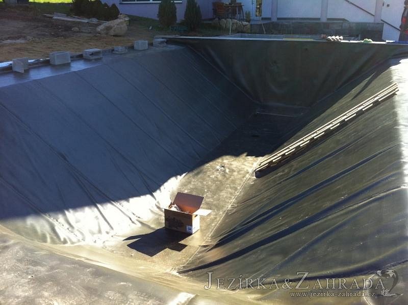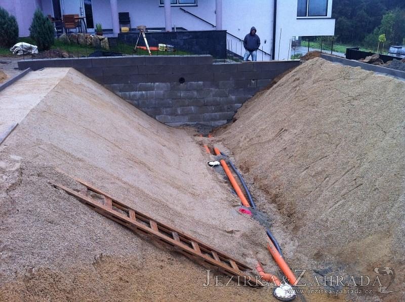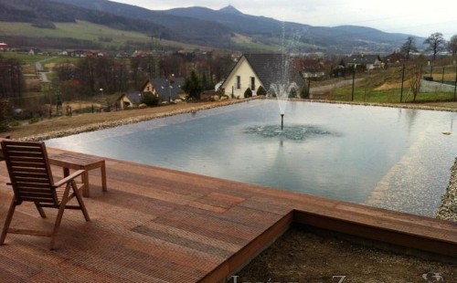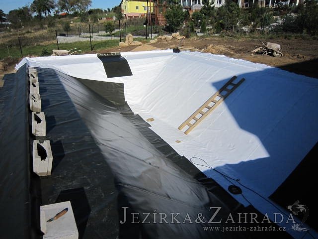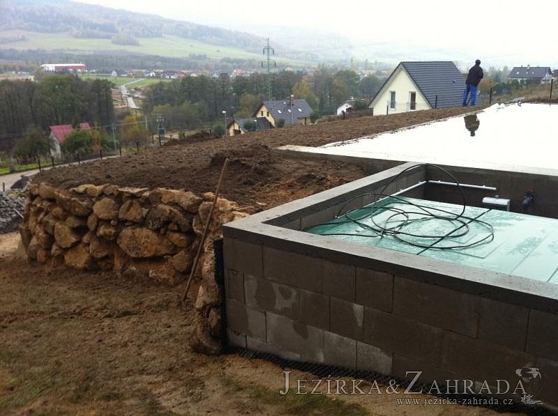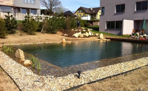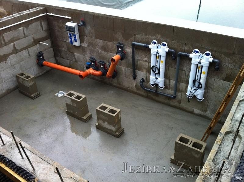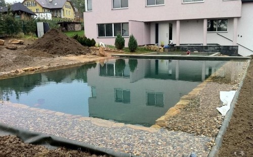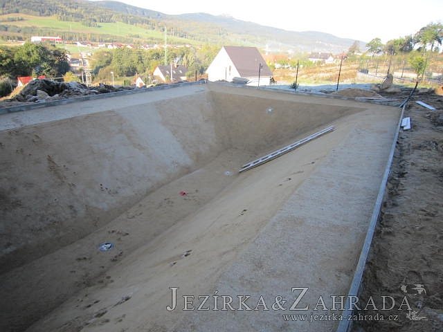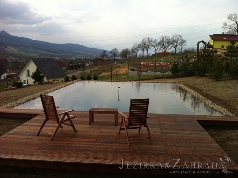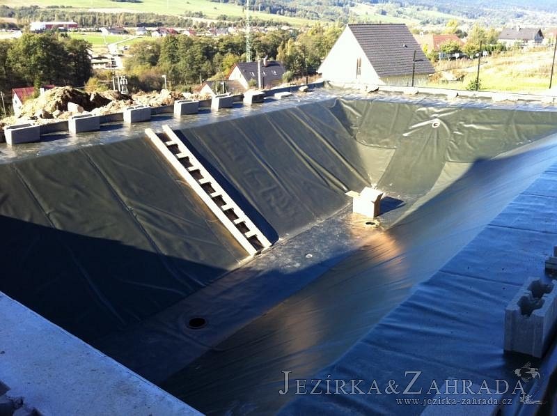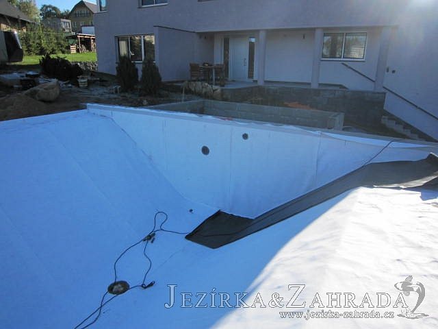 U této realizace se jednalo o kompletní stavbu moderního okrasného jezírka. Jezírko se vybagrovalo, zpevnili se stěny betonovým potěrem a ze ztraceného bednění se postavila technická místnost. Na dno jezírka se položily spodní vpusti-gule a do stěny se připevnila fóliová příruba pro skimmer Oase Aquaskim Gravity, od nich se natáhlo potrubí do technické místnosti, tam se uzavřelo šoupaty 110mm. Jezírko se pokrylo kopaným pískem, na něj se položila geotextílie 500g a následně se začala pokládat jezírková fólie Fatra Aquaplast 805/V olivově zelená. Byla zde navrhnuta technologie: 2x filtr Tripond Center-Vortex C115, 2x UV lampa TMC Pro Pond Advantage 110W, 1x čerpadlo Messner eco X-20000l/hod. a vzduchovací zařízení AquaForte V-60. Součástí jezírka je vodotrysk se samostatným čerpadlem Oase Nautilus 450 s tryskou Oase 35-10E. Technická místnost je ukryta v těsné blízkosti jezírka pod dřevěným molem. Na přání klienta bylo do systému namontováno zařízení pro automatické dopouštění vody, hladinový spínač Belimo. Osvětlení jezírka: 2x Oase LunAqua Led set 3.