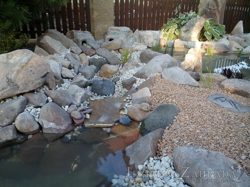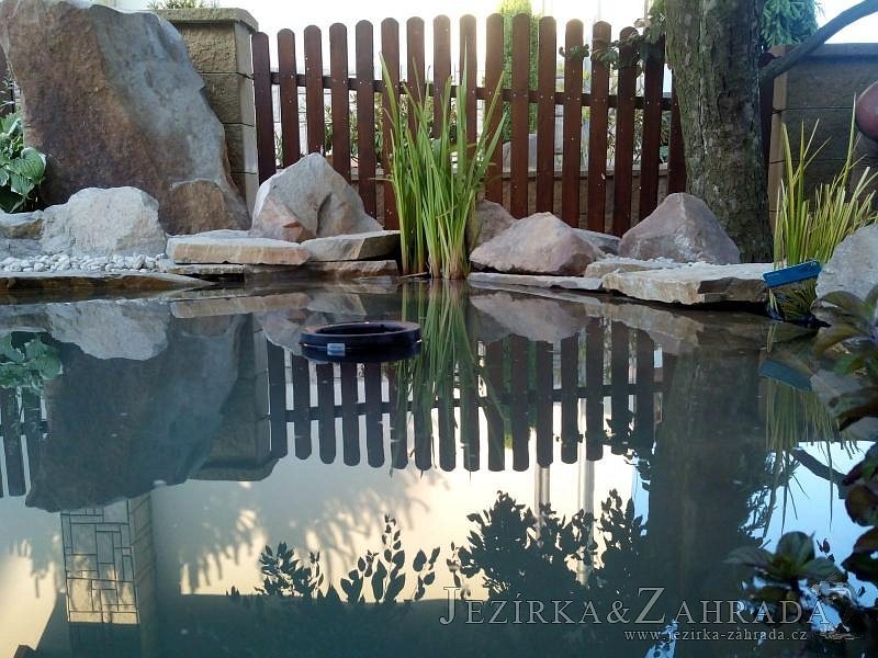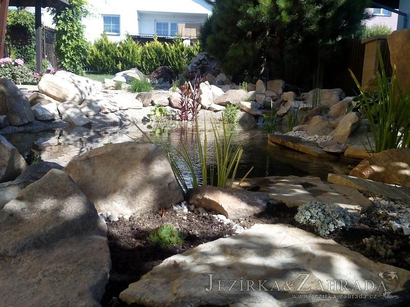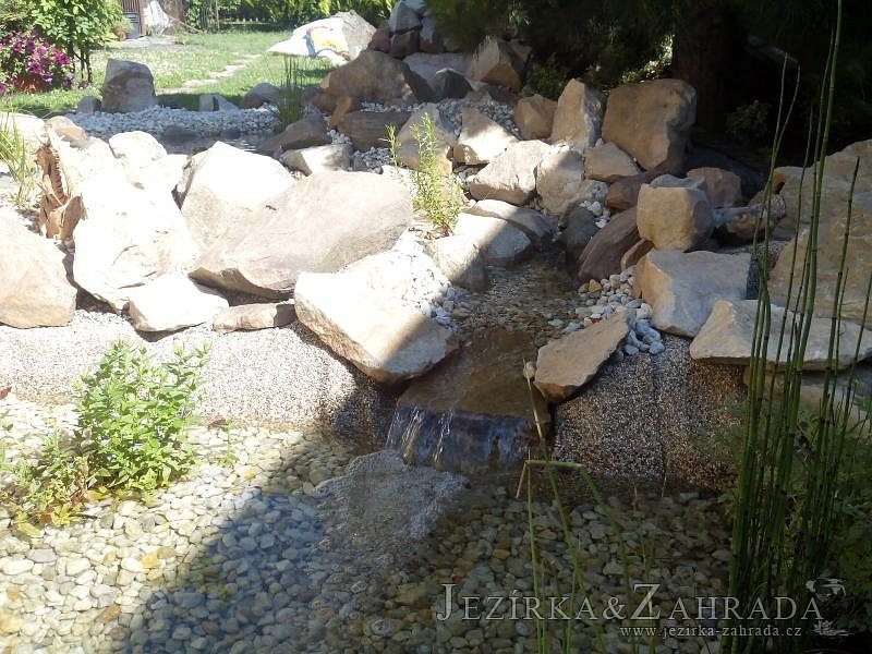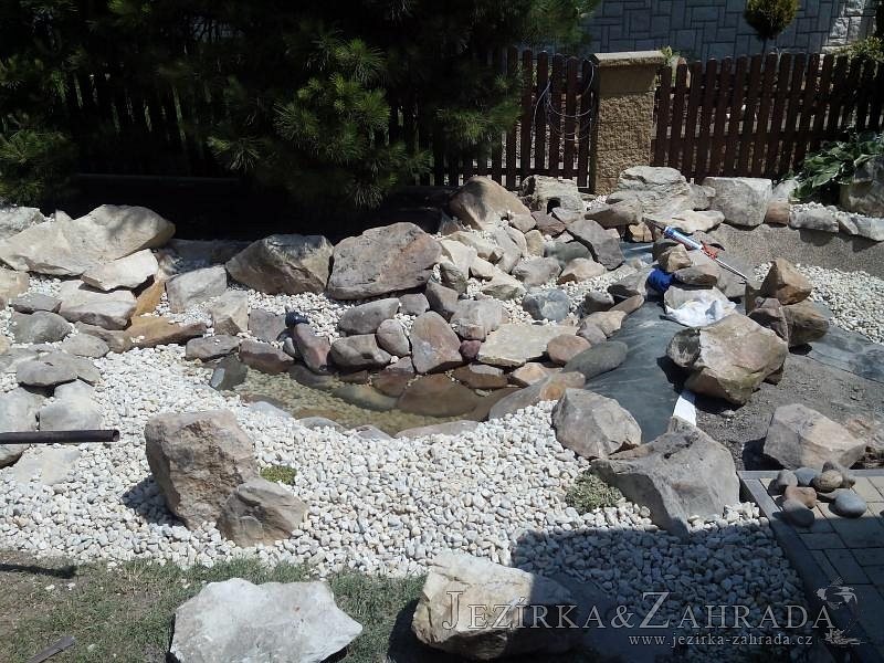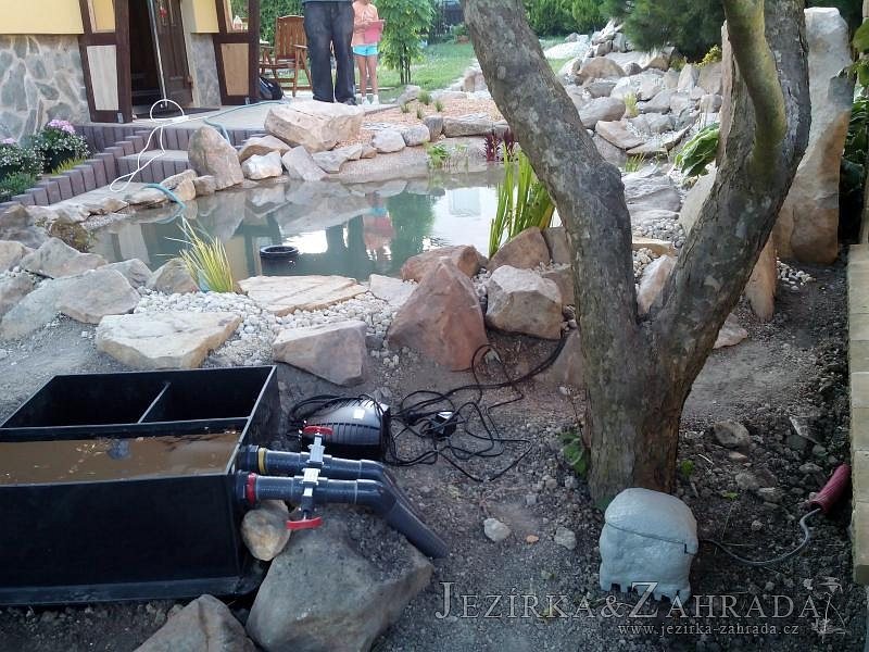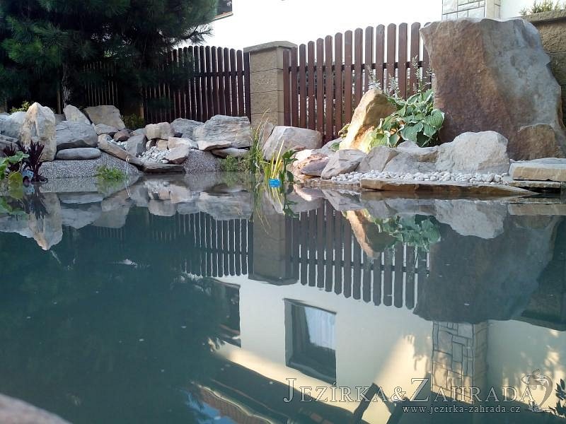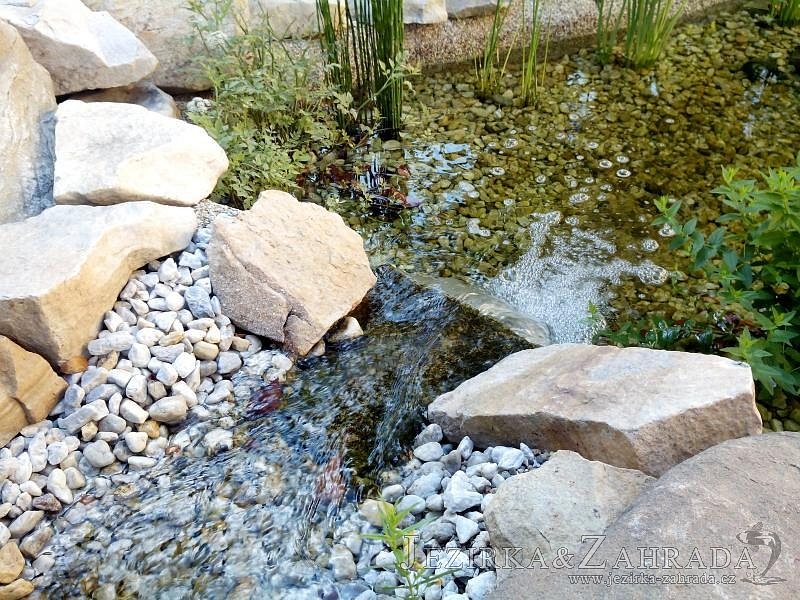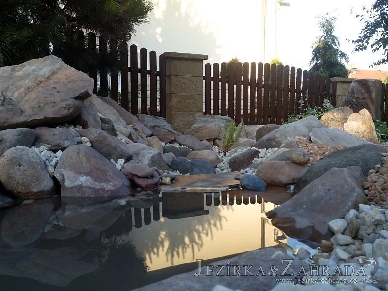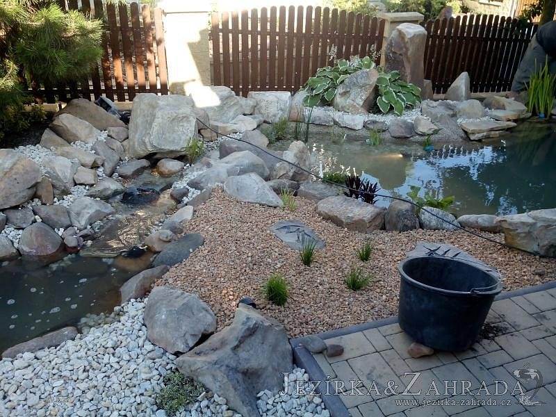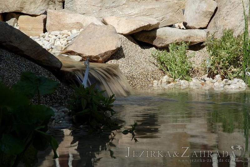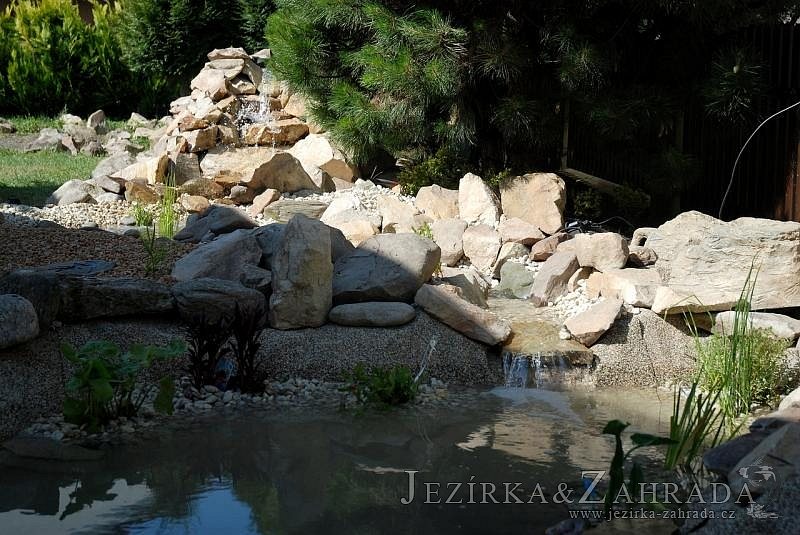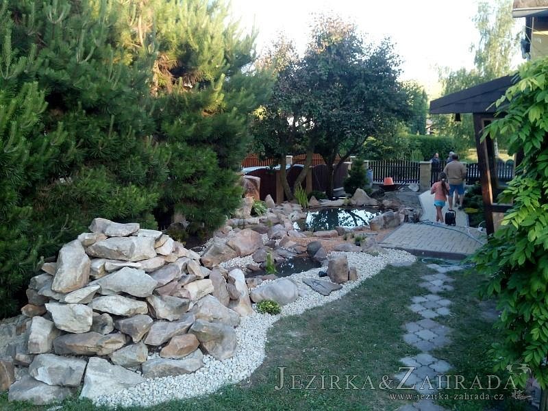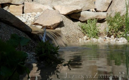 Tato výstavba je perfektní ukázkou toho, že i v menším prostoru se dá vybudovat okrasné jezírko s vodopádem a potůčkem, které rozhodně stojí za pohled. Celý prostor byl jen hrubě vyznačen, ale po doladění terénu a usazení čerpadlové šachty, dnové vpusti a potrubí byl vidět každý kus práce. Vodopád je rozdělen na dvě části. Vrchní proud skrze flexi hadici pohání čerpadlo Aquaking ECO-FTP 6500 a spodní Aquaking ECO-FTP 10000, které jsou uložena v čerpadlové šachtě. Přes potok s tůňkou teče voda až na terasy jezírka u kterého se o filtraci starají tlakové filtry Oase FiltoClear 30000, které velmi dobře schová krycí kámen Oase Filtocap. Čistou hladinu udržuje trubkový skimmer Oase AquaSkim Gravity a celý prostor světelně doplňují dvě sady světel Oase LunAqua LED set 3. Pro vzduchování byl použit set Oase AquaOxy 1000. Na přání zákazníka jsme dodali okrasný kačírek, ve kterém se vyjímají nášlapné kameny s ornamenty, které pocházejí z vlastní výroby. Z naší nabídky si vybrali i jezírkové rostliny a okrasné kameny, které lemují břeh jezírka. Po vsypání startovacích bakterií do filtrace se jen čekalo na správné uzrání a v současné době jsou ve vodě i první ryby.