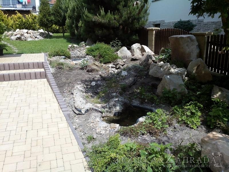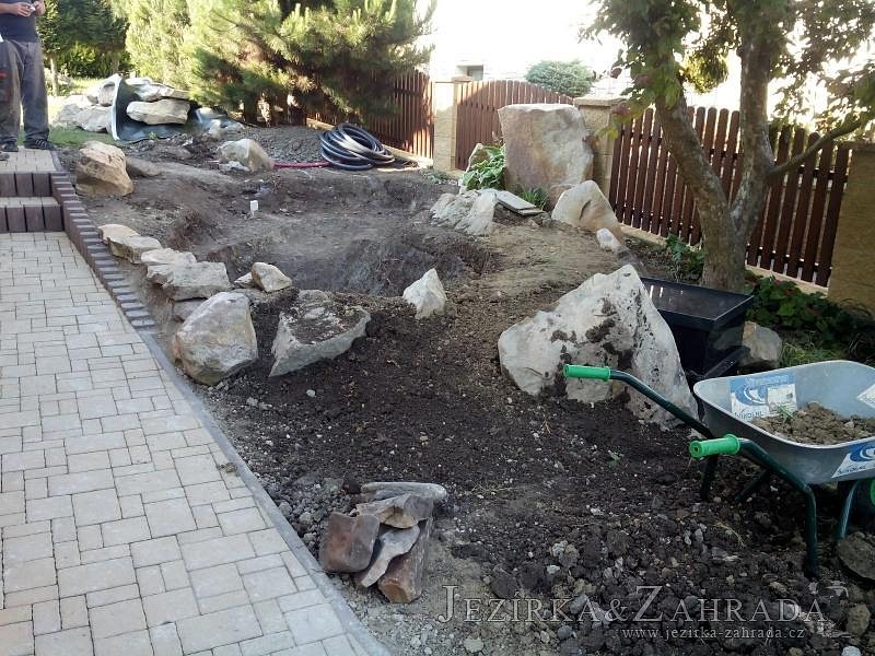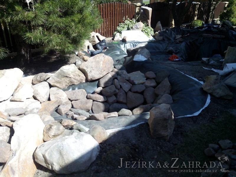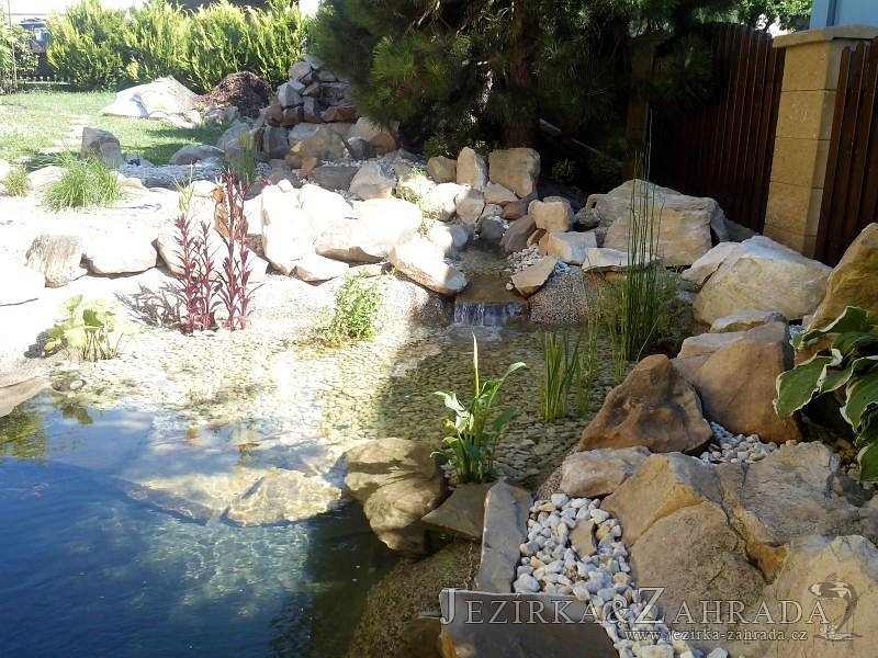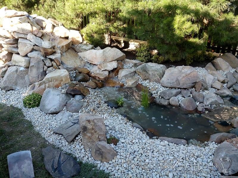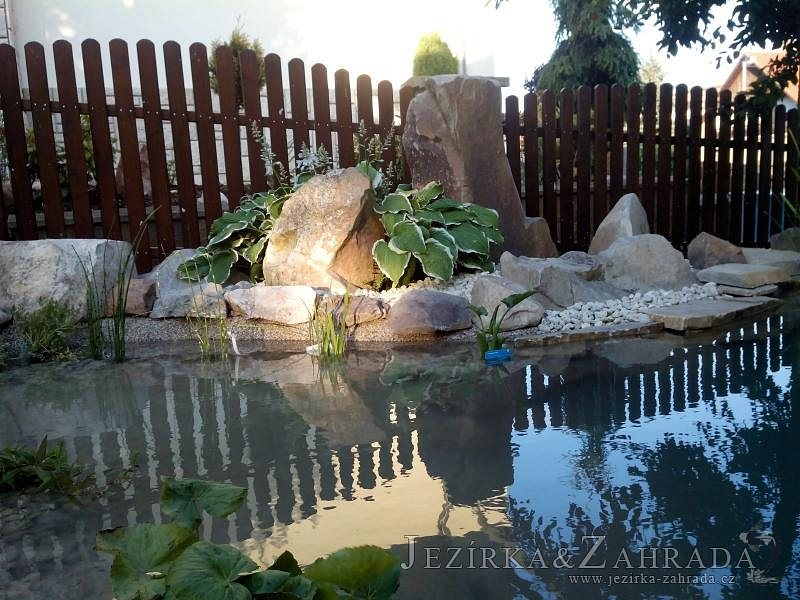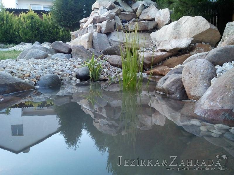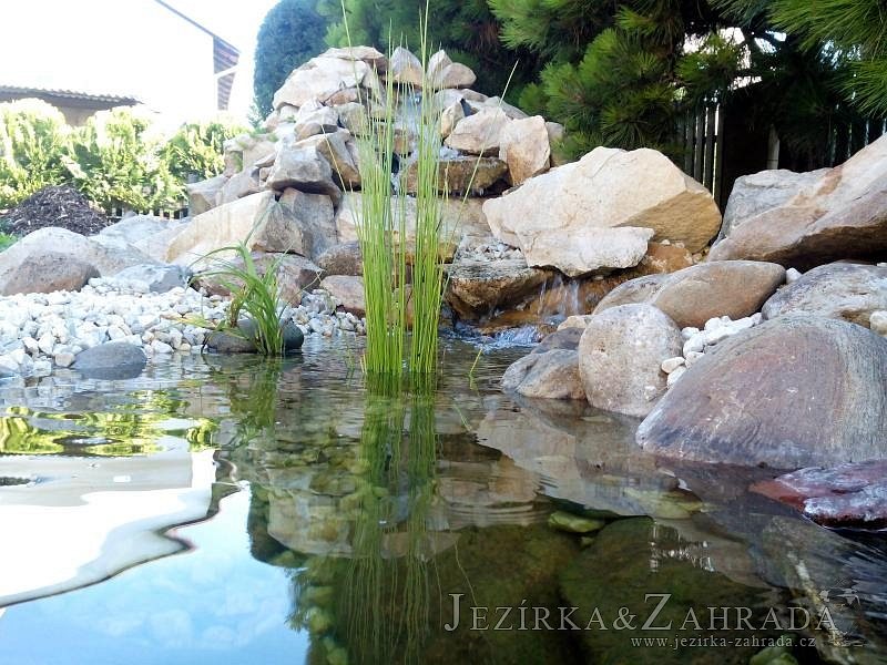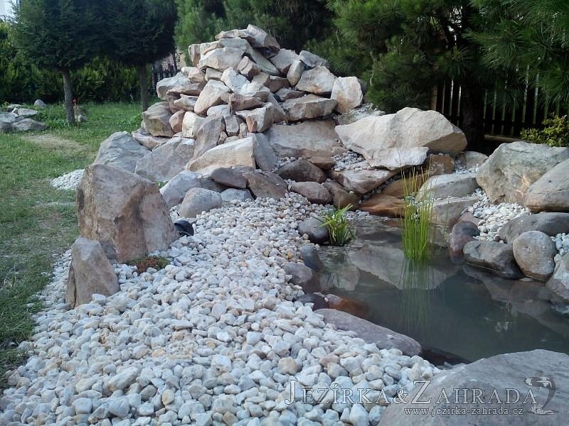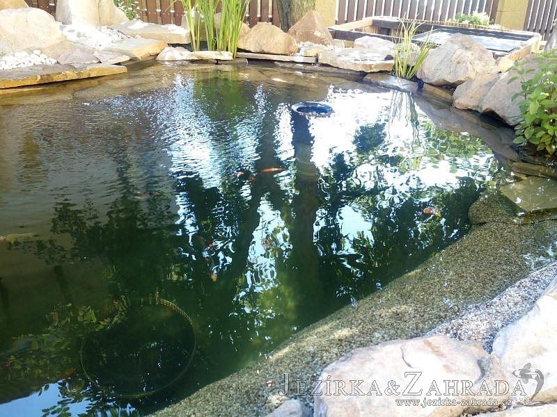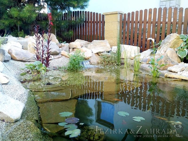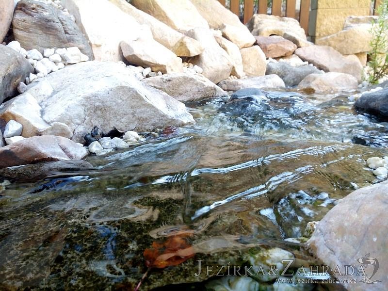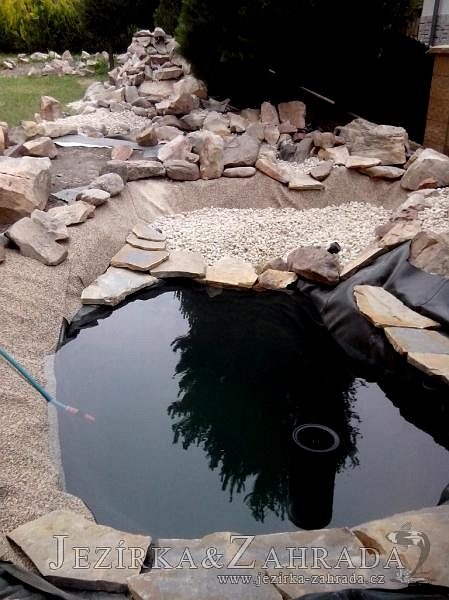 Tato výstavba je perfektní ukázkou toho, že i v menším prostoru se dá vybudovat okrasné jezírko s vodopádem a potůčkem, které rozhodně stojí za pohled. Celý prostor byl jen hrubě vyznačen, ale po doladění terénu a usazení čerpadlové šachty, dnové vpusti a potrubí byl vidět každý kus práce. Vodopád je rozdělen na dvě části. Vrchní proud skrze flexi hadici pohání čerpadlo Aquaking ECO-FTP 6500 a spodní Aquaking ECO-FTP 10000, které jsou uložena v čerpadlové šachtě. Přes potok s tůňkou teče voda až na terasy jezírka u kterého se o filtraci starají tlakové filtry Oase FiltoClear 30000, které velmi dobře schová krycí kámen Oase Filtocap. Čistou hladinu udržuje trubkový skimmer Oase AquaSkim Gravity a celý prostor světelně doplňují dvě sady světel Oase LunAqua LED set 3. Pro vzduchování byl použit set Oase AquaOxy 1000. Na přání zákazníka jsme dodali okrasný kačírek, ve kterém se vyjímají nášlapné kameny s ornamenty, které pocházejí z vlastní výroby. Z naší nabídky si vybrali i jezírkové rostliny a okrasné kameny, které lemují břeh jezírka. Po vsypání startovacích bakterií do filtrace se jen čekalo na správné uzrání a v současné době jsou ve vodě i první ryby.