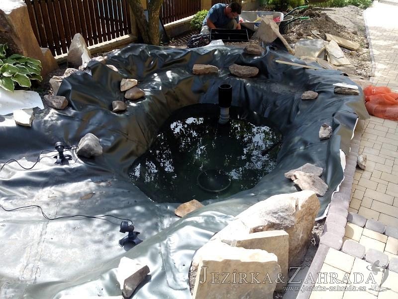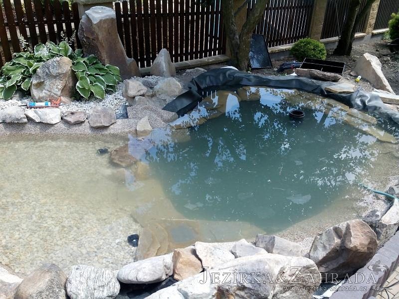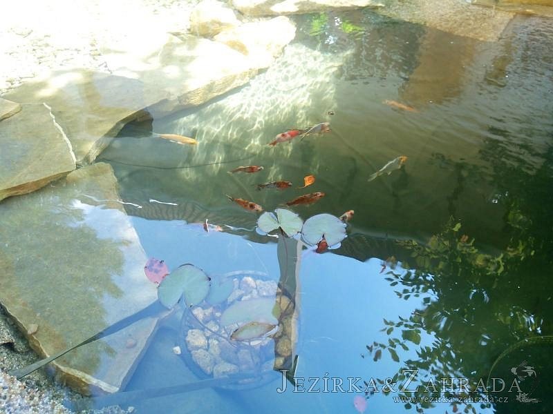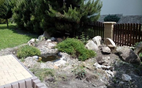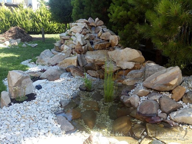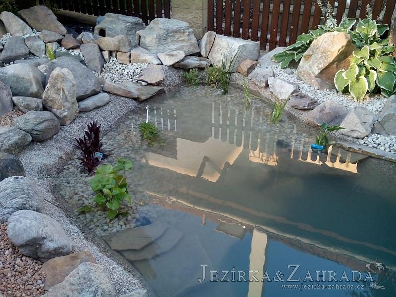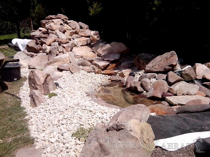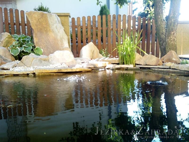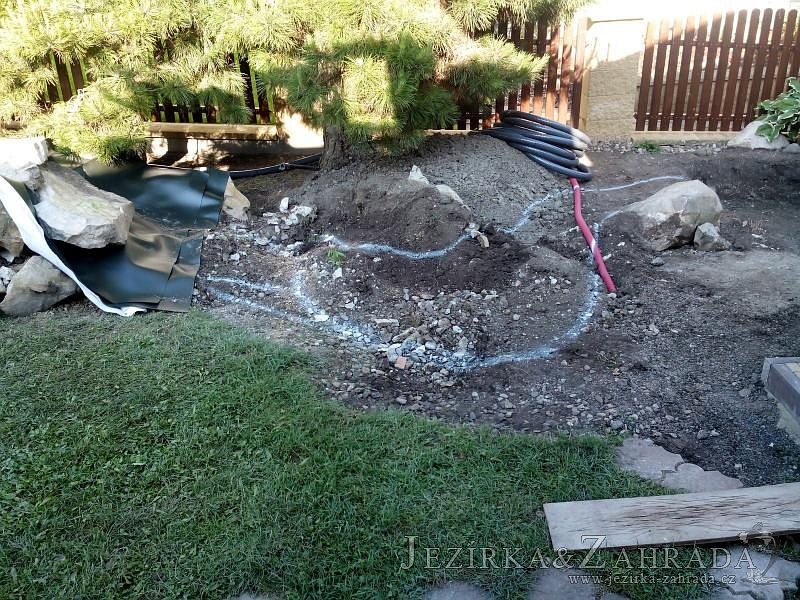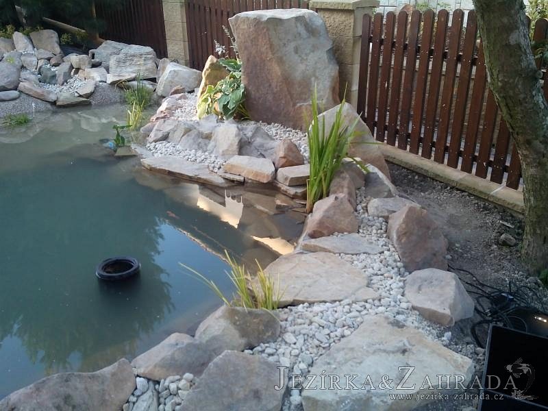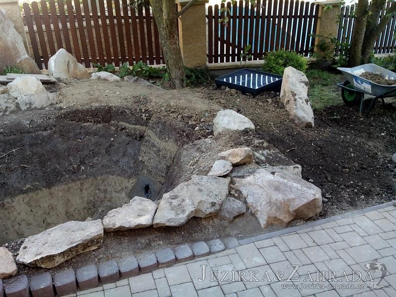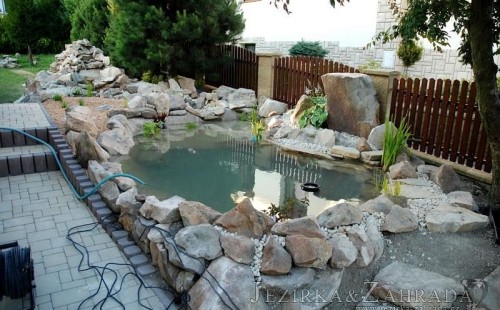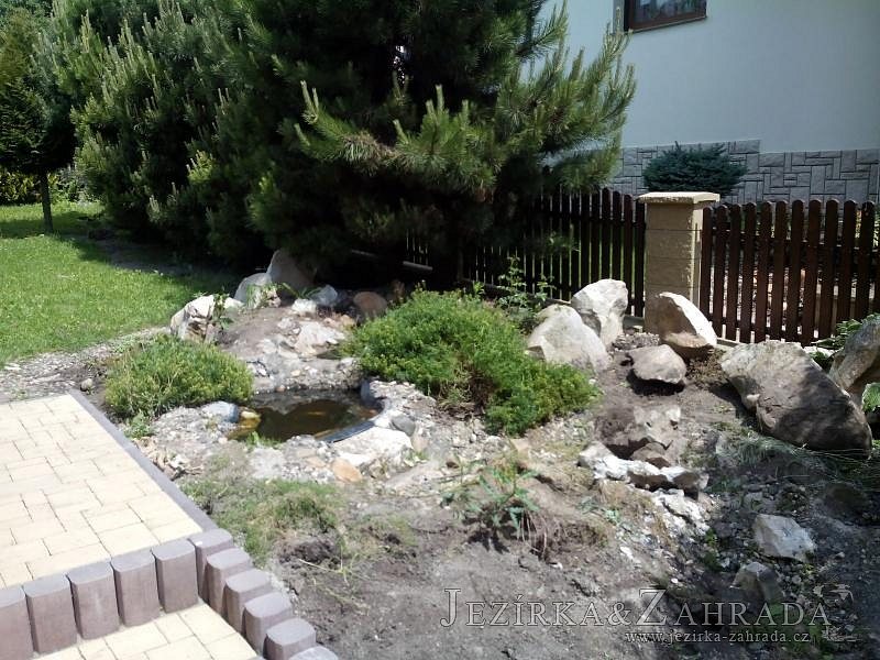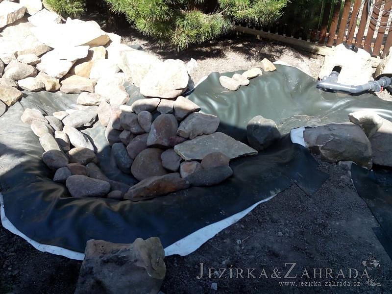 Tato výstavba je perfektní ukázkou toho, že i v menším prostoru se dá vybudovat okrasné jezírko s vodopádem a potůčkem, které rozhodně stojí za pohled. Celý prostor byl jen hrubě vyznačen, ale po doladění terénu a usazení čerpadlové šachty, dnové vpusti a potrubí byl vidět každý kus práce. Vodopád je rozdělen na dvě části. Vrchní proud skrze flexi hadici pohání čerpadlo Aquaking ECO-FTP 6500 a spodní Aquaking ECO-FTP 10000, které jsou uložena v čerpadlové šachtě. Přes potok s tůňkou teče voda až na terasy jezírka u kterého se o filtraci starají tlakové filtry Oase FiltoClear 30000, které velmi dobře schová krycí kámen Oase Filtocap. Čistou hladinu udržuje trubkový skimmer Oase AquaSkim Gravity a celý prostor světelně doplňují dvě sady světel Oase LunAqua LED set 3. Pro vzduchování byl použit set Oase AquaOxy 1000. Na přání zákazníka jsme dodali okrasný kačírek, ve kterém se vyjímají nášlapné kameny s ornamenty, které pocházejí z vlastní výroby. Z naší nabídky si vybrali i jezírkové rostliny a okrasné kameny, které lemují břeh jezírka. Po vsypání startovacích bakterií do filtrace se jen čekalo na správné uzrání a v současné době jsou ve vodě i první ryby.