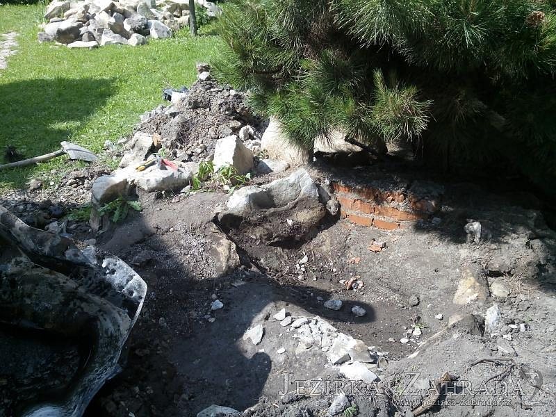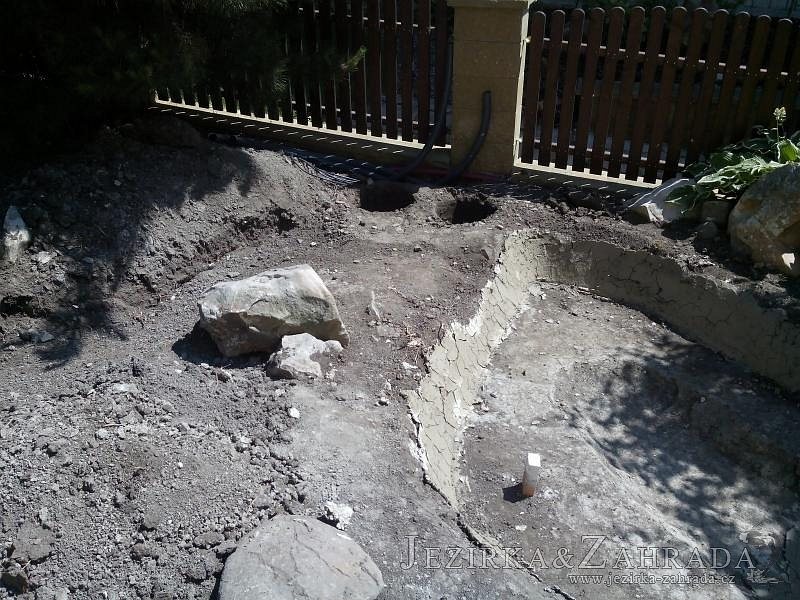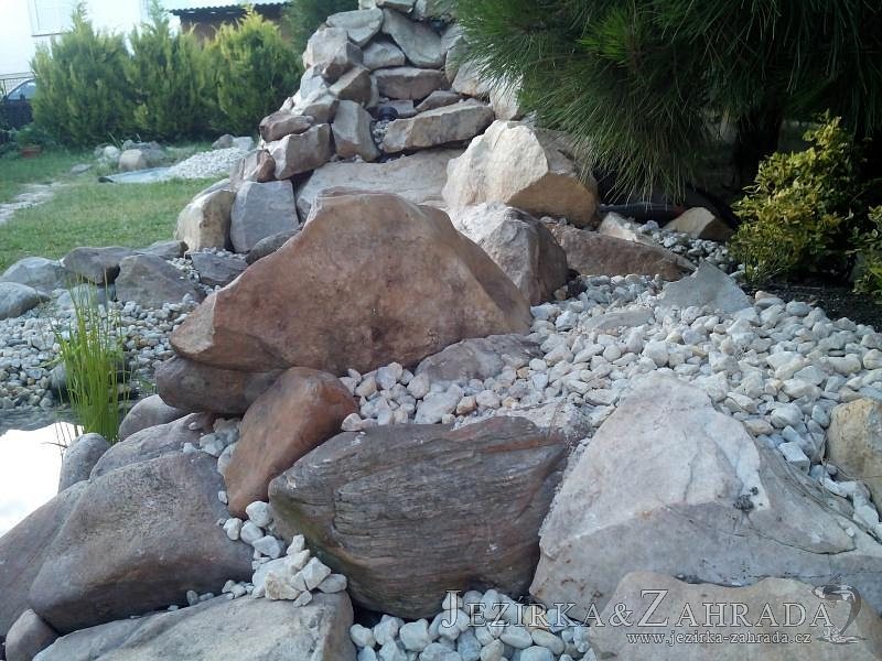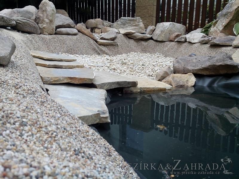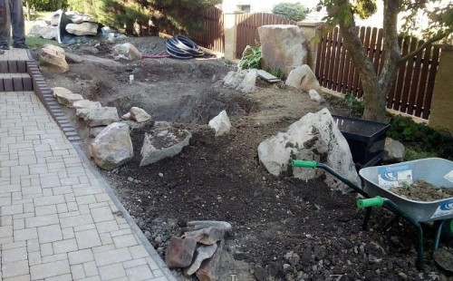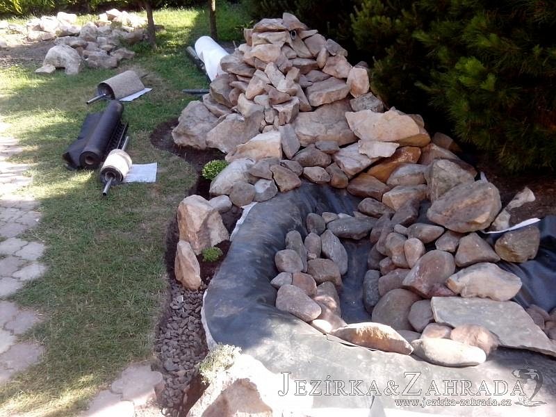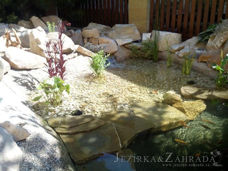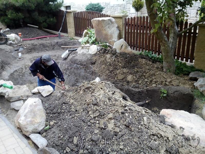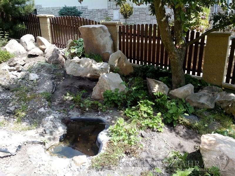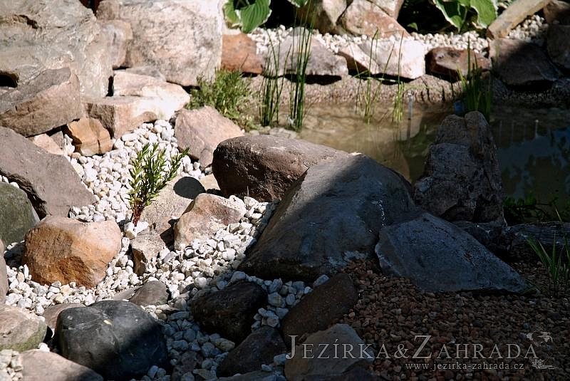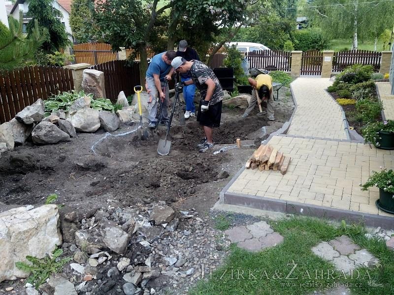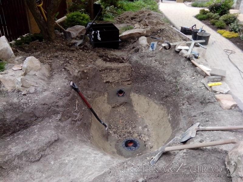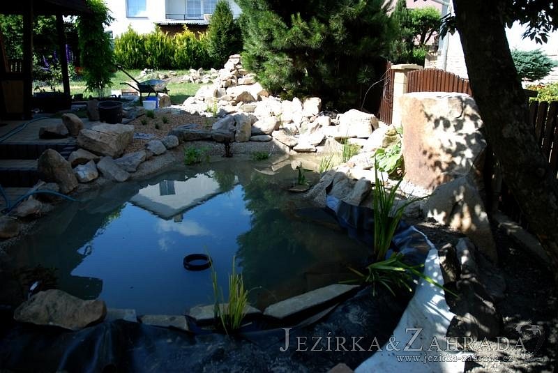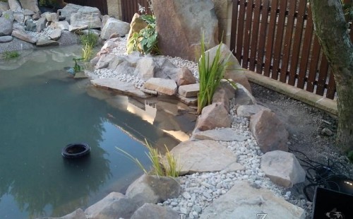 Tato výstavba je perfektní ukázkou toho, že i v menším prostoru se dá vybudovat okrasné jezírko s vodopádem a potůčkem, které rozhodně stojí za pohled. Celý prostor byl jen hrubě vyznačen, ale po doladění terénu a usazení čerpadlové šachty, dnové vpusti a potrubí byl vidět každý kus práce. Vodopád je rozdělen na dvě části. Vrchní proud skrze flexi hadici pohání čerpadlo Aquaking ECO-FTP 6500 a spodní Aquaking ECO-FTP 10000, které jsou uložena v čerpadlové šachtě. Přes potok s tůňkou teče voda až na terasy jezírka u kterého se o filtraci starají tlakové filtry Oase FiltoClear 30000, které velmi dobře schová krycí kámen Oase Filtocap. Čistou hladinu udržuje trubkový skimmer Oase AquaSkim Gravity a celý prostor světelně doplňují dvě sady světel Oase LunAqua LED set 3. Pro vzduchování byl použit set Oase AquaOxy 1000. Na přání zákazníka jsme dodali okrasný kačírek, ve kterém se vyjímají nášlapné kameny s ornamenty, které pocházejí z vlastní výroby. Z naší nabídky si vybrali i jezírkové rostliny a okrasné kameny, které lemují břeh jezírka. Po vsypání startovacích bakterií do filtrace se jen čekalo na správné uzrání a v současné době jsou ve vodě i první ryby.