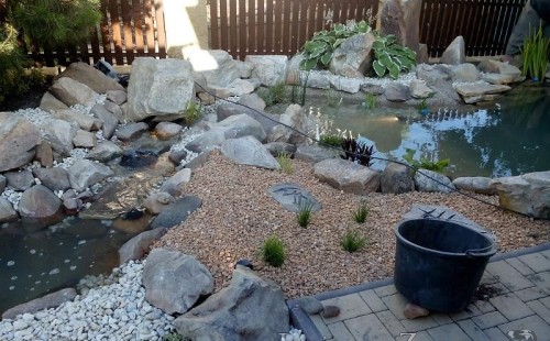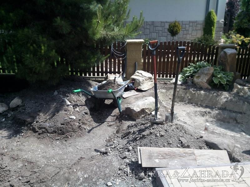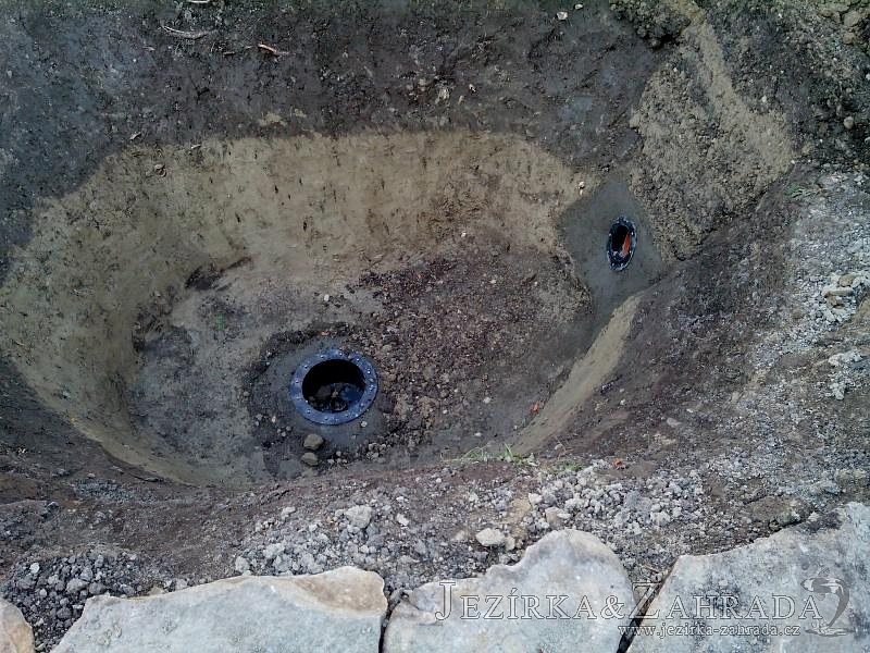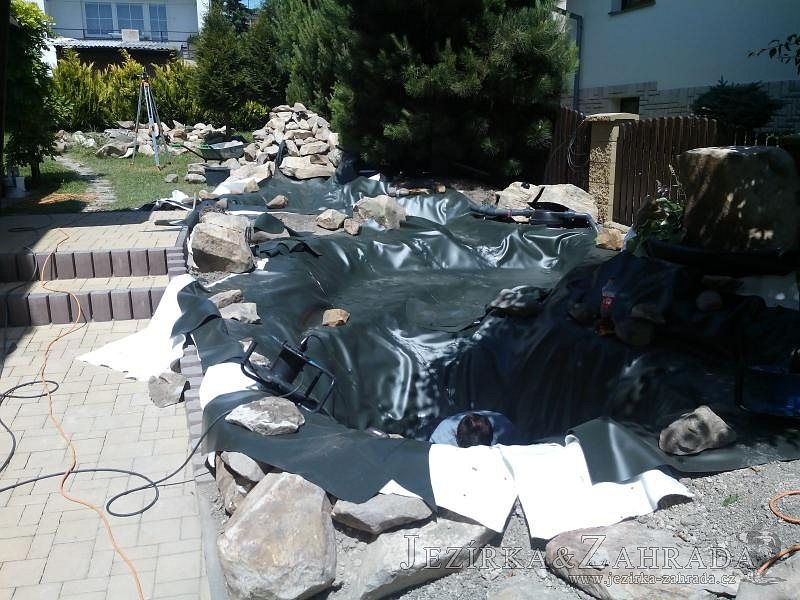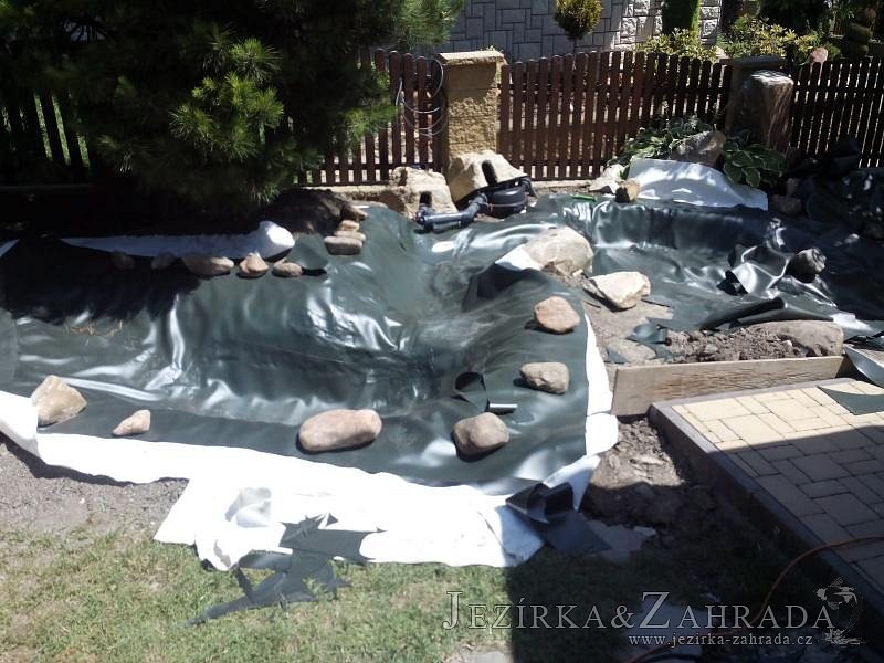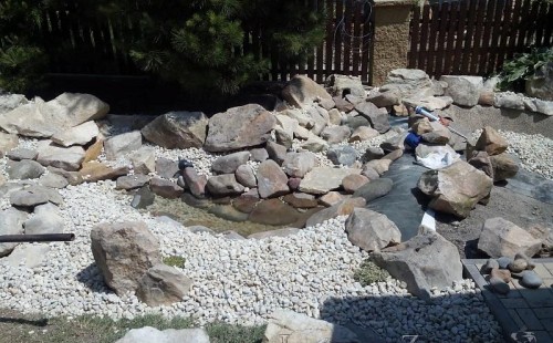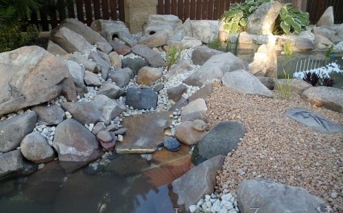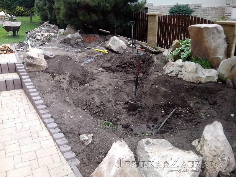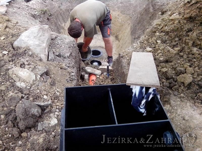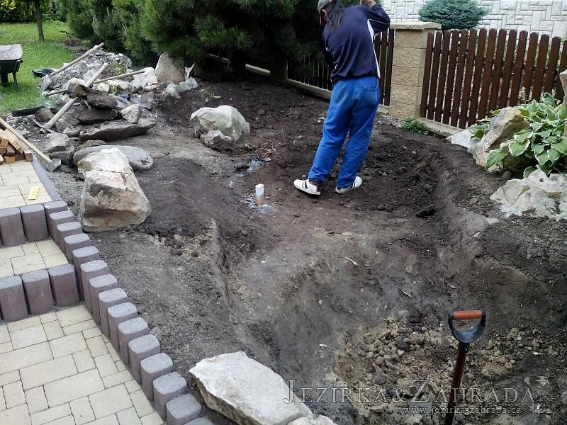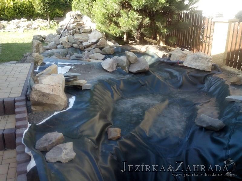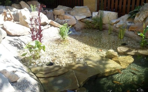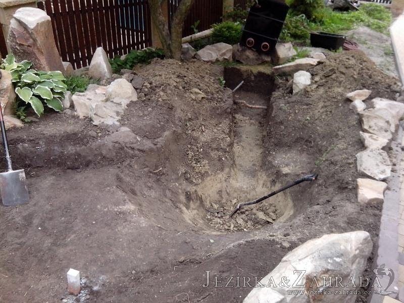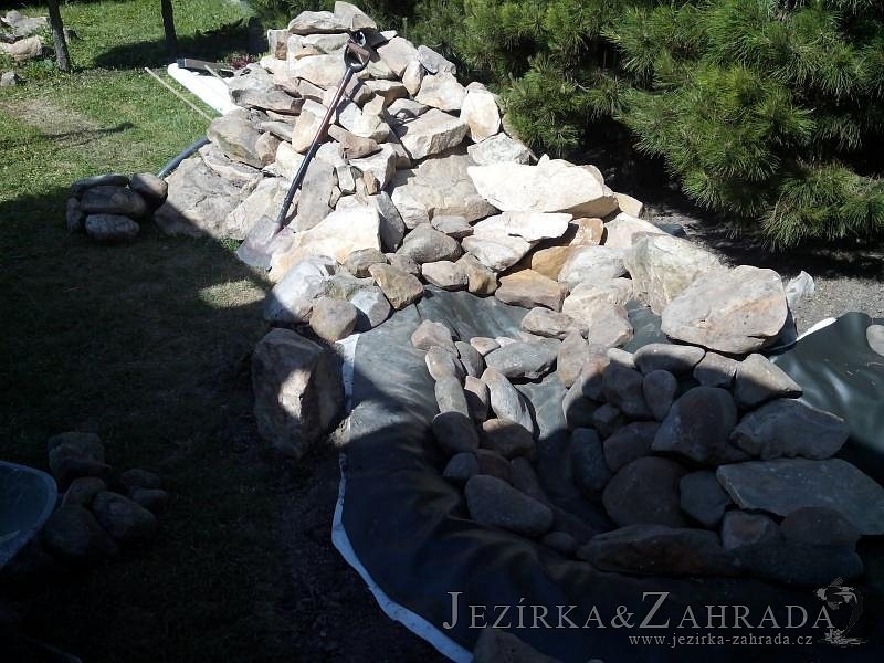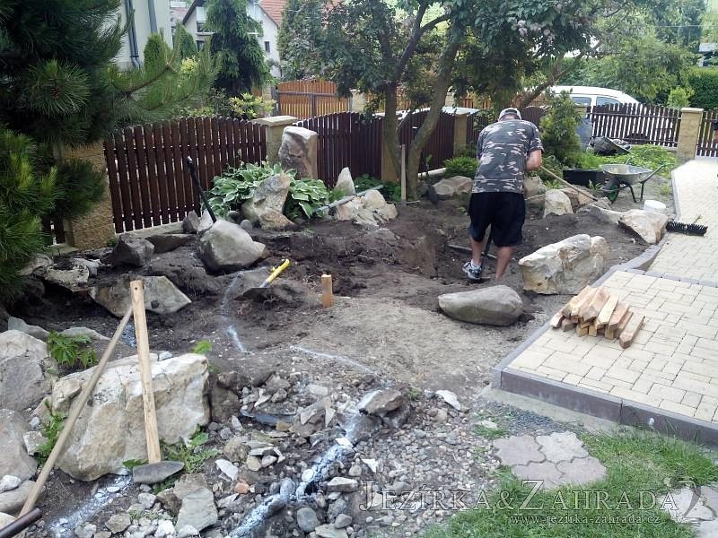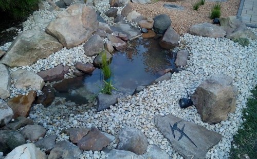 Tato výstavba je perfektní ukázkou toho, že i v menším prostoru se dá vybudovat okrasné jezírko s vodopádem a potůčkem, které rozhodně stojí za pohled. Celý prostor byl jen hrubě vyznačen, ale po doladění terénu a usazení čerpadlové šachty, dnové vpusti a potrubí byl vidět každý kus práce. Vodopád je rozdělen na dvě části. Vrchní proud skrze flexi hadici pohání čerpadlo Aquaking ECO-FTP 6500 a spodní Aquaking ECO-FTP 10000, které jsou uložena v čerpadlové šachtě. Přes potok s tůňkou teče voda až na terasy jezírka u kterého se o filtraci starají tlakové filtry Oase FiltoClear 30000, které velmi dobře schová krycí kámen Oase Filtocap. Čistou hladinu udržuje trubkový skimmer Oase AquaSkim Gravity a celý prostor světelně doplňují dvě sady světel Oase LunAqua LED set 3. Pro vzduchování byl použit set Oase AquaOxy 1000. Na přání zákazníka jsme dodali okrasný kačírek, ve kterém se vyjímají nášlapné kameny s ornamenty, které pocházejí z vlastní výroby. Z naší nabídky si vybrali i jezírkové rostliny a okrasné kameny, které lemují břeh jezírka. Po vsypání startovacích bakterií do filtrace se jen čekalo na správné uzrání a v současné době jsou ve vodě i první ryby.