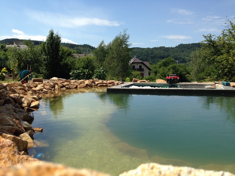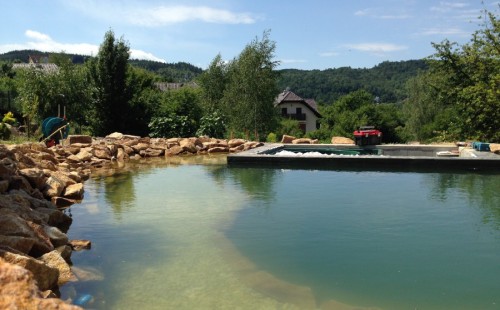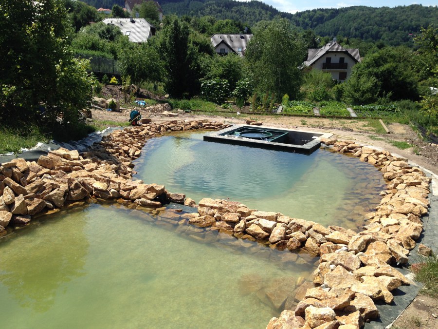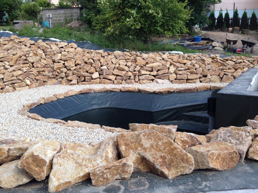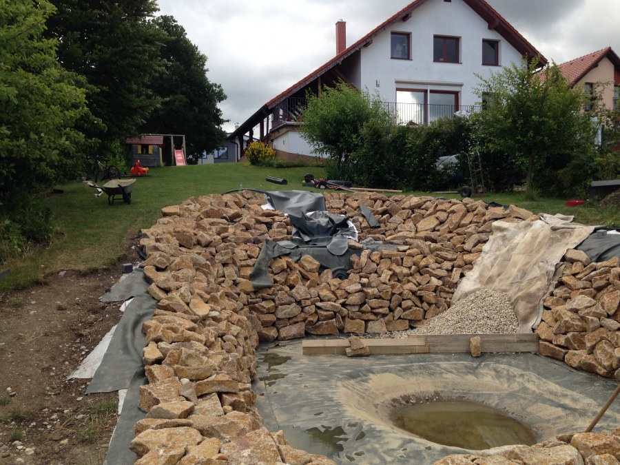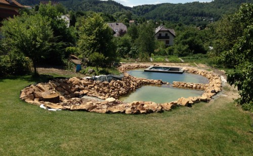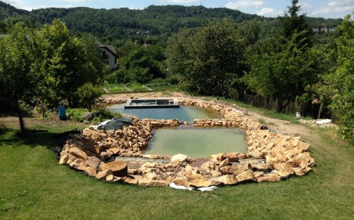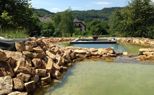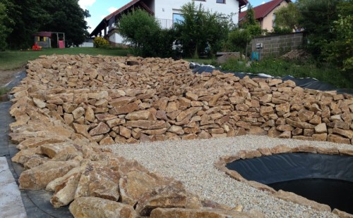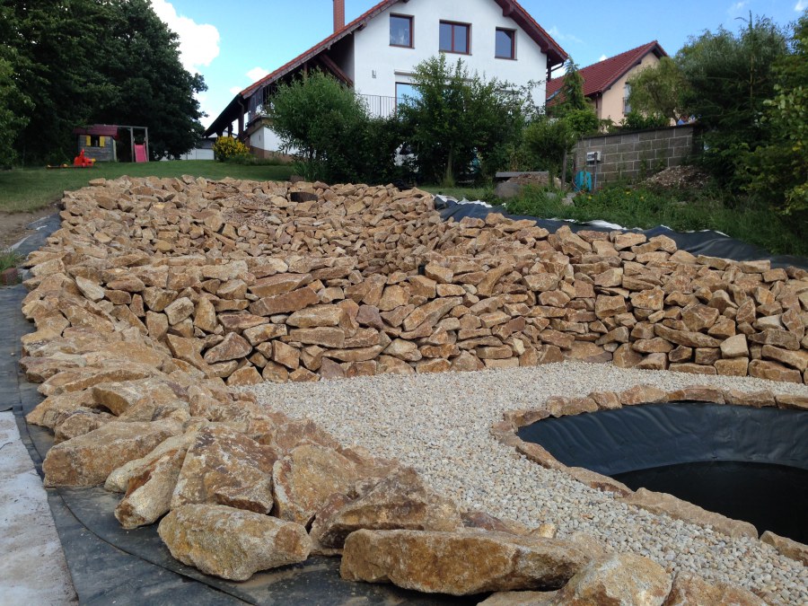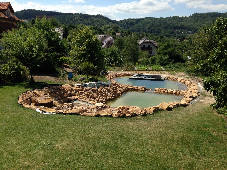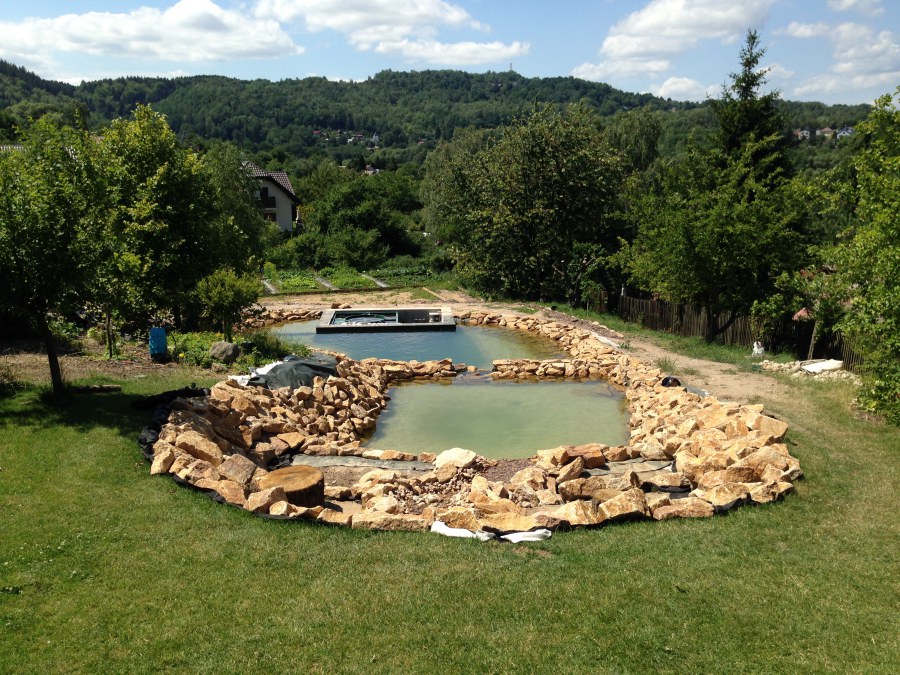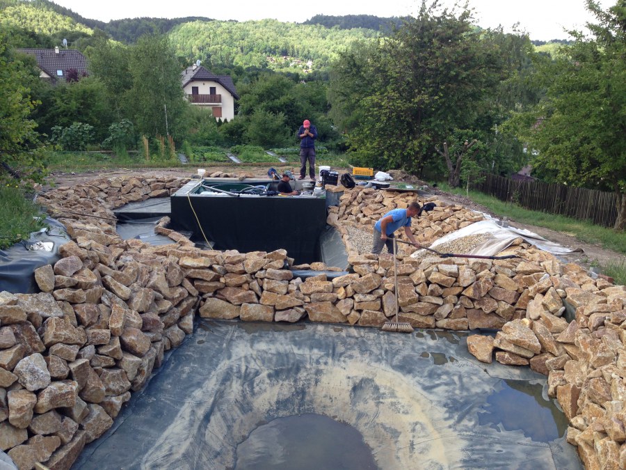 Toto krásné jezírko u Karlových Varů jsme stavili od výkopu po napuštění a usazení vodních květin. Jedna z posledních našich realizací na klíč. Jako vždy proběhla nejprve schůzka investora u nás na firmě. Vše se vymyslelo a pečlivě naplánovalo. V místě stavby se zajistil bagřík, který vyhloubil požadovaný tvar jezírka. Jezírko je ve svahu a tak se nabízelo ho vytvořit kaskádovitě s malým potůčkem, tůní a dolní koupací částí. Po vykopání se postavili základy ze ztraceného bednění, do nich se zabudovala fóliová příruba pro skimmer Oase AquaSkim Gravity, položila se gule, natáhlo potrubí a postavila technická místnost. Poté se vypískovalo dno kopaným pískem. Před samotným foliováním se položila geotextílie 500g, na hrany jezírka a schody se připevnili speciální fóliové lišty a na ně se následně navařila jezírková fólie Fatra Aquaplast 805/V olivově zelená. Po vyfóliování se ihned začala napouštět voda. Na břeh se začali vyskládávat kameny kubo, mělká zóna se vysypala kačírkem, v horní části jezírka se dokončila stavba potůčku. Vysadili se vodní květiny. Do technické místnosti jsme usadili biologicko-mechanický filtr Tripond Vortex-Center C115, na něj jsme napojili UV lampu TMC Pro Pond Advantage 110W a čerpadlo Oase AquaMax Gravity 20000. Na potok, který tvoří samostatný okruh se připojilo čerpadlo AquaForte O-Series 18000.