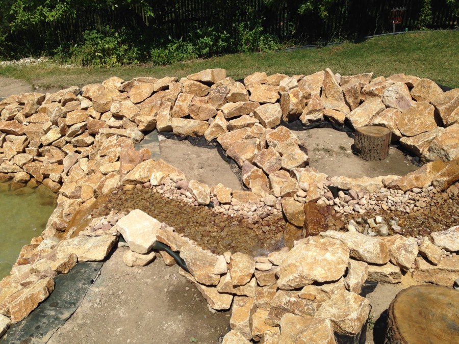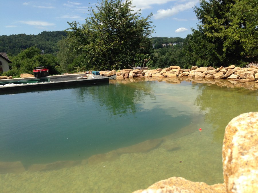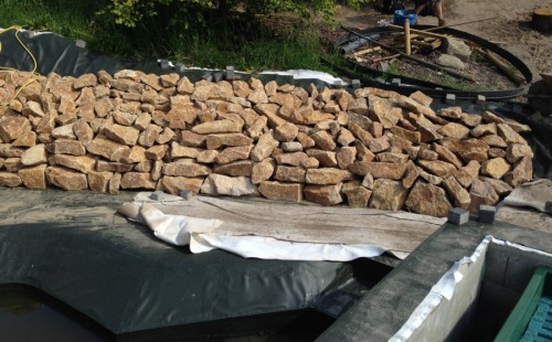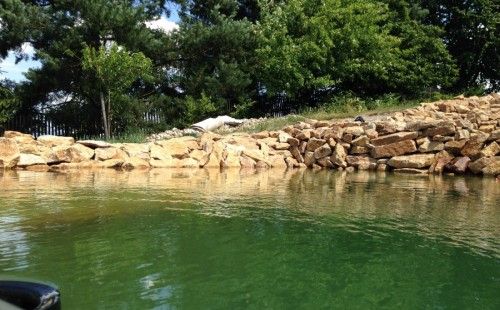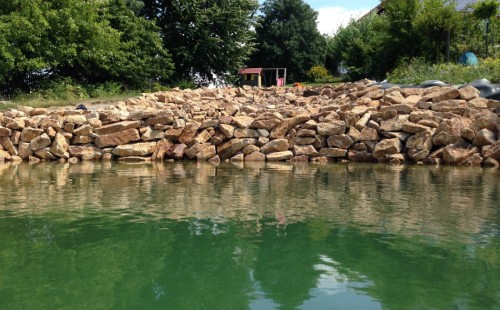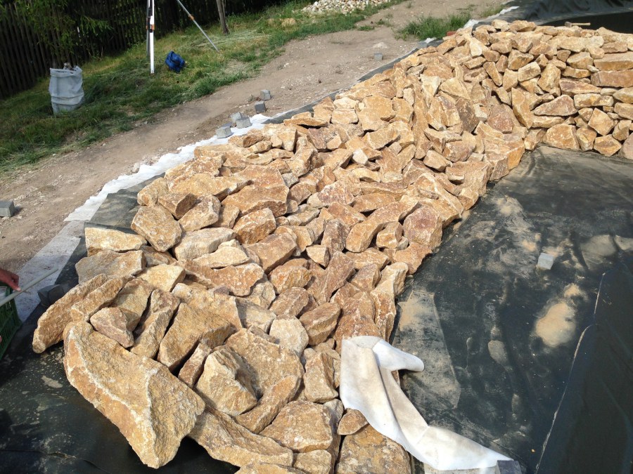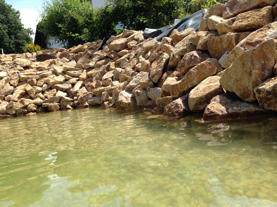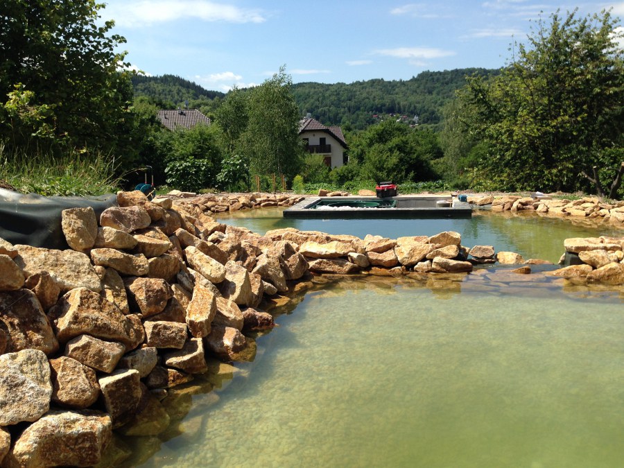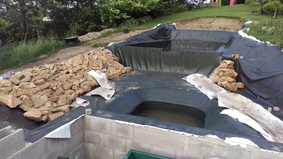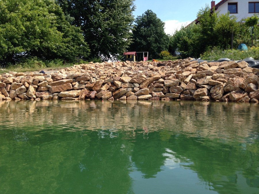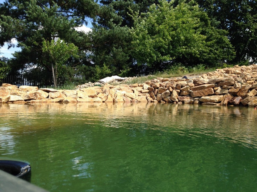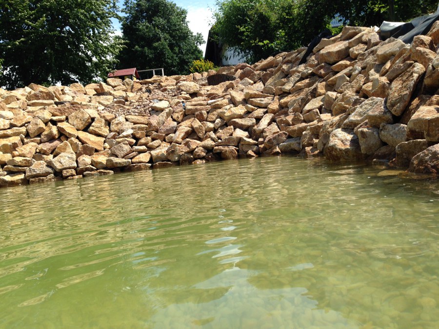 Toto krásné jezírko u Karlových Varů jsme stavili od výkopu po napuštění a usazení vodních květin. Jedna z posledních našich realizací na klíč. Jako vždy proběhla nejprve schůzka investora u nás na firmě. Vše se vymyslelo a pečlivě naplánovalo. V místě stavby se zajistil bagřík, který vyhloubil požadovaný tvar jezírka. Jezírko je ve svahu a tak se nabízelo ho vytvořit kaskádovitě s malým potůčkem, tůní a dolní koupací částí. Po vykopání se postavili základy ze ztraceného bednění, do nich se zabudovala fóliová příruba pro skimmer Oase AquaSkim Gravity, položila se gule, natáhlo potrubí a postavila technická místnost. Poté se vypískovalo dno kopaným pískem. Před samotným foliováním se položila geotextílie 500g, na hrany jezírka a schody se připevnili speciální fóliové lišty a na ně se následně navařila jezírková fólie Fatra Aquaplast 805/V olivově zelená. Po vyfóliování se ihned začala napouštět voda. Na břeh se začali vyskládávat kameny kubo, mělká zóna se vysypala kačírkem, v horní části jezírka se dokončila stavba potůčku. Vysadili se vodní květiny. Do technické místnosti jsme usadili biologicko-mechanický filtr Tripond Vortex-Center C115, na něj jsme napojili UV lampu TMC Pro Pond Advantage 110W a čerpadlo Oase AquaMax Gravity 20000. Na potok, který tvoří samostatný okruh se připojilo čerpadlo AquaForte O-Series 18000.