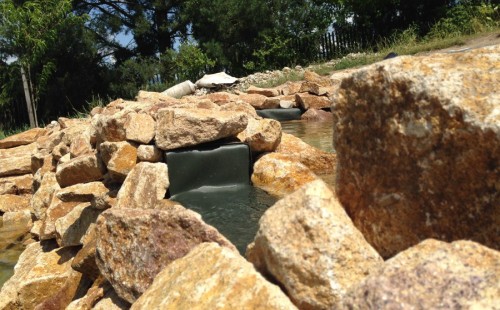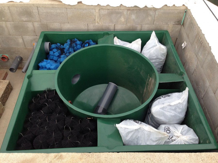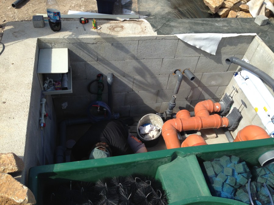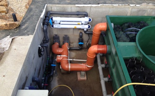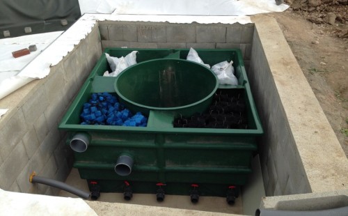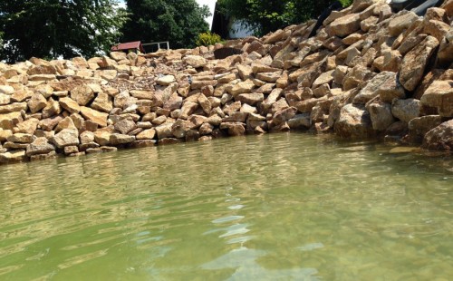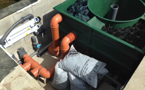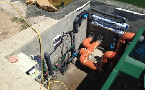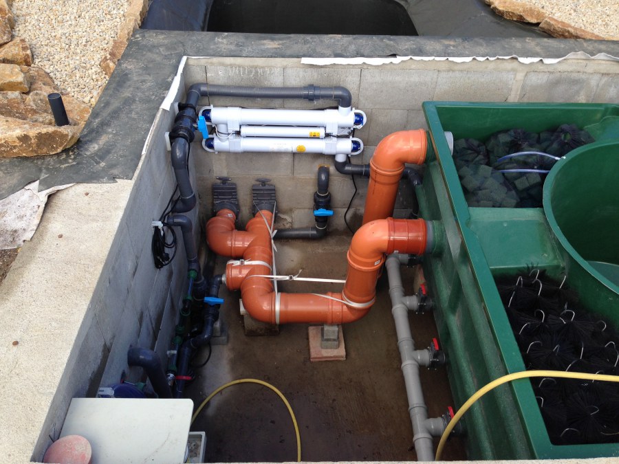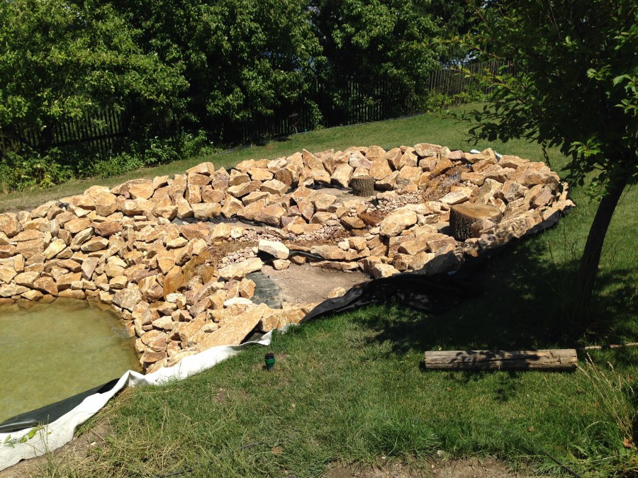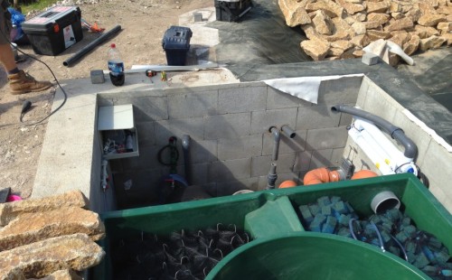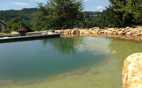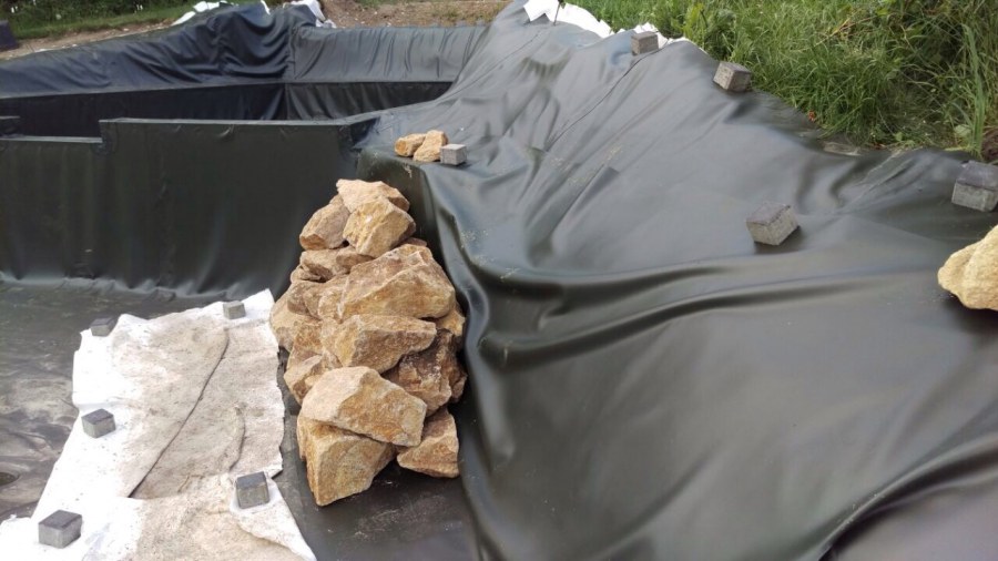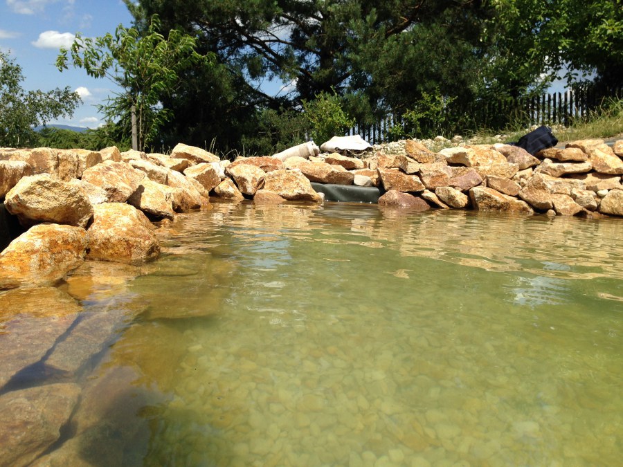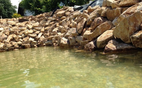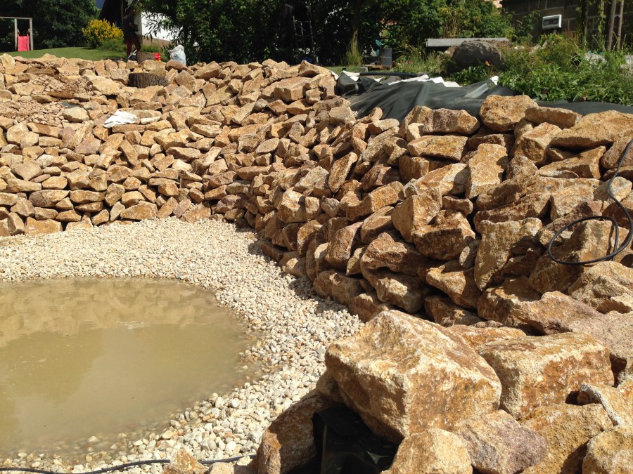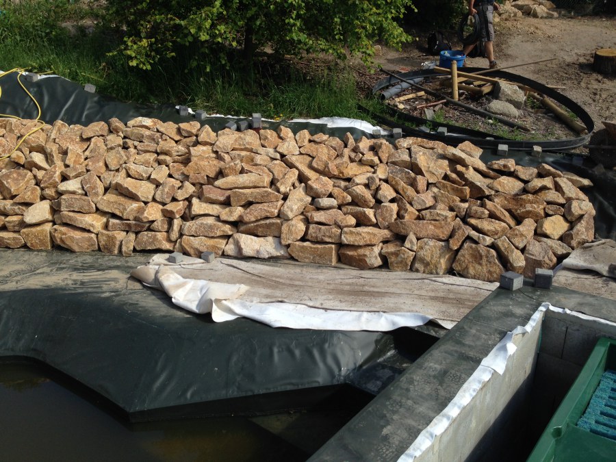Toto krásné jezírko u Karlových Varů jsme stavili od výkopu po napuštění a usazení vodních květin. Jedna z posledních našich realizací na klíč. Jako vždy proběhla nejprve schůzka investora u nás na firmě. Vše se vymyslelo a pečlivě naplánovalo. V místě stavby se zajistil bagřík, který vyhloubil požadovaný tvar jezírka. Jezírko je ve svahu a tak se nabízelo ho vytvořit kaskádovitě s malým potůčkem, tůní a dolní koupací částí. Po vykopání se postavili základy ze ztraceného bednění, do nich se zabudovala fóliová příruba pro skimmer Oase AquaSkim Gravity, položila se gule, natáhlo potrubí a postavila technická místnost. Poté se vypískovalo dno kopaným pískem. Před samotným foliováním se položila geotextílie 500g, na hrany jezírka a schody se připevnili speciální fóliové lišty a na ně se následně navařila jezírková fólie Fatra Aquaplast 805/V olivově zelená. Po vyfóliování se ihned začala napouštět voda. Na břeh se začali vyskládávat kameny kubo, mělká zóna se vysypala kačírkem, v horní části jezírka se dokončila stavba potůčku. Vysadili se vodní květiny. Do technické místnosti jsme usadili biologicko-mechanický filtr Tripond Vortex-Center C115, na něj jsme napojili UV lampu TMC Pro Pond Advantage 110W a čerpadlo Oase AquaMax Gravity 20000. Na potok, který tvoří samostatný okruh se připojilo čerpadlo AquaForte O-Series 18000.