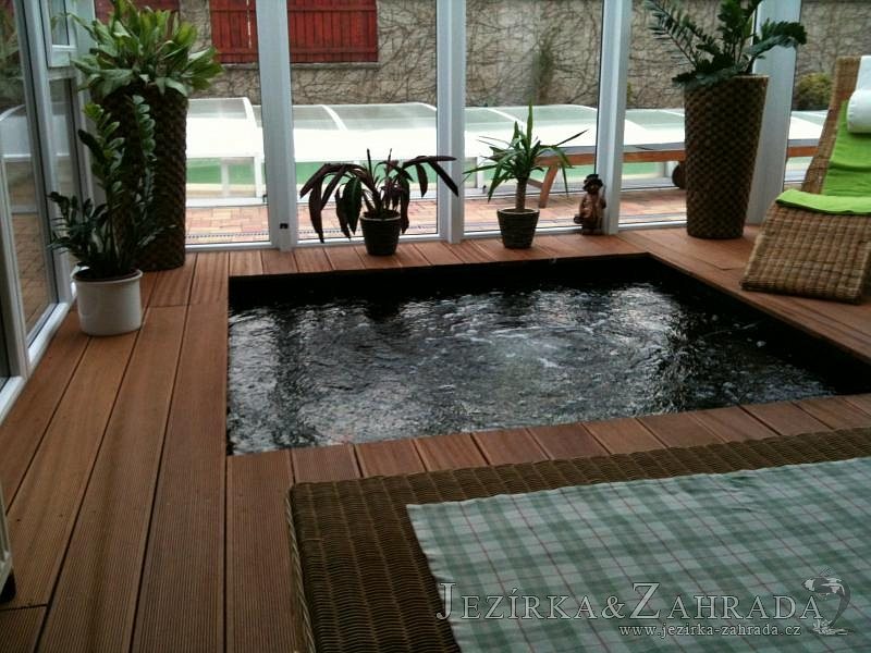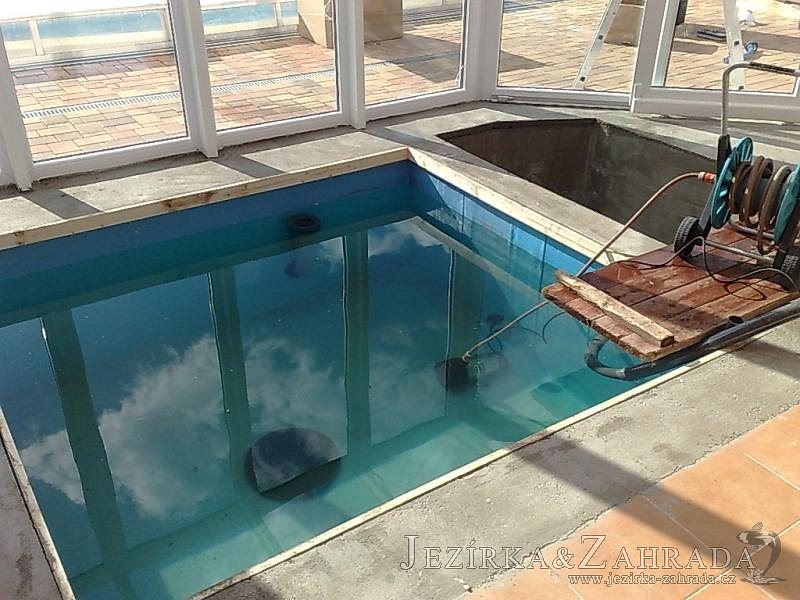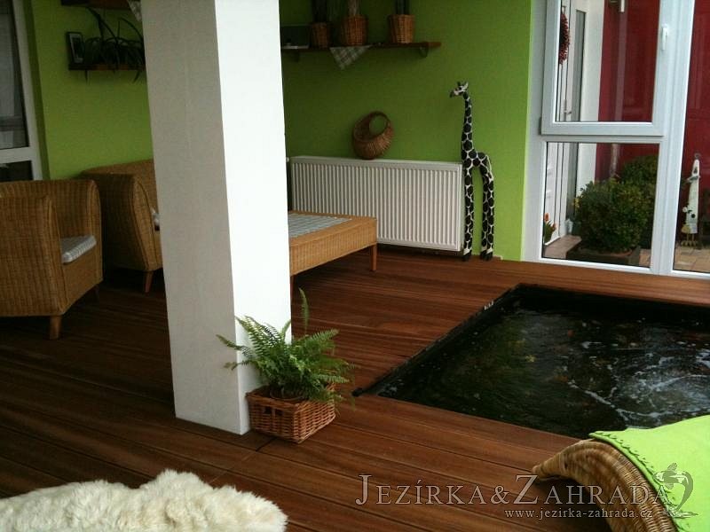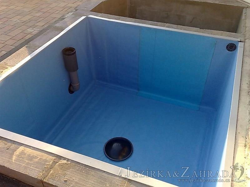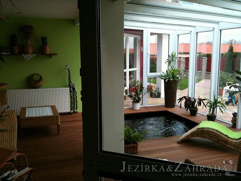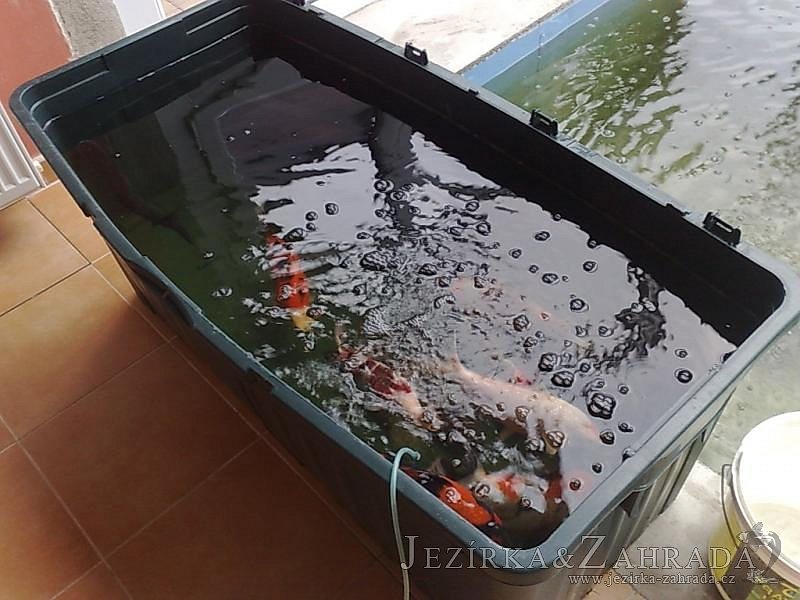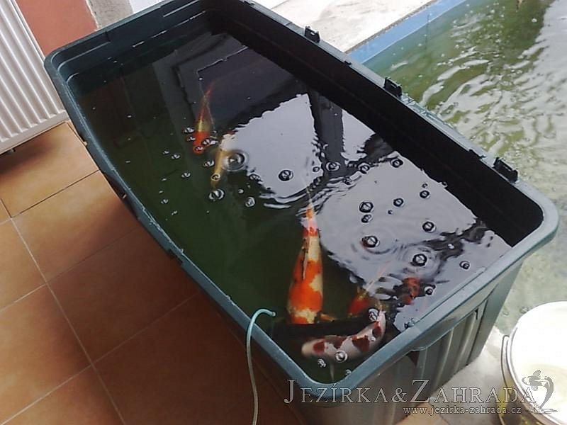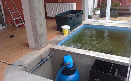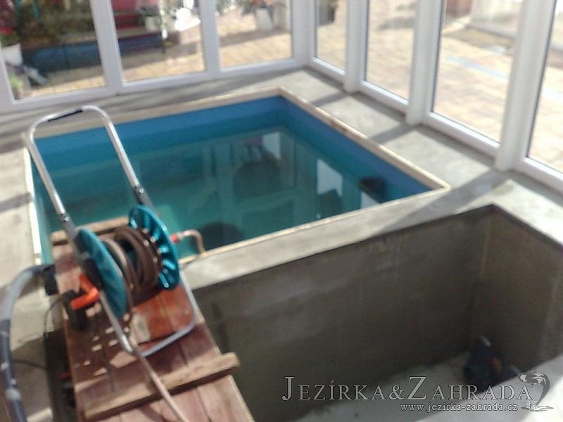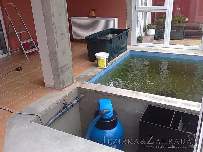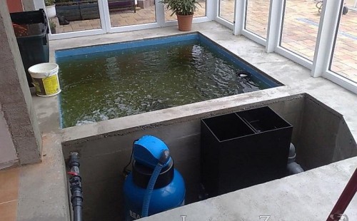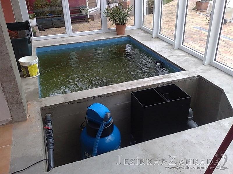 Výstavba zimní odchovny pro japonské KOI kapry v zimní zahradě rodinného domu. Rozměr jezírka 2200x2200x1300mm - 6,3m3. Navržená technologie: filtrace Bead filtr 500, 100l Kaldnes K1, čerpadlo 20 000l/hod, UV lampa TMC Pro Clear Ultima 30W, vzduchovací zařízení Resun LP 60, difuzér, gula dnová výpusť 110mm a trubkový skimmer Oase AquaSkim Gravity. Teplota vody přes zimu bez vytápění od 19 stupňů C a více. Nasazené ryby: pouze japonští KOI.