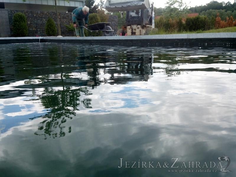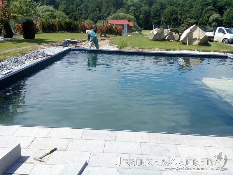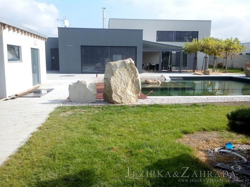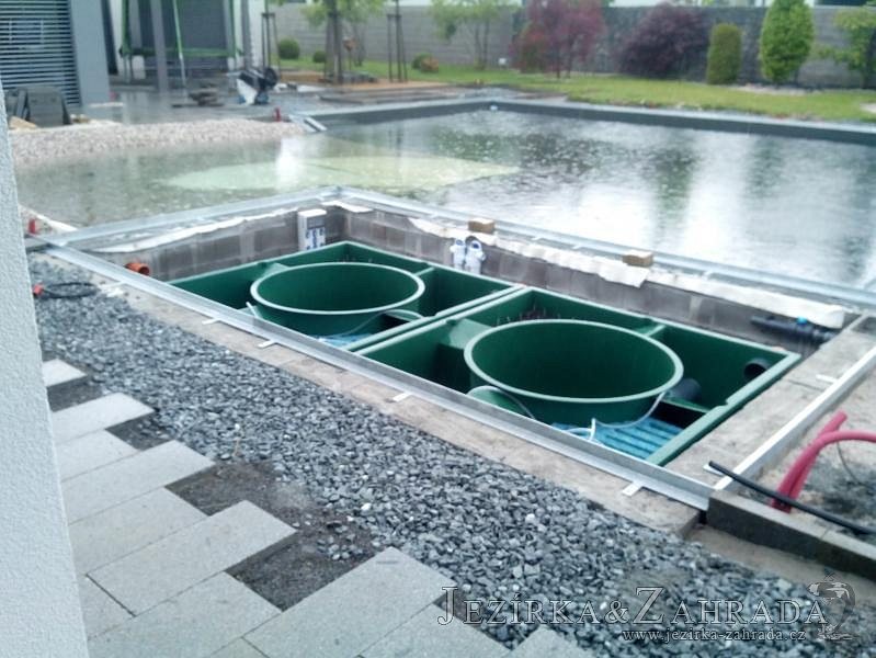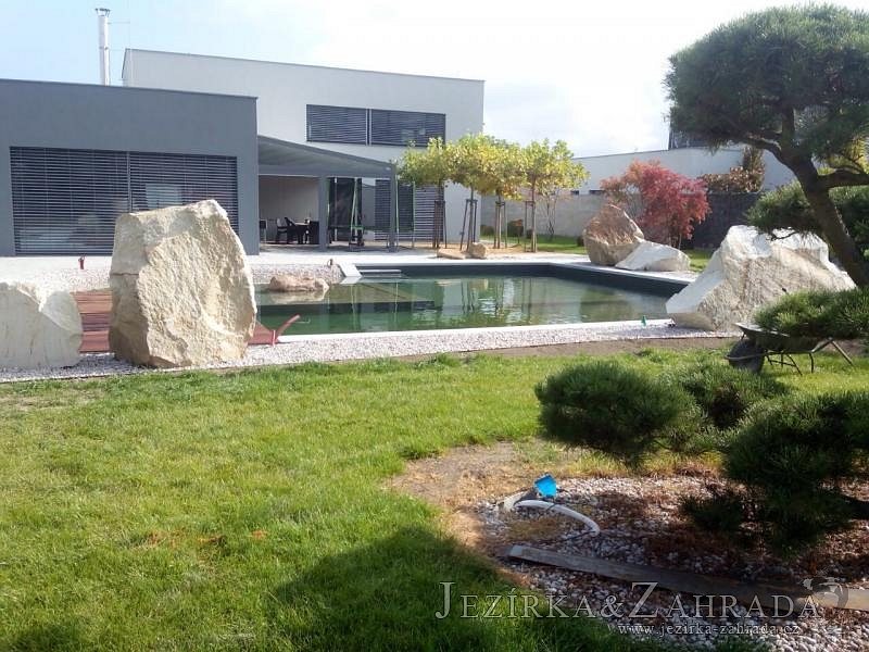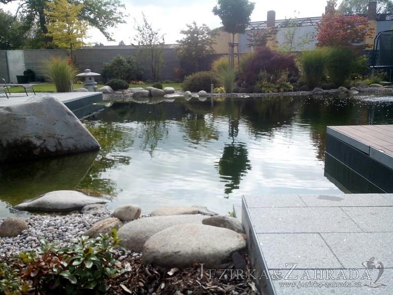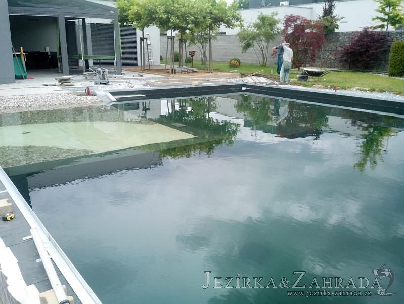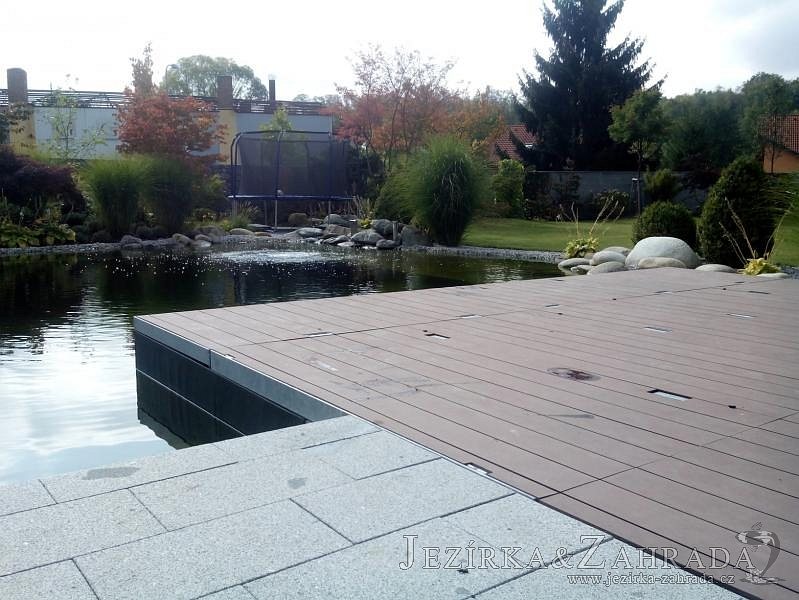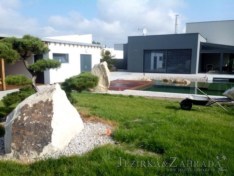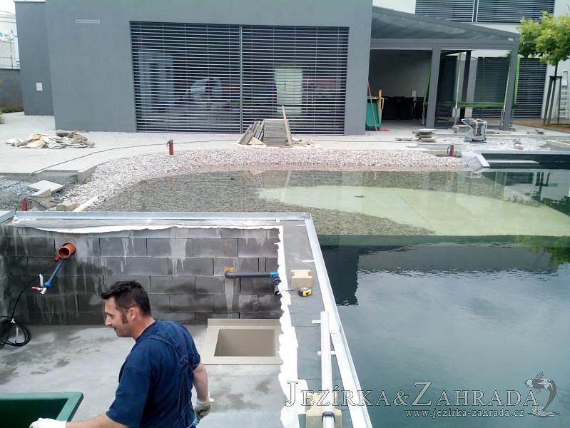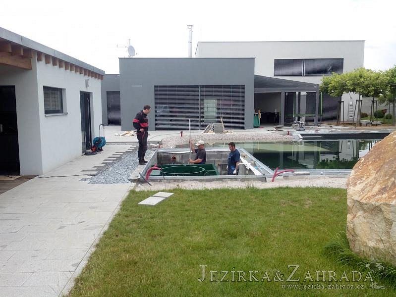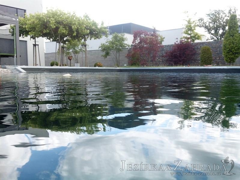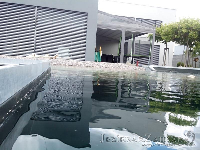 Moderní koupací jezírko v podobném stylu jako jsme již realizovali v loňském roce také v Plzni. Koupací jezírko ideálně zapadá k moderní stavbě a je zakomponováno do velmi rozlehlé zahrady. Po vykopání jezírka, postavení obvodových stěn ze ztraceného bednění se položilo potrubí, zapískovalo, zabetonovalo, položila se geotextílie 500g a svařila na míru fólie Fatra Aquaplast 805 1,5mm olivově zelená. Pro tento systém byla navržená technologie: 2x mechanicko-biologický filtr Tripond Center-Vortex C115 zapojený gravitačně a každý filtr je osazen UV lampou TMC Pro Pond Advantage 110W dále pak úsporným čerpadlem Oase Aquamax Gravity Eco 20000. Byla zde použita 2x gula dnová vpusť 110mm, 2x skimmer Oase AquaSkim Gravity a vzduchovací motor Hailea HAP-100 zásobuje přes rozvod vzduchu z PP jezírko tak i obě filtrace. Do jezírka byly nainstalovány velké okrasné kameny, které se poté opakují i na zahradě. Břeh jezírka byl obložen okrasnými dlaždicemi a kačírkem a technická místnost byla zakryta podlahou z exotického dřeva.