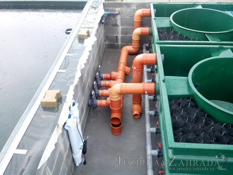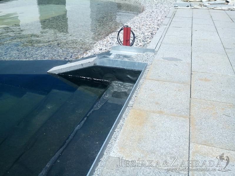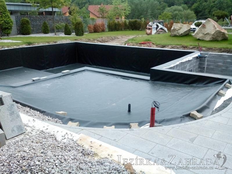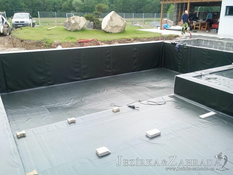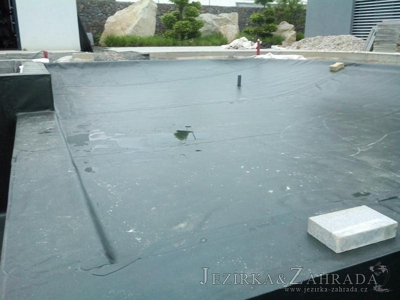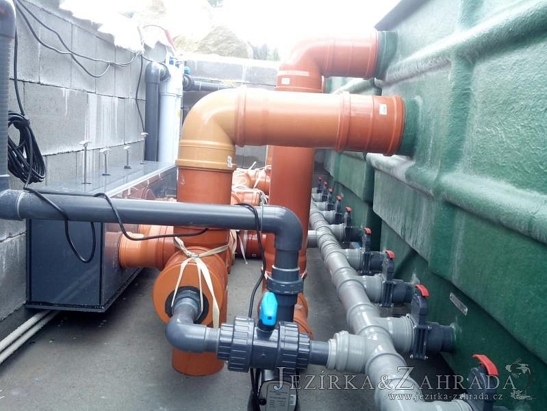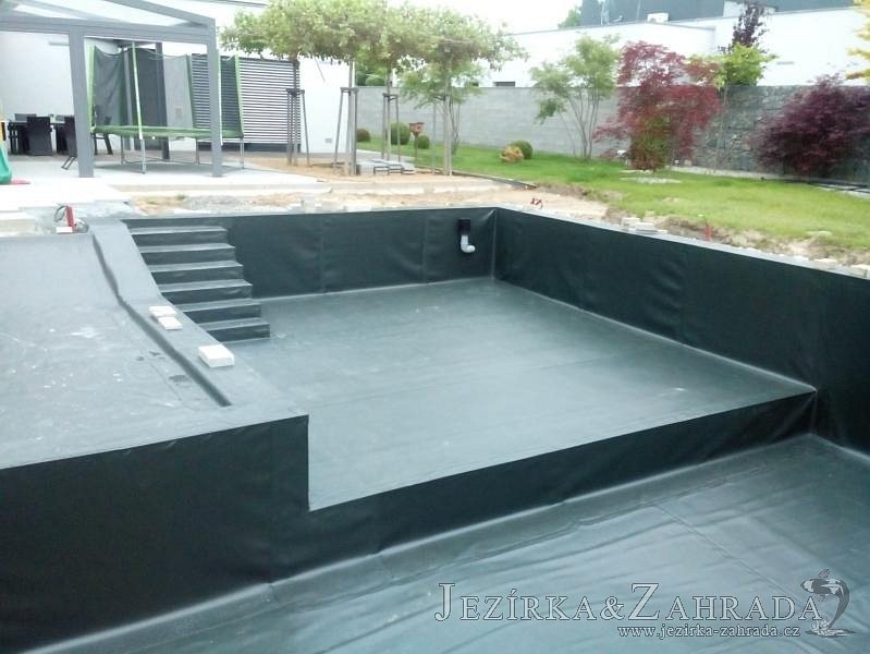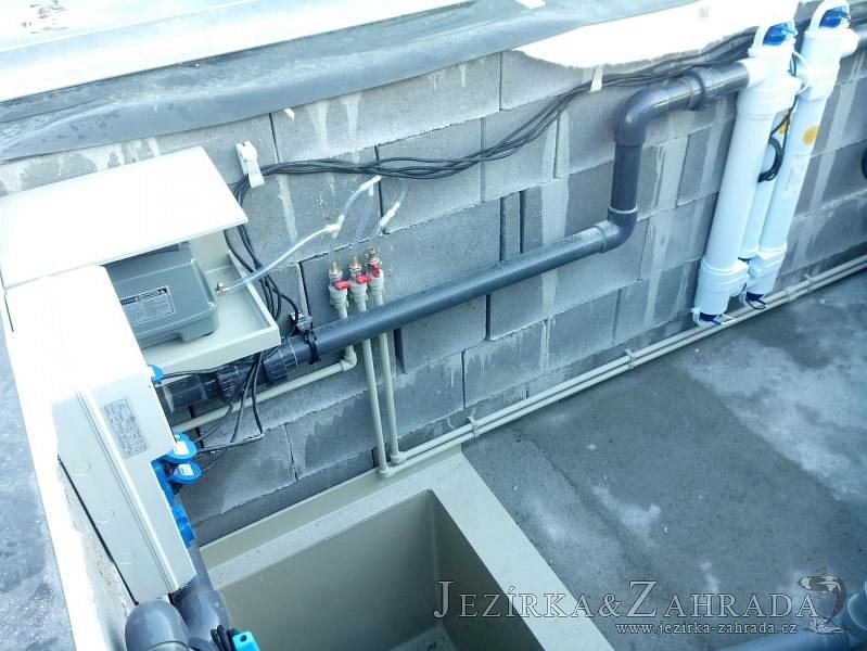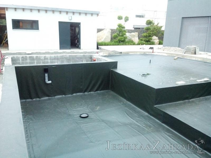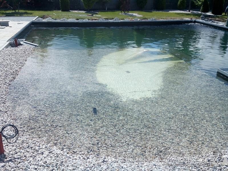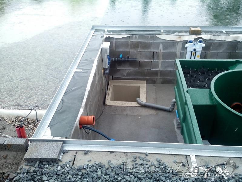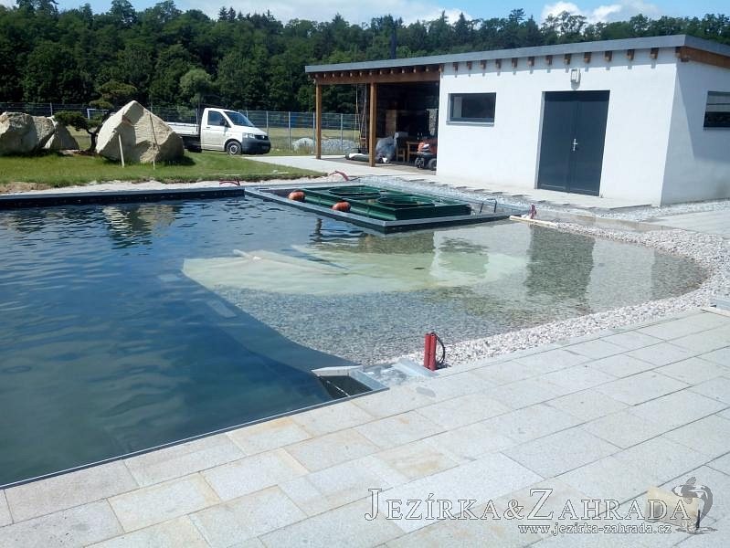 Moderní koupací jezírko v podobném stylu jako jsme již realizovali v loňském roce také v Plzni. Koupací jezírko ideálně zapadá k moderní stavbě a je zakomponováno do velmi rozlehlé zahrady. Po vykopání jezírka, postavení obvodových stěn ze ztraceného bednění se položilo potrubí, zapískovalo, zabetonovalo, položila se geotextílie 500g a svařila na míru fólie Fatra Aquaplast 805 1,5mm olivově zelená. Pro tento systém byla navržená technologie: 2x mechanicko-biologický filtr Tripond Center-Vortex C115 zapojený gravitačně a každý filtr je osazen UV lampou TMC Pro Pond Advantage 110W dále pak úsporným čerpadlem Oase Aquamax Gravity Eco 20000. Byla zde použita 2x gula dnová vpusť 110mm, 2x skimmer Oase AquaSkim Gravity a vzduchovací motor Hailea HAP-100 zásobuje přes rozvod vzduchu z PP jezírko tak i obě filtrace. Do jezírka byly nainstalovány velké okrasné kameny, které se poté opakují i na zahradě. Břeh jezírka byl obložen okrasnými dlaždicemi a kačírkem a technická místnost byla zakryta podlahou z exotického dřeva.