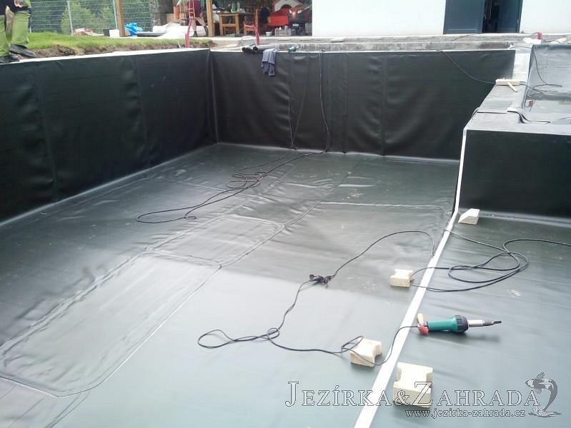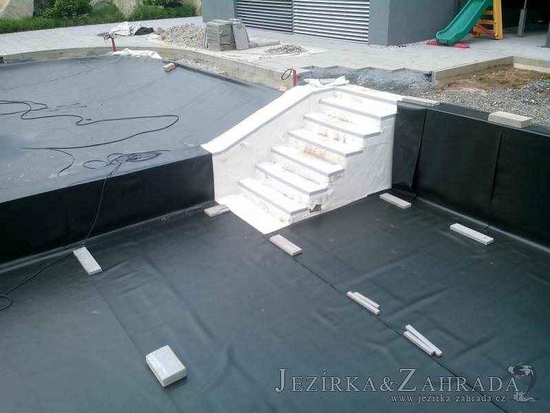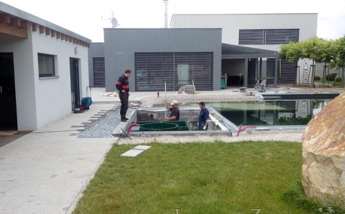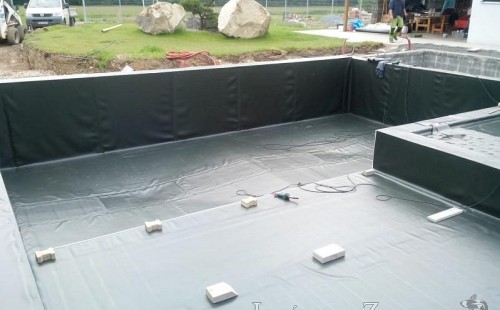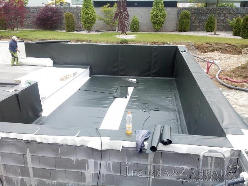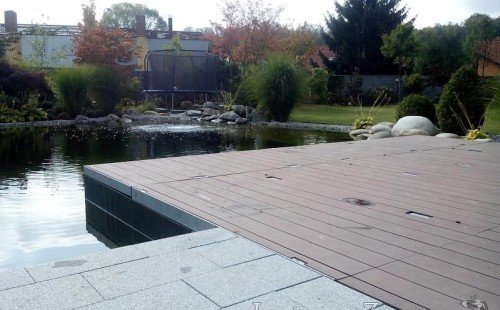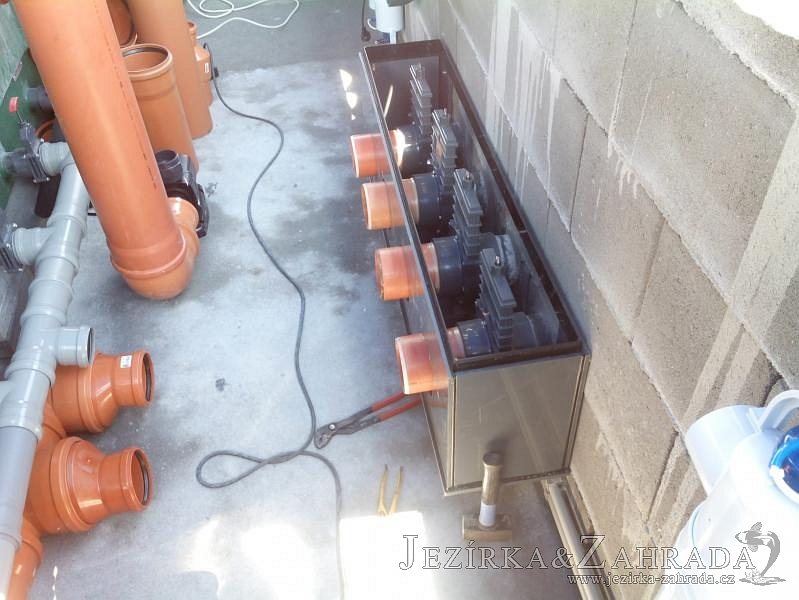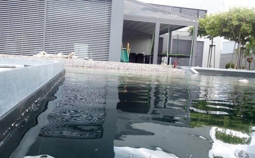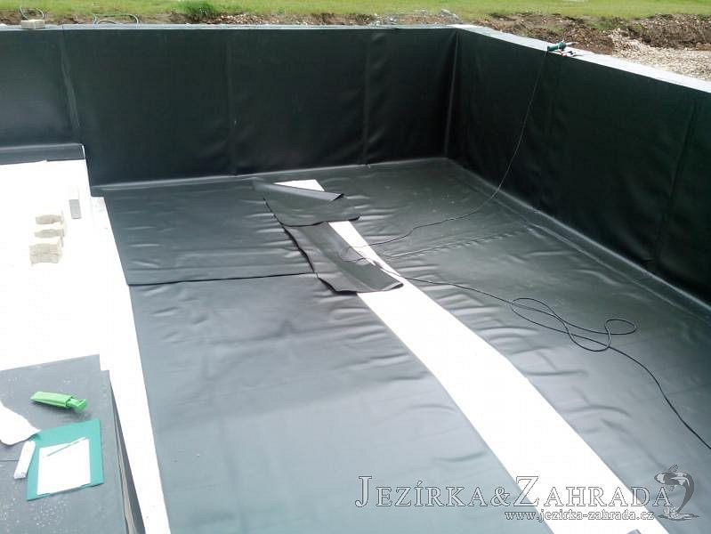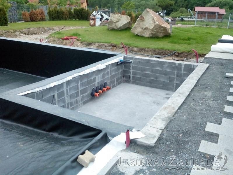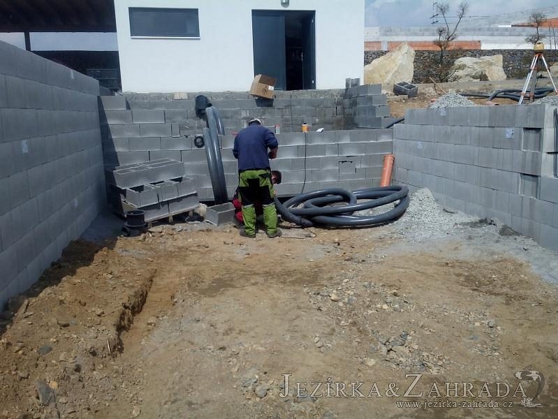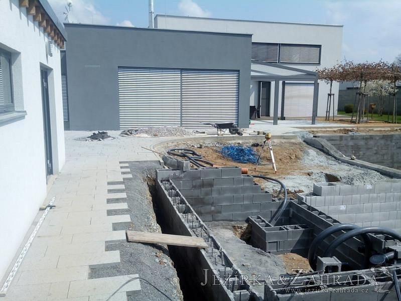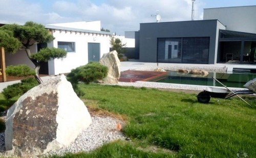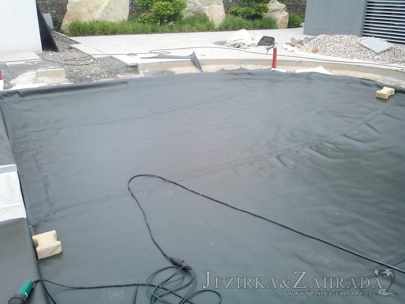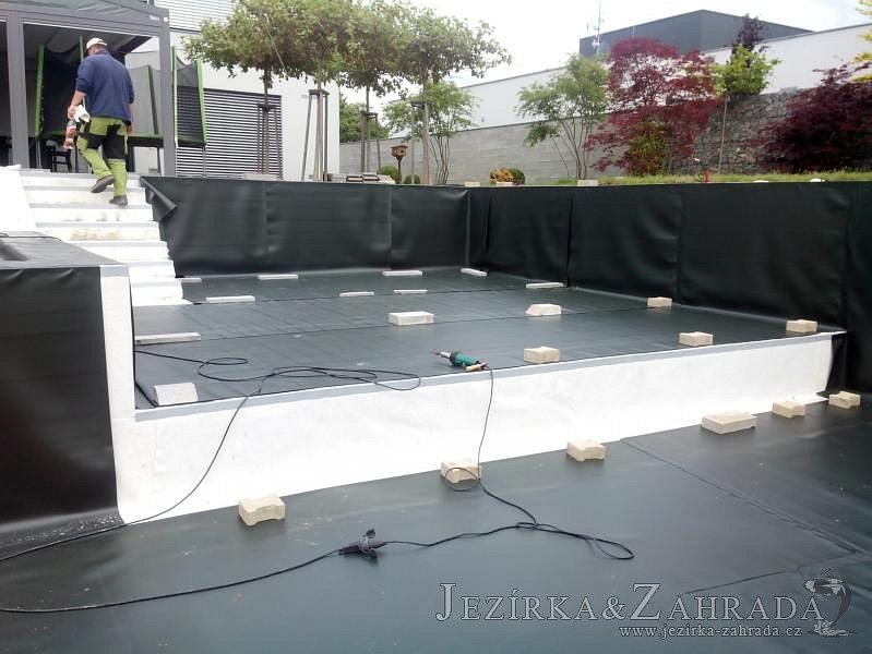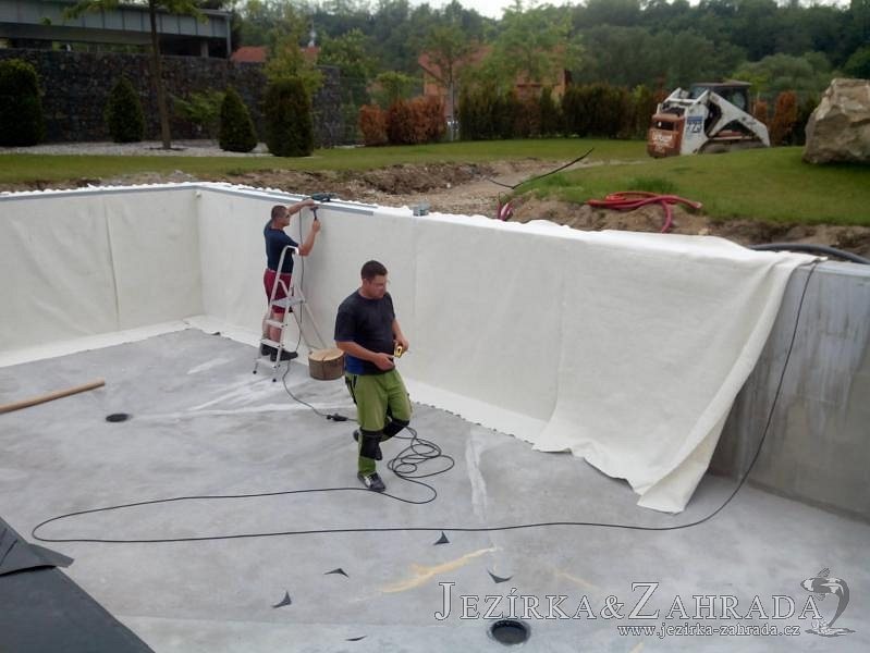 Moderní koupací jezírko v podobném stylu jako jsme již realizovali v loňském roce také v Plzni. Koupací jezírko ideálně zapadá k moderní stavbě a je zakomponováno do velmi rozlehlé zahrady. Po vykopání jezírka, postavení obvodových stěn ze ztraceného bednění se položilo potrubí, zapískovalo, zabetonovalo, položila se geotextílie 500g a svařila na míru fólie Fatra Aquaplast 805 1,5mm olivově zelená. Pro tento systém byla navržená technologie: 2x mechanicko-biologický filtr Tripond Center-Vortex C115 zapojený gravitačně a každý filtr je osazen UV lampou TMC Pro Pond Advantage 110W dále pak úsporným čerpadlem Oase Aquamax Gravity Eco 20000. Byla zde použita 2x gula dnová vpusť 110mm, 2x skimmer Oase AquaSkim Gravity a vzduchovací motor Hailea HAP-100 zásobuje přes rozvod vzduchu z PP jezírko tak i obě filtrace. Do jezírka byly nainstalovány velké okrasné kameny, které se poté opakují i na zahradě. Břeh jezírka byl obložen okrasnými dlaždicemi a kačírkem a technická místnost byla zakryta podlahou z exotického dřeva.