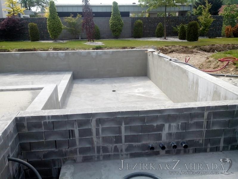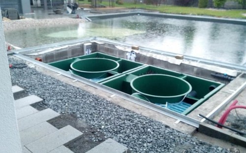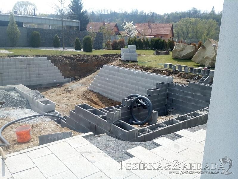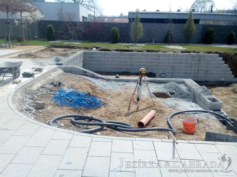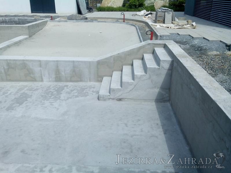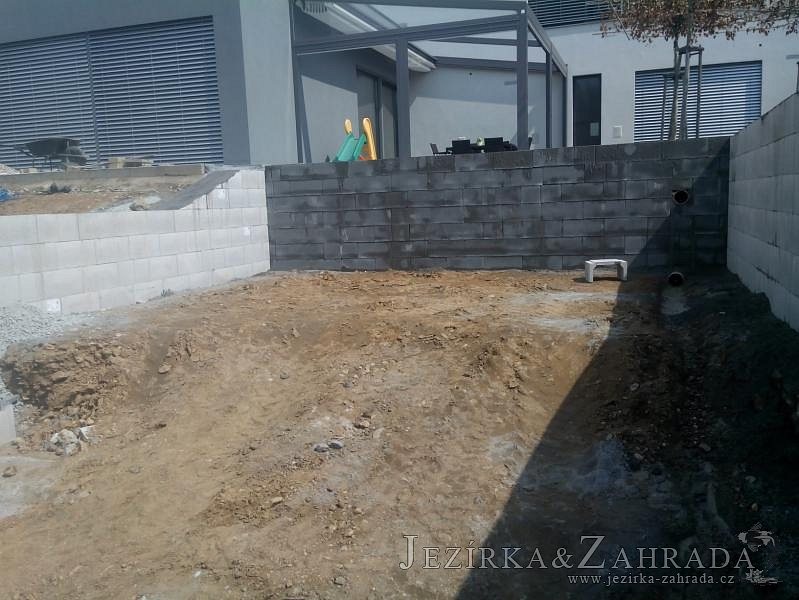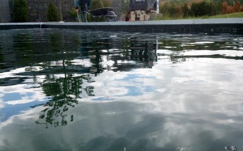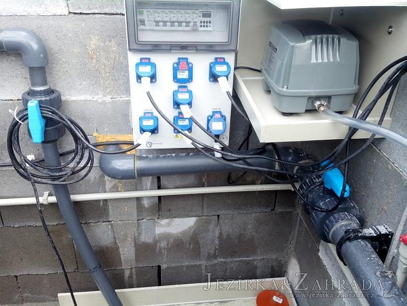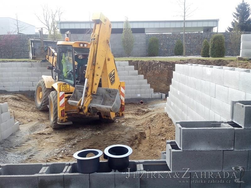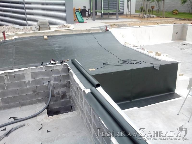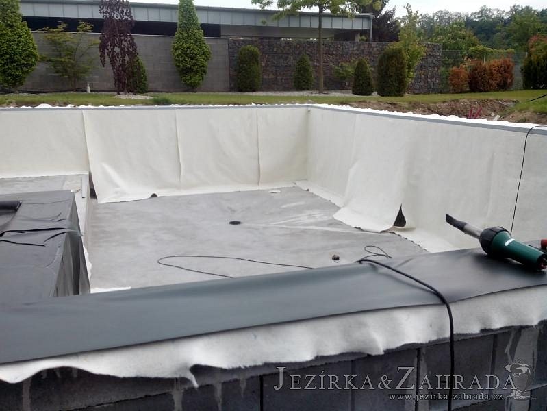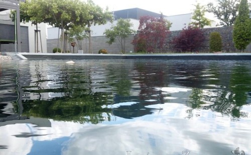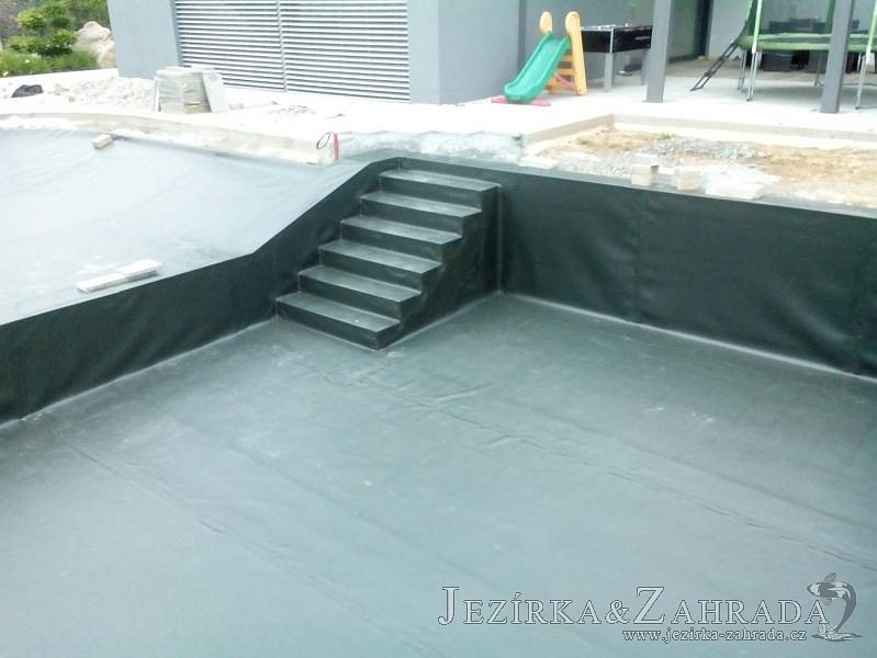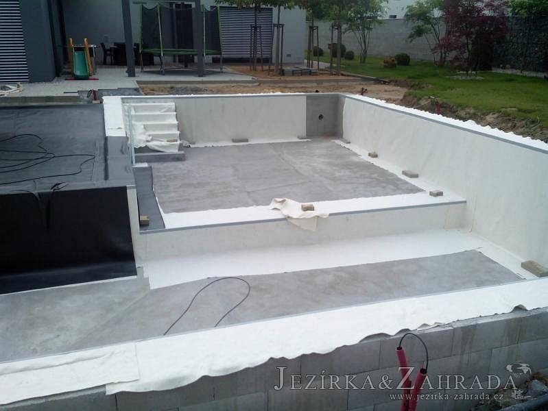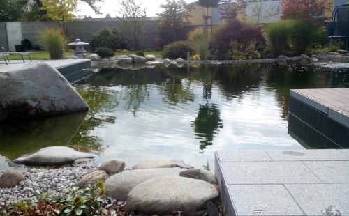 Moderní koupací jezírko v podobném stylu jako jsme již realizovali v loňském roce také v Plzni. Koupací jezírko ideálně zapadá k moderní stavbě a je zakomponováno do velmi rozlehlé zahrady. Po vykopání jezírka, postavení obvodových stěn ze ztraceného bednění se položilo potrubí, zapískovalo, zabetonovalo, položila se geotextílie 500g a svařila na míru fólie Fatra Aquaplast 805 1,5mm olivově zelená. Pro tento systém byla navržená technologie: 2x mechanicko-biologický filtr Tripond Center-Vortex C115 zapojený gravitačně a každý filtr je osazen UV lampou TMC Pro Pond Advantage 110W dále pak úsporným čerpadlem Oase Aquamax Gravity Eco 20000. Byla zde použita 2x gula dnová vpusť 110mm, 2x skimmer Oase AquaSkim Gravity a vzduchovací motor Hailea HAP-100 zásobuje přes rozvod vzduchu z PP jezírko tak i obě filtrace. Do jezírka byly nainstalovány velké okrasné kameny, které se poté opakují i na zahradě. Břeh jezírka byl obložen okrasnými dlaždicemi a kačírkem a technická místnost byla zakryta podlahou z exotického dřeva.