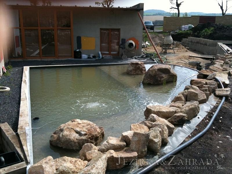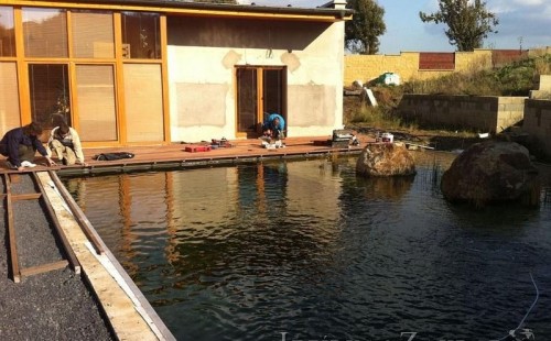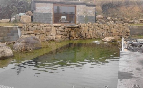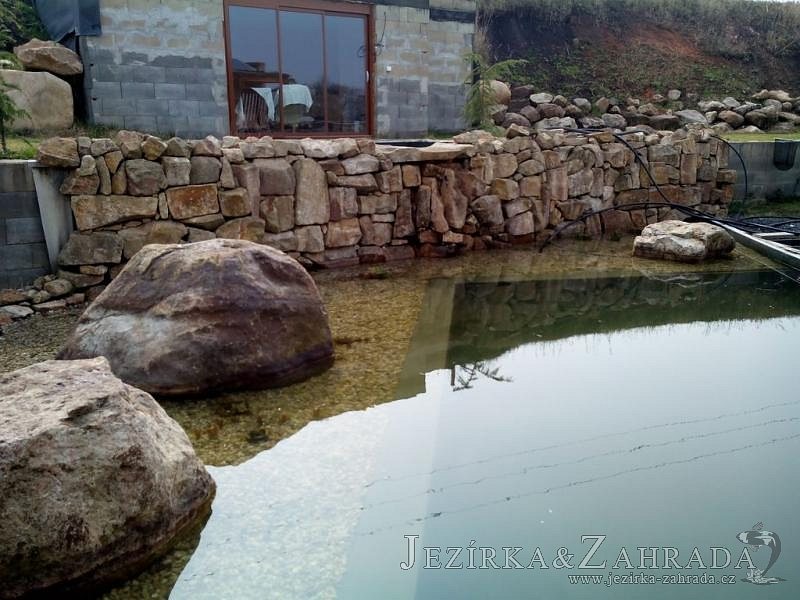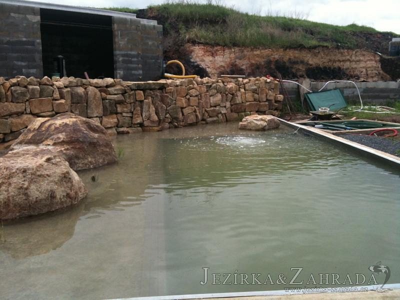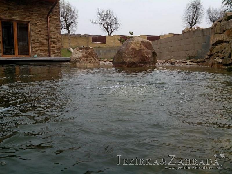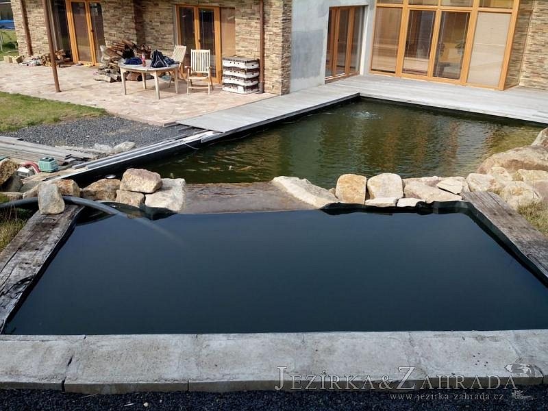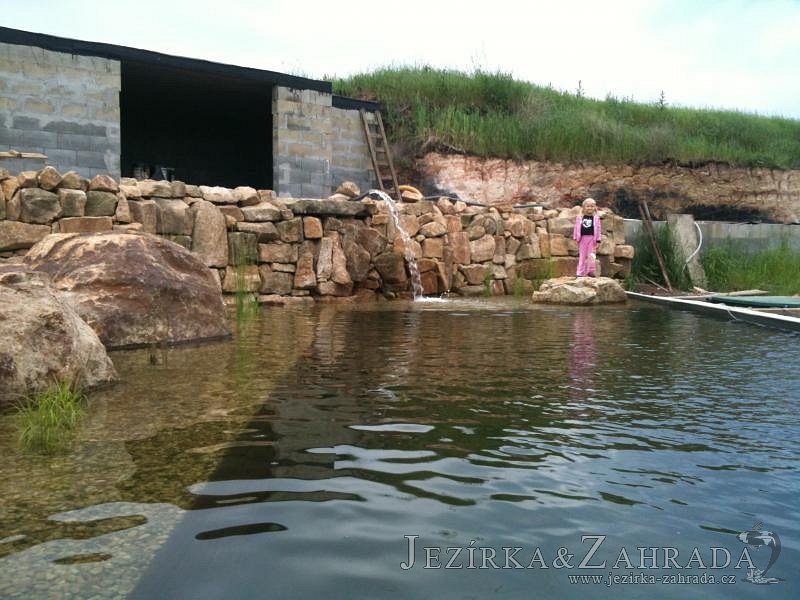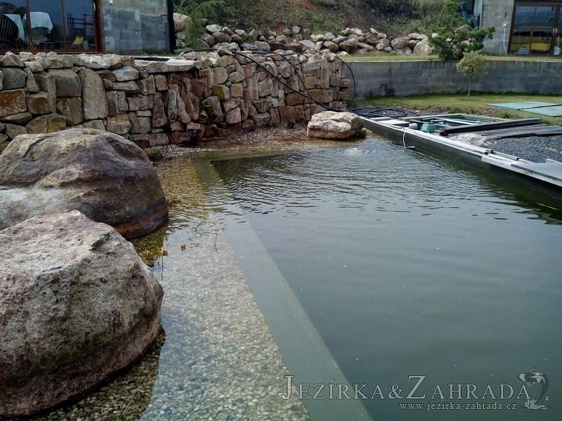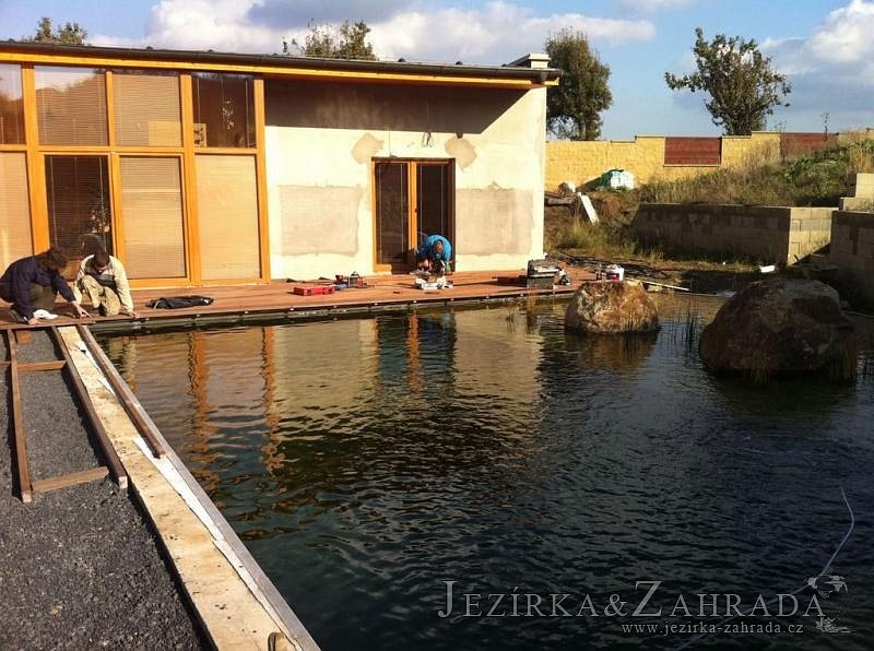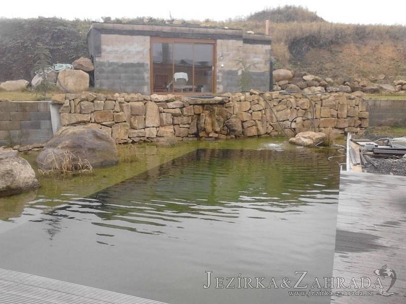 U moderní novostavby si klient přál postavit koupací jezírka o velikosti cca. 65m3. Ze ztraceného bednění se postavil obvod jezírka a technická místnost. Připravilo se potrubí vedoucí k technologii, zabetonovalo se, položila se geotextílie 500g, přidělaly se speciální fóliové lišty pro uchycení jezírkové fólie Fatra Aquaplast 805/V 1,5mm olivově zelené. K jezírku navazuje stěna obložená okrasnými kameny a po nich padá voda z malého horního jezírka. Stavba terasy okolo koupací části z exotického dřeva (Bankgirai). V mělčině je použit kačírek s 2 velkými okrasnými kameny. Systém je zapojen gravitačně: biologicko-mechanická filtrace Tripond Center-Vortex C115, odkalovací jímka s kalovým čerpadlem, UV lampa TMC Pro Pond Advantage 110W, čerpadlo 28000l/hod, vzduchovací čerpadlo Resun LP 100.