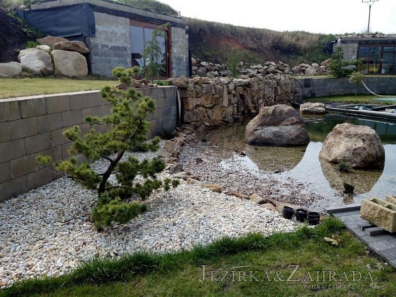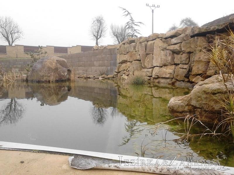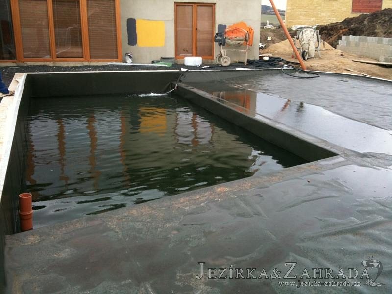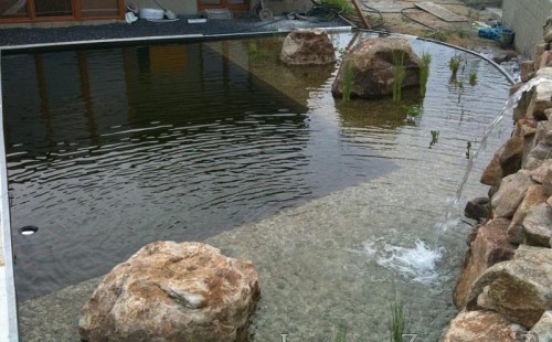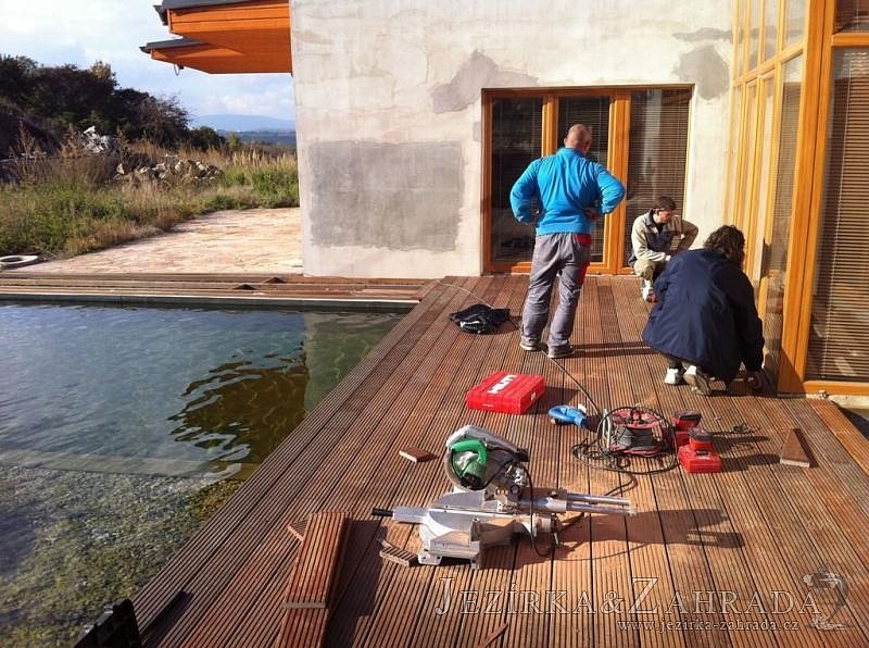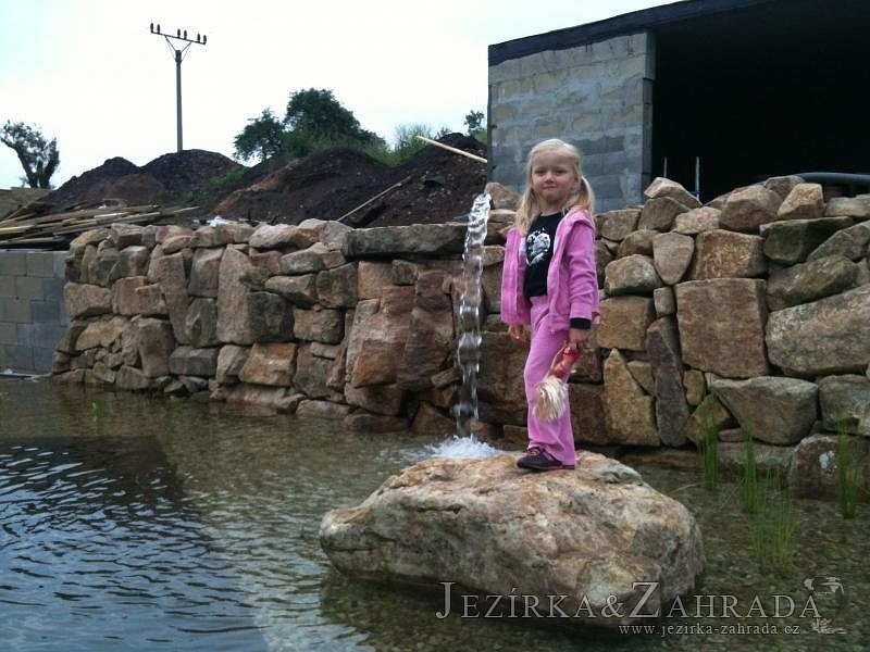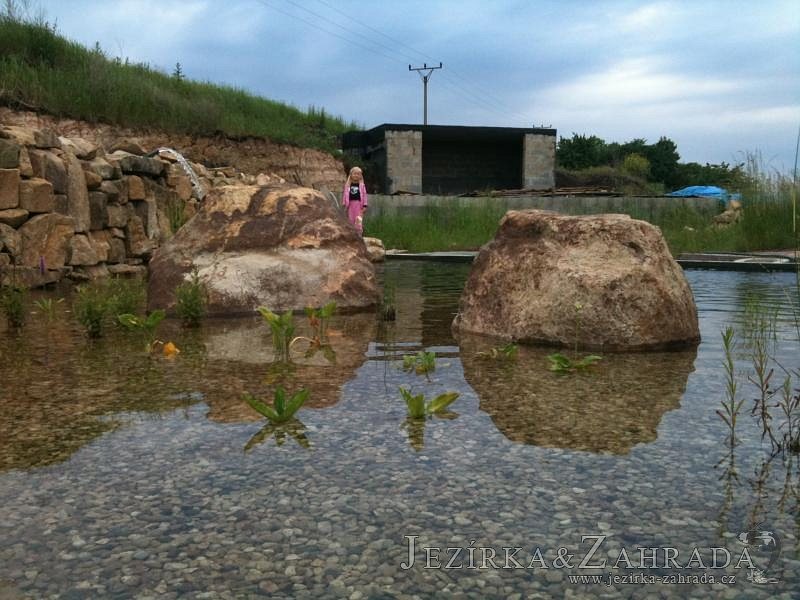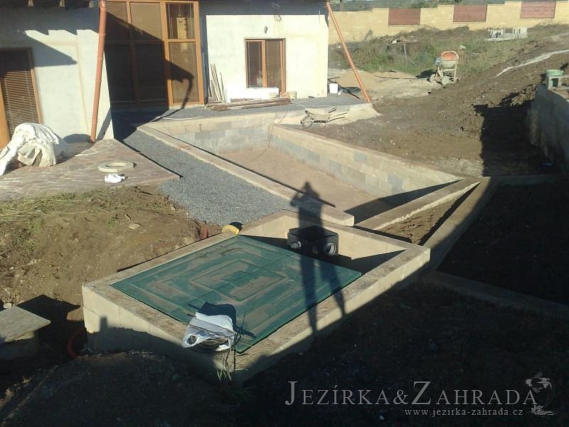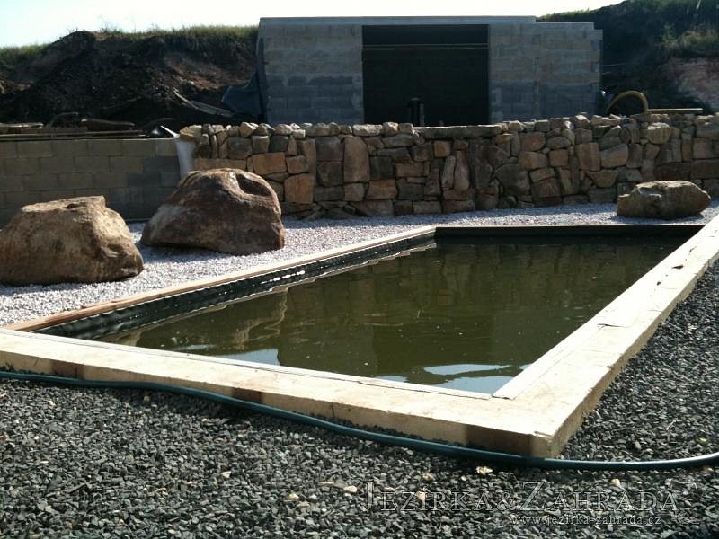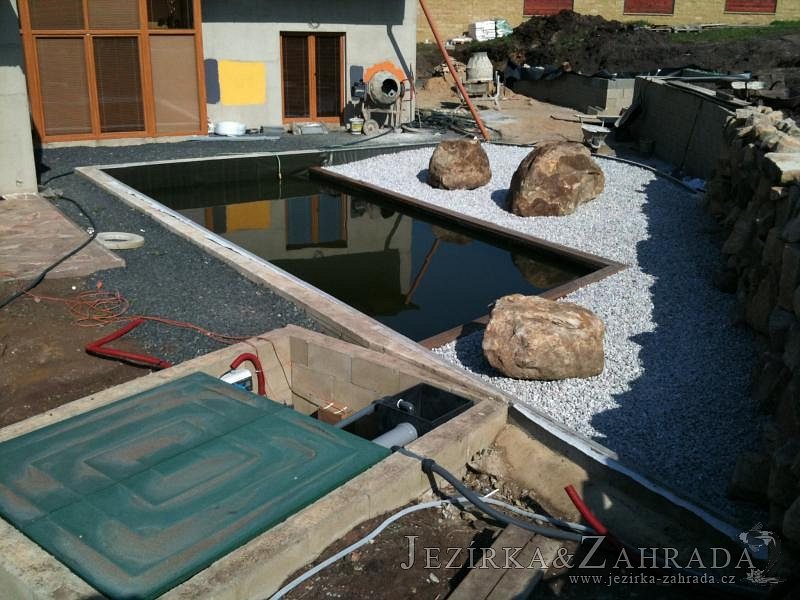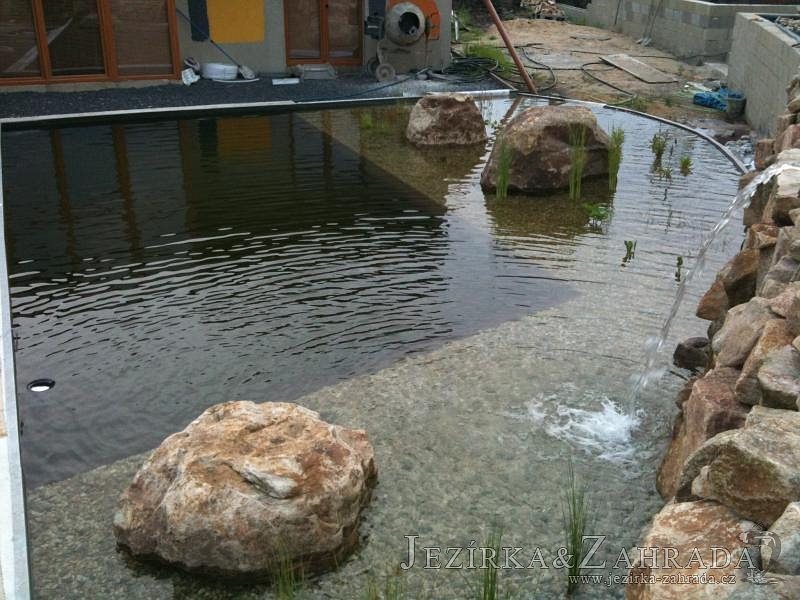U moderní novostavby si klient přál postavit koupací jezírka o velikosti cca. 65m3. Ze ztraceného bednění se postavil obvod jezírka a technická místnost. Připravilo se potrubí vedoucí k technologii, zabetonovalo se, položila se geotextílie 500g, přidělaly se speciální fóliové lišty pro uchycení jezírkové fólie Fatra Aquaplast 805/V 1,5mm olivově zelené. K jezírku navazuje stěna obložená okrasnými kameny a po nich padá voda z malého horního jezírka. Stavba terasy okolo koupací části z exotického dřeva (Bankgirai). V mělčině je použit kačírek s 2 velkými okrasnými kameny. Systém je zapojen gravitačně: biologicko-mechanická filtrace Tripond Center-Vortex C115, odkalovací jímka s kalovým čerpadlem, UV lampa TMC Pro Pond Advantage 110W, čerpadlo 28000l/hod, vzduchovací čerpadlo Resun LP 100.